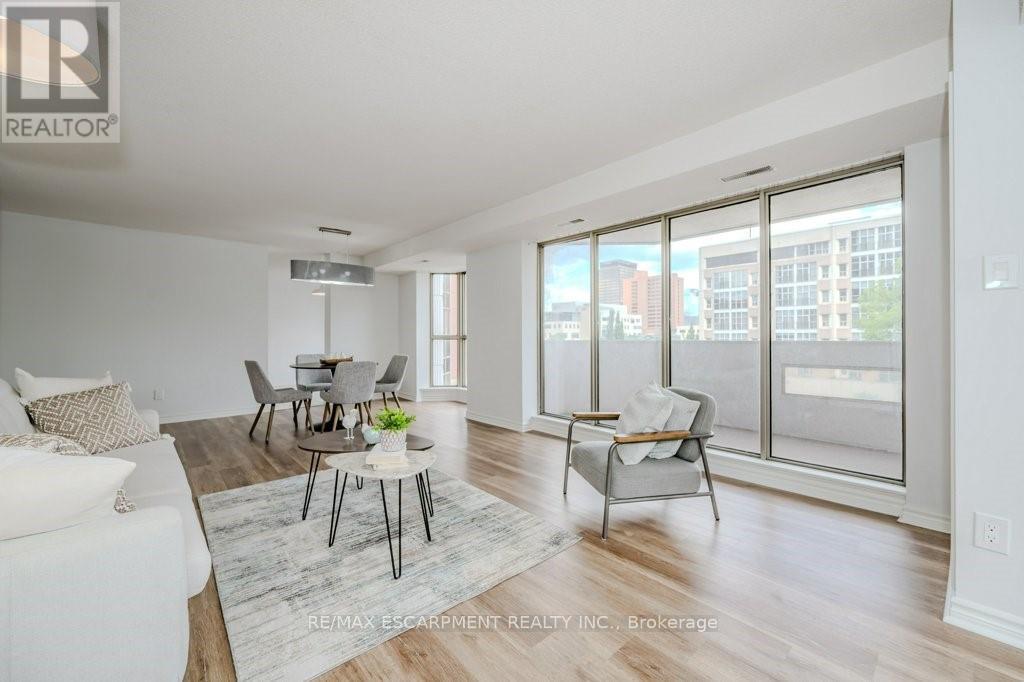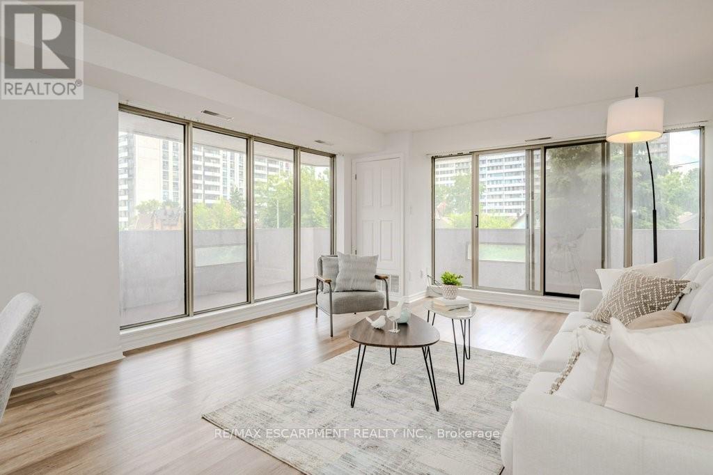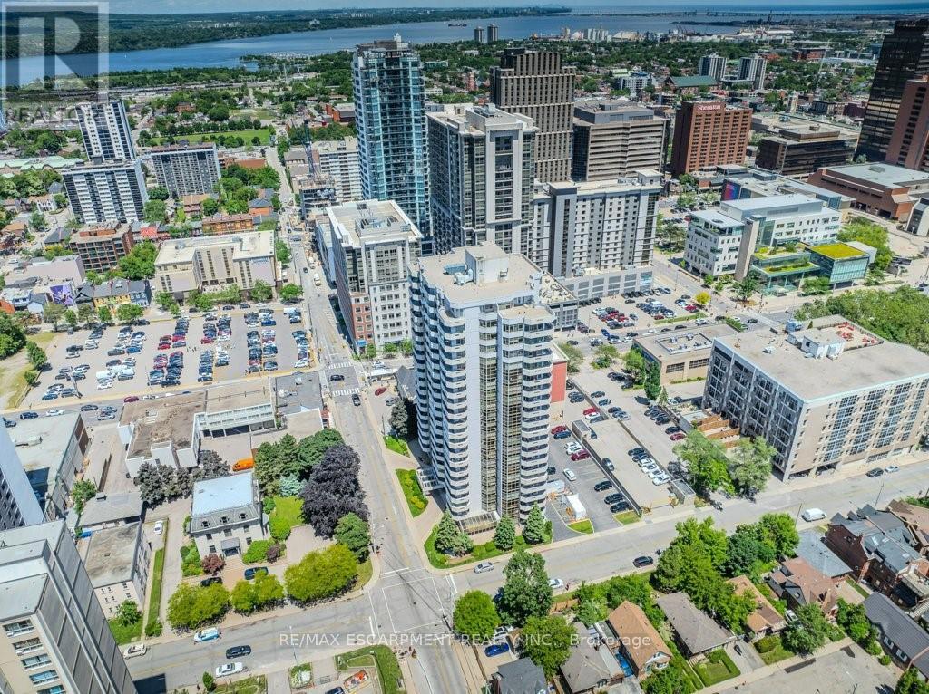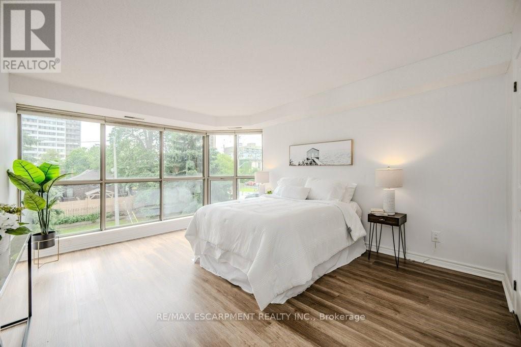 Welcome home to luxury living, Hamilton's Bently building offers prestige and comfort. This unit has a wraparound balcony offering views to the south east and west, open living - dining area, eat in kitchen with new countertops and updated cabinetry. Large bedrooms, walk-in closets, en suite laundry, freshly updated kitchen, flooring and baths. (id:64974)