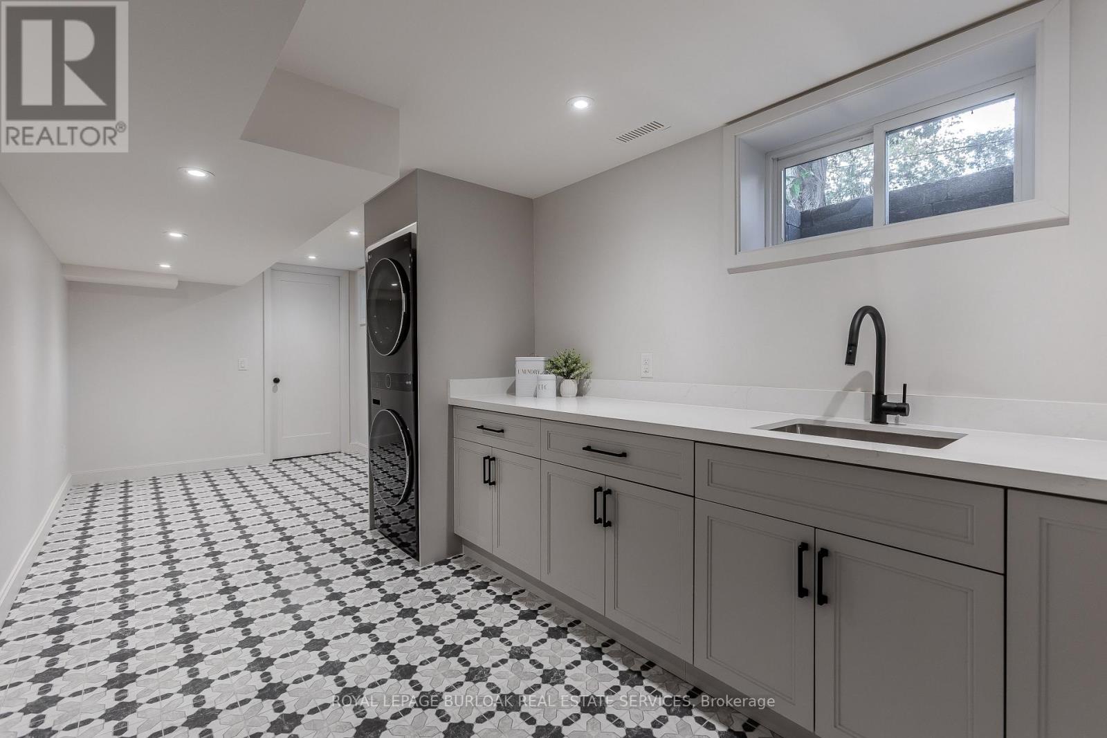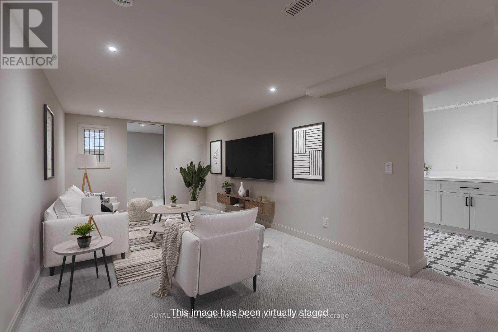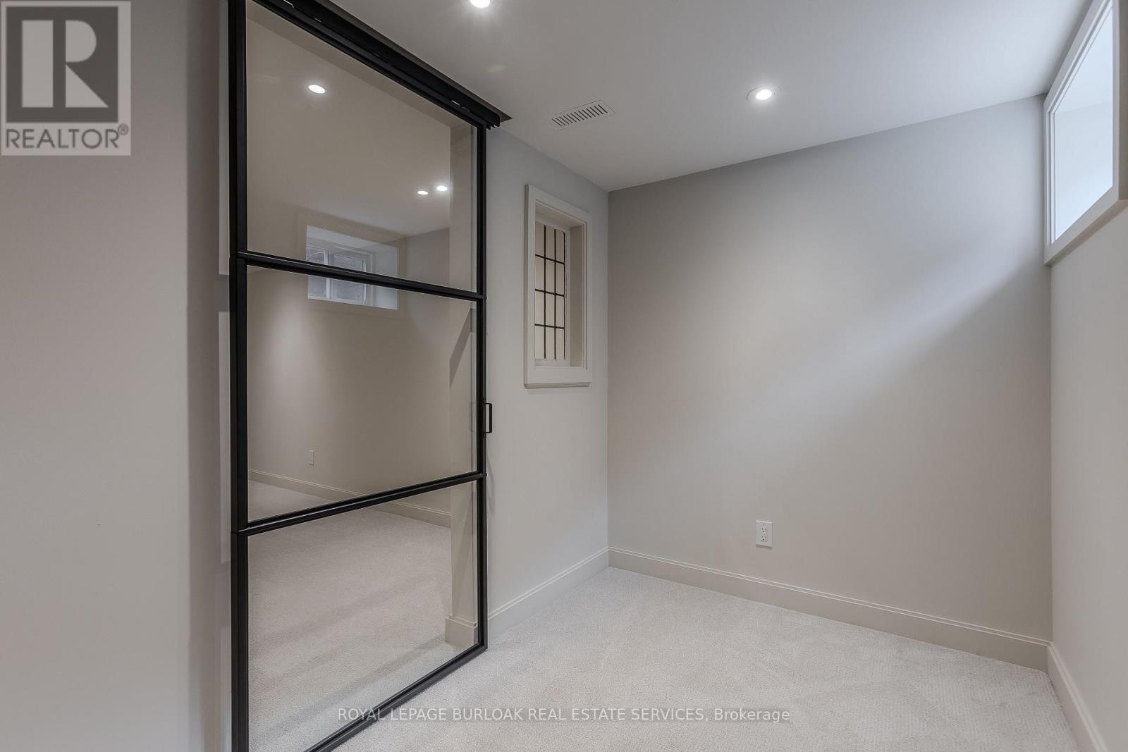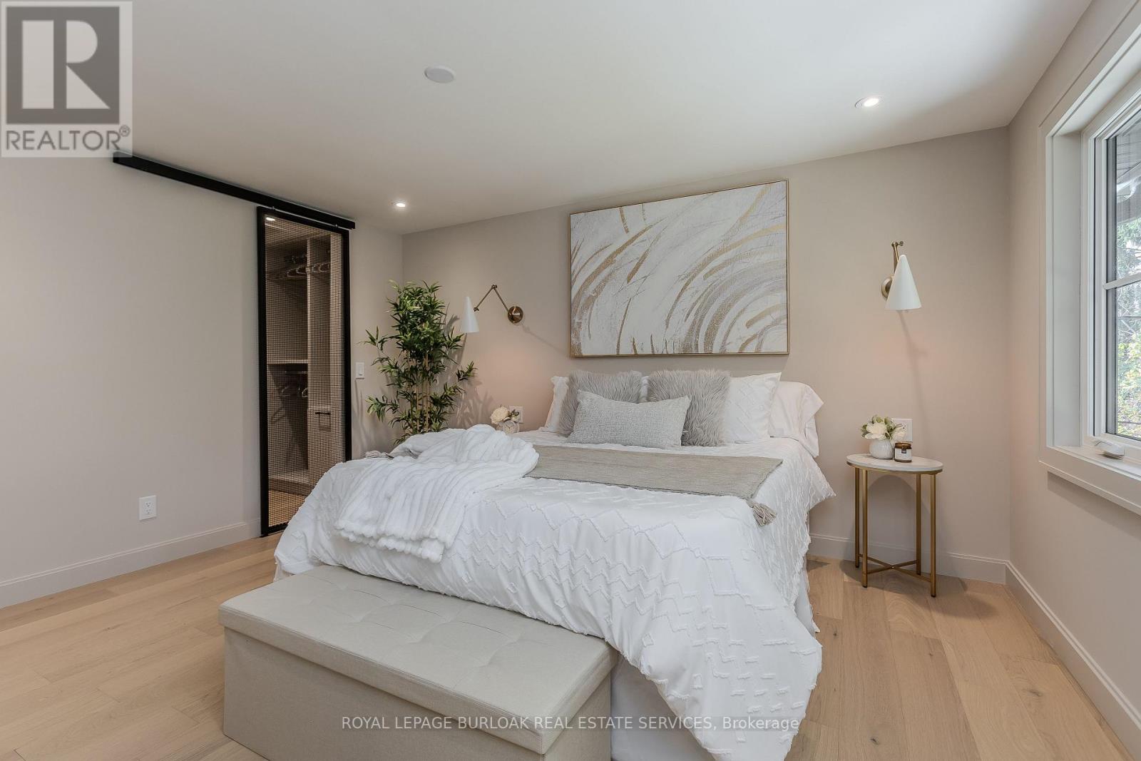Modern luxury meets family-friendly living in this beautifully renovated home in sought-after Dynes. Set on a mature, pool sized lot surrounded by established trees, this property is just minutes from schools, parks, dining, transit, highways, and Burlington's lakefront. Offering 2,177 sq ft of total finished living space, the thoughtfully designed open-concept layout showcases exceptional craftsmanship throughout. From the impressive curb appeal featuring a refinished exterior, fiberglass entry door, and charming cedar-roofed covered porch, to the engineered white oak flooring and abundant LED pot lighting, every detail has been carefully considered. The custom kitchen is a standout with slim shaker cabinetry, quartz countertops with a matching slab backsplash, gold fixtures, pantry storage, appliance garage, and a spacious island with breakfast bar seating. The kitchen flows seamlessly into the dining area, where striking black-framed sliding doors open to a private backyard with a stone patio-perfect for entertaining and summer gatherings. The welcoming living room is highlighted by a modern gas fireplace with a sleek surround and mantle, along with an oversized window that fills the space with natural light. Upstairs, the primary suite offers a peaceful retreat complete with a walk-in closet and a spa-inspired ensuite featuring a freestanding tub with Riobel tub filler, a large glass shower, and a double vanity. Two additional bedrooms and a full bathroom complete the upper level. The finished lower level adds versatile livings pace with a cozy family room, dedicated office area, and an oversized laundry room featuring custom cabinetry and quartz counters. Additional highlights include EV charger rough-in, gas BBQ connection, new Ridley windows, updated HVAC, sump pump, new electrical, and more. All renovations completed with permits. Truly move-in ready. (id:64974)