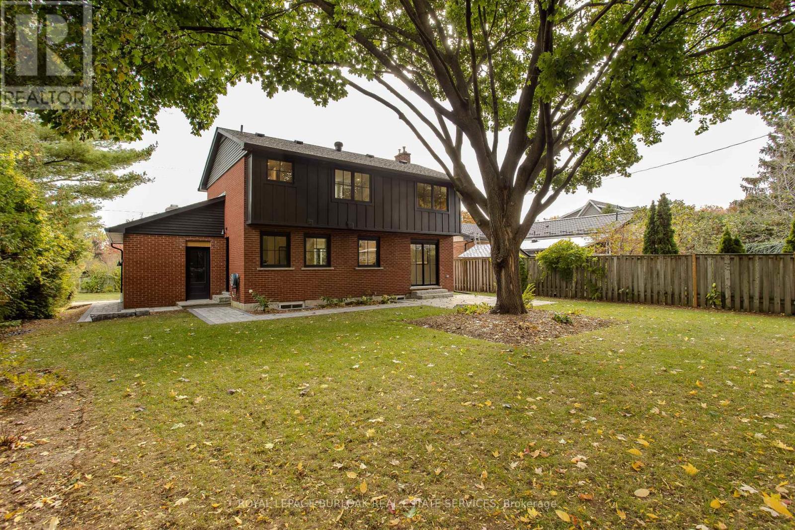 Modern luxury meets family-friendly living in this beautifully renovated home in sought-after Dynes. Set on a mature, pool-sized lot surrounded by established trees, this property is just minutes from schools, parks, dining, transit, highways, and Burlington's lakefront. Offering 2,177 sq ft of total finished living space, the thoughtfully designed open-concept layout showcases exceptional craftsmanship throughout. From the impressive curb appeal featuring a refinished exterior, fibreglass entry door, and charming cedar-roofed covered porch, to the engineered white oak flooring and abundant LED pot lighting, every detail has been carefully considered. The custom kitchen is a standout with slim shaker cabinetry, quartz countertops with a matching slab backsplash, gold fixtures, pantry storage, appliance garage, and a spacious island with breakfast bar seating. The kitchen flows seamlessly into the dining area, where striking black-framed sliding doors open to a private backyard with a stone patio-perfect for entertaining and summer gatherings. The welcoming living room is highlighted by a modern gas fireplace with a sleek surround and mantle, along with an oversized window that fills the space with natural light. Upstairs, the primary suite offers a peaceful retreat complete with a walk-in closet and a spa-inspired ensuite featuring a freestanding tub with Riobel tub filler, a large glass shower, and a double vanity. Two additional bedrooms and a full bathroom complete the upper level. The finished lower level adds versatile living space with a cozy family room, dedicated office area, and an oversized laundry room featuring custom cabinetry and quartz counters. Additional highlights include EV charger rough-in, gas BBQ connection, new Ridley windows, updated HVAC, sump pump, new electrical, and more. All renovations completed with permits. Truly move-in ready. (id:64974)