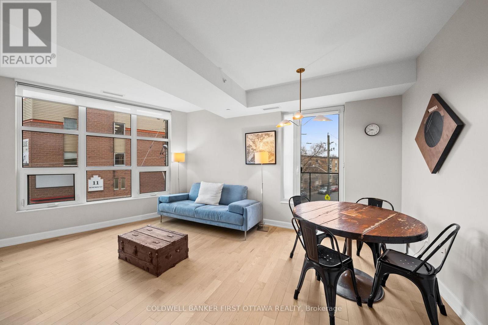 Welcome to The Wellington, a boutique condo nestled in the heart of Hintonburg. Immerse yourself in the vibrant lifestyle of one of Ottawa's most coveted neighbourhoods, where shops, markets & restaurants are just steps away. Mooshu ice cream, Terra 20 and Timmies are IN THE BUILDING! This inviting 2-bed CORNER unit boasts maple hardwood floors, quartz countertops, in-unit laundry, and floor-to-ceiling windows that flood the space with natural light. The primary bedroom, which fits a King bed, features a dual walk-through closet & cheater door leading to the spa-like bath, with more quartz counters and an oversized walk-in glass shower. The second bedroom offers versatility, ideal for a home office and/or guest space. Step out onto the south-facing balcony with your morning coffee or unwind with an evening cocktail, unless of course you would rather head in either direction along Wellington to one of the various restaurants in the area. Complete with an underground parking space and storage locker, this condo is both sleek and functional. You'll also enjoy easy access to the Ottawa River pathways, and proximity to Civic Hospital campus, Mooney's Bay, LRT, and the 417. Come and experience the charm of Hintonburg and the trendy vibe of this condo for yourself! (id:64974)
