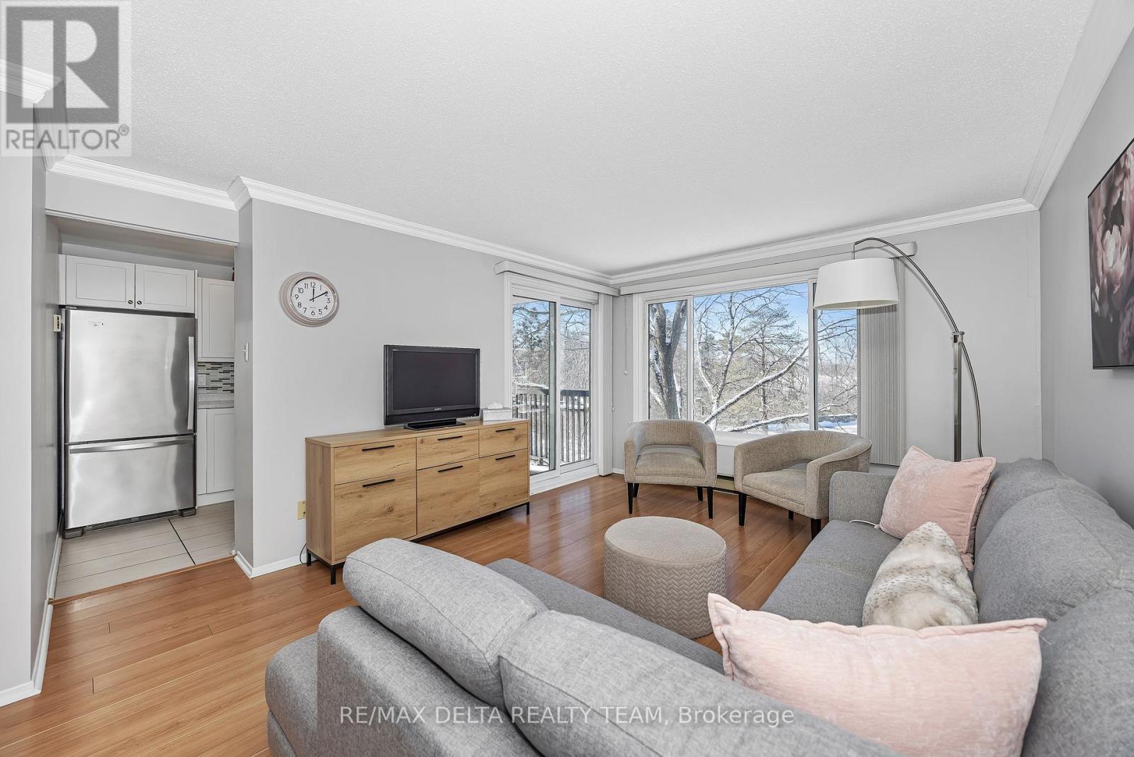 Nestled among mature trees in a peaceful, park-like setting at the rear of the complex, this bright End-Unit condo painted in neutral colors, offers both comfort and convenience. The well-sized foyer features ceramic tile flooring and a large coat closet and a storage closet. A sun-filled living room opens to a private balcony through patio doors, overlooking lush greenery. The thoughtfully designed kitchen showcases stainless steel appliances, a glass ceramic backsplash, white shaker-style cabinetry, and brushed steel hardware. The spacious primary bedroom with extra large window includes a renovated two-piece ensuite, while the updated three-piece main bath features a walk-in shower. The second bedroom is generously sized, and both bedrooms offer closets with built-in organizers. Vinyl laminate flooring runs throughout the unit, and the shared laundry room is conveniently located on the third floor. Ideally situated with easy access to Highway 417, walking trails, the river, shopping, and a wide range of amenities. (id:64974)
