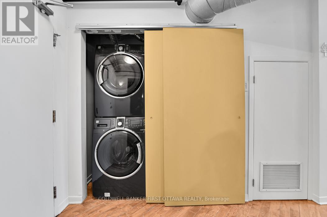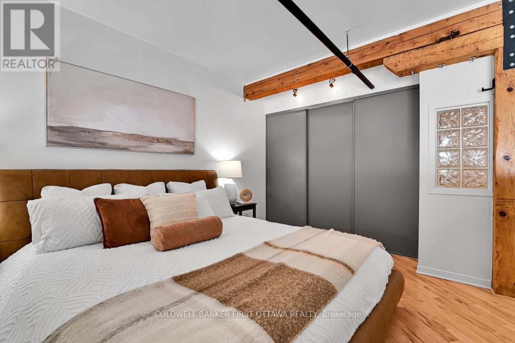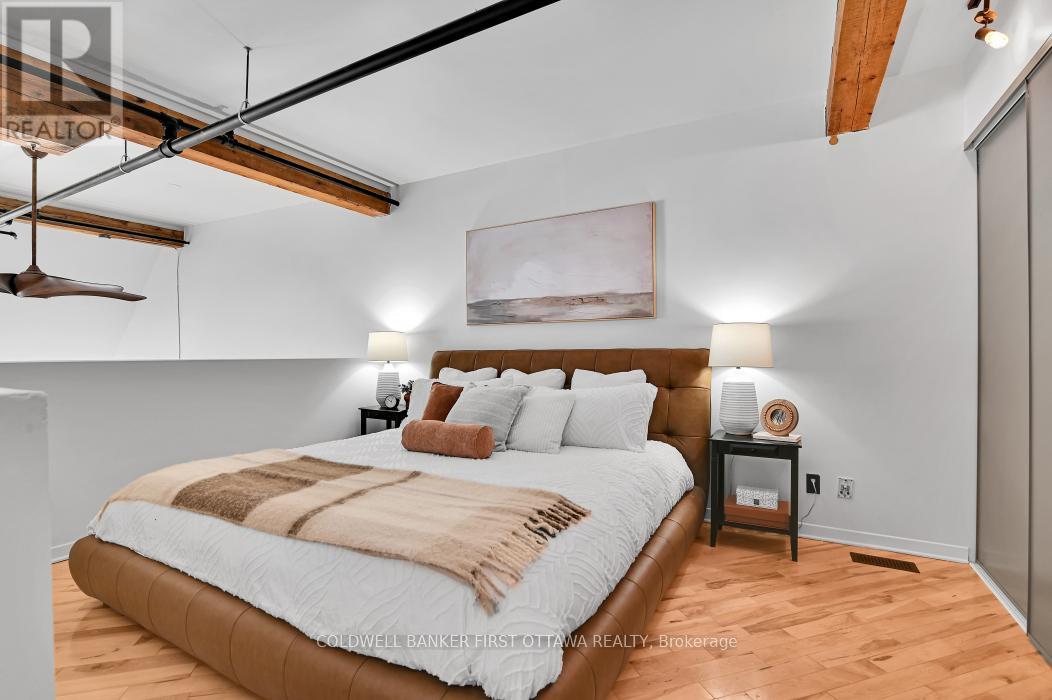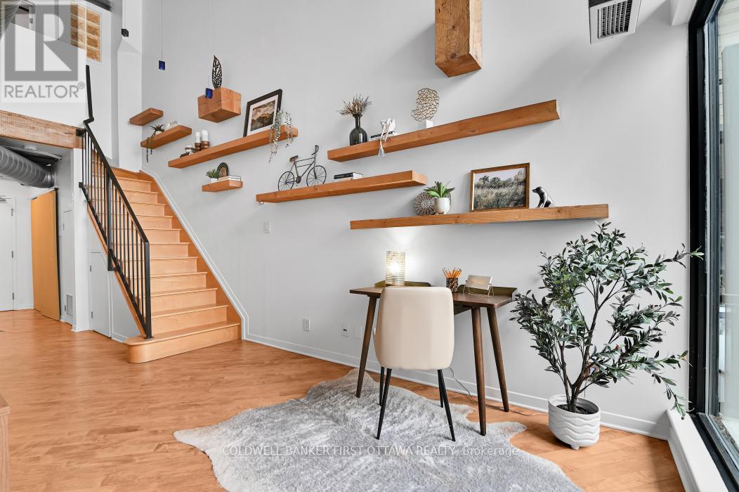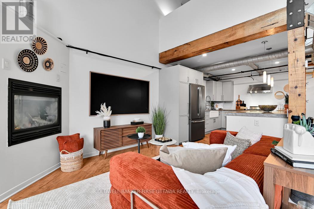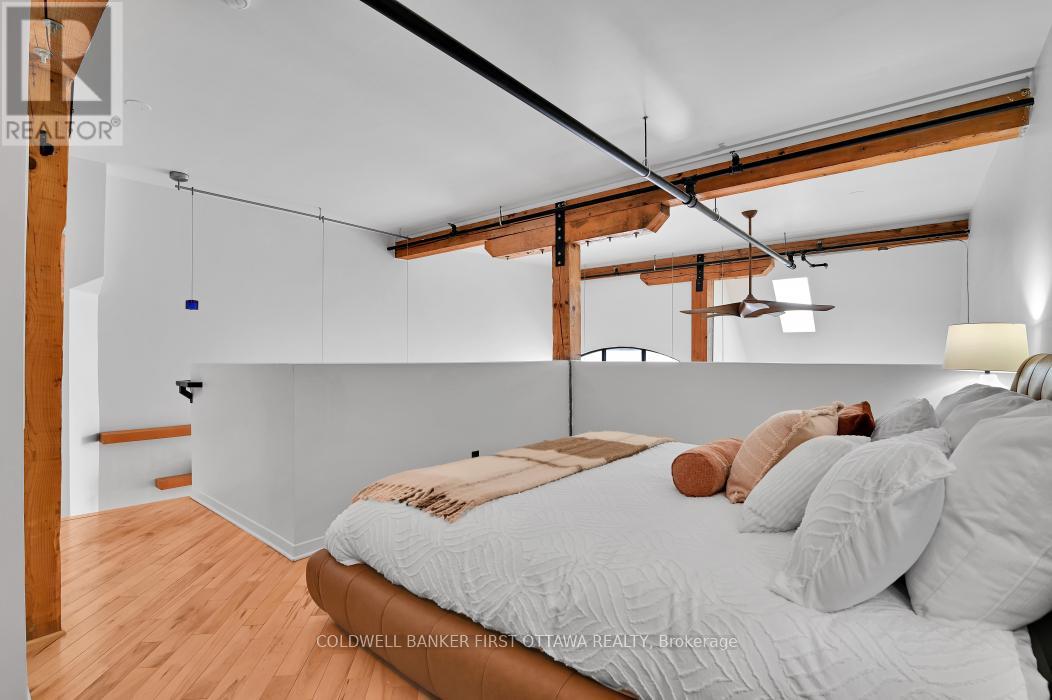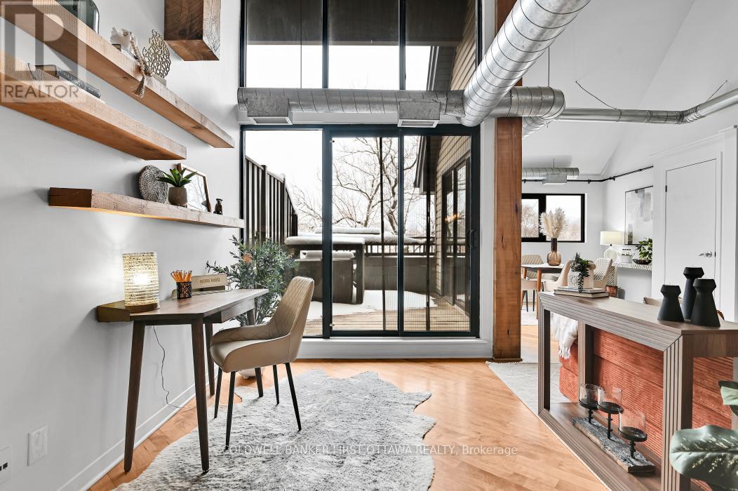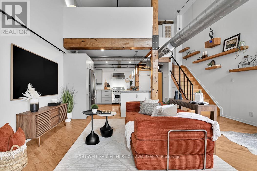 Welcome to Warehouse Lofts, a highly sought-after and truly unique factory conversion in the heart of Little Italy. Located on the top floor, this stunning New York inspired loft offers a rare opportunity to own one of the most distinctive condos in Ottawa. With only 30 units in this boutique buildingthis design-forward residence perfectly blends modern upgrades with the building's authentic industrial character. This spacious 1 bedroom loft condo with soaring ceilings and expansive windows showcasing the building's desirable western exposure with beautiful treetop views. The result is a light-filled space that feels like a private urban retreat tucked above the city. Original architectural details take centre stage, including visible ductwork, and authentic post-and-beam timber construction, celebrating the building's warehouse heritage. The fully renovated designer kitchen is a standout feature, anchored by a custom-built concrete island, carefully selected to complement the loft's industrial aesthetic and high-end appliances. Elegant brass accents, and abundant workspace make this kitchen ideal for both everyday living and entertaining. A versatile den/dining area provides flexible space for a home office or intimate dining area, while the private balcony overlooking green space and the nearby bike path is perfect for urban gardening and outdoor dining with a gas BBQ hookup. Additional highlights include hardwood flooring throughout the main and upper level, underground locker, and access to a secure bike room. Major mechanical updates-including the furnace, air conditioning, and owned on-demand hot water system-were all replaced in 2021. Step outside and you're just moments from Little Italy's vibrant restaurants, cafés, and nightlife, with easy walking access to Dow's Lake, scenic cycling paths, and some of Ottawa's most desirable neighbourhoods. A rare and remarkable loft offering the perfect blend of historic charm, modern design, and unbeatable urban living. (id:64974)