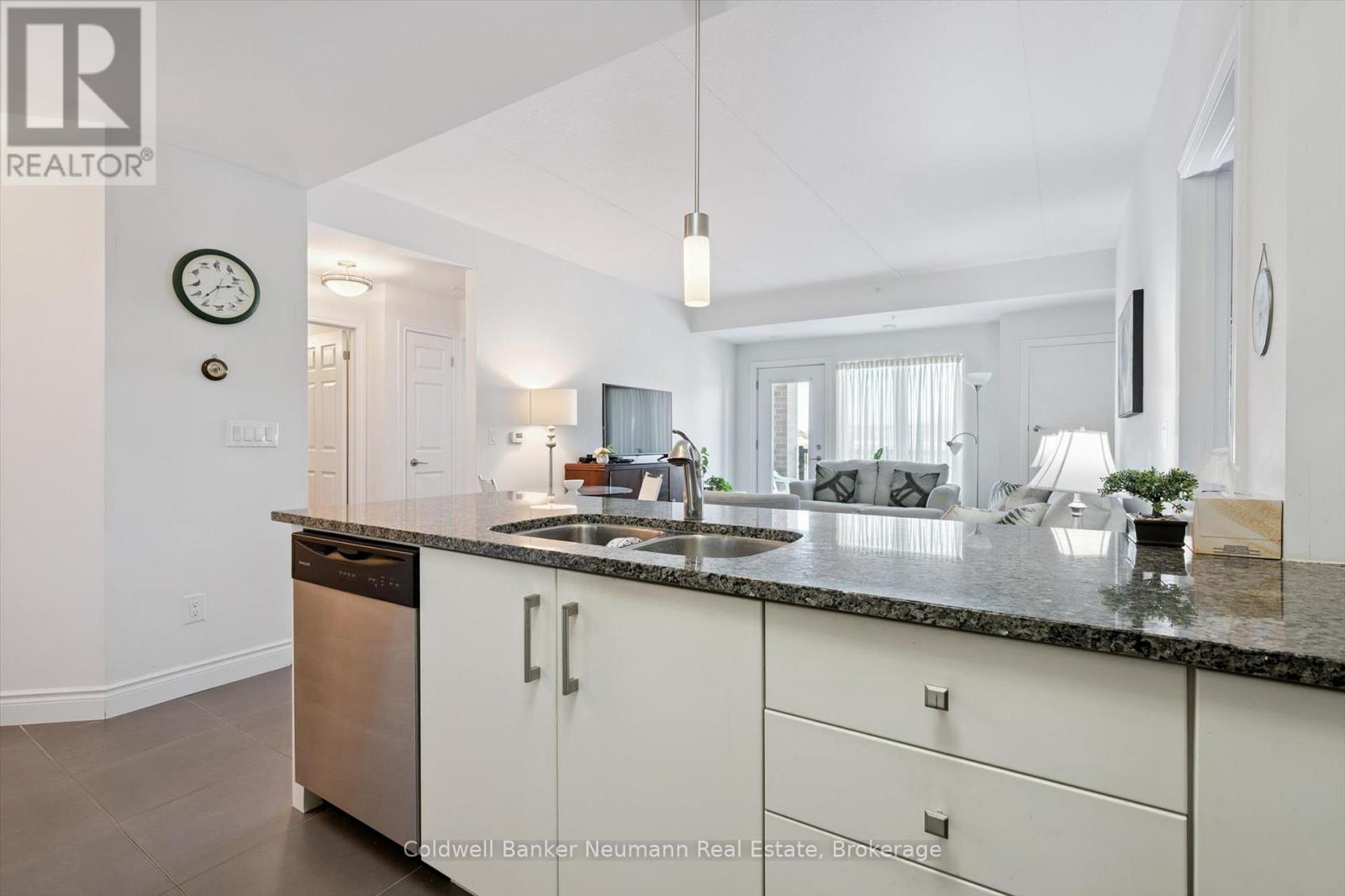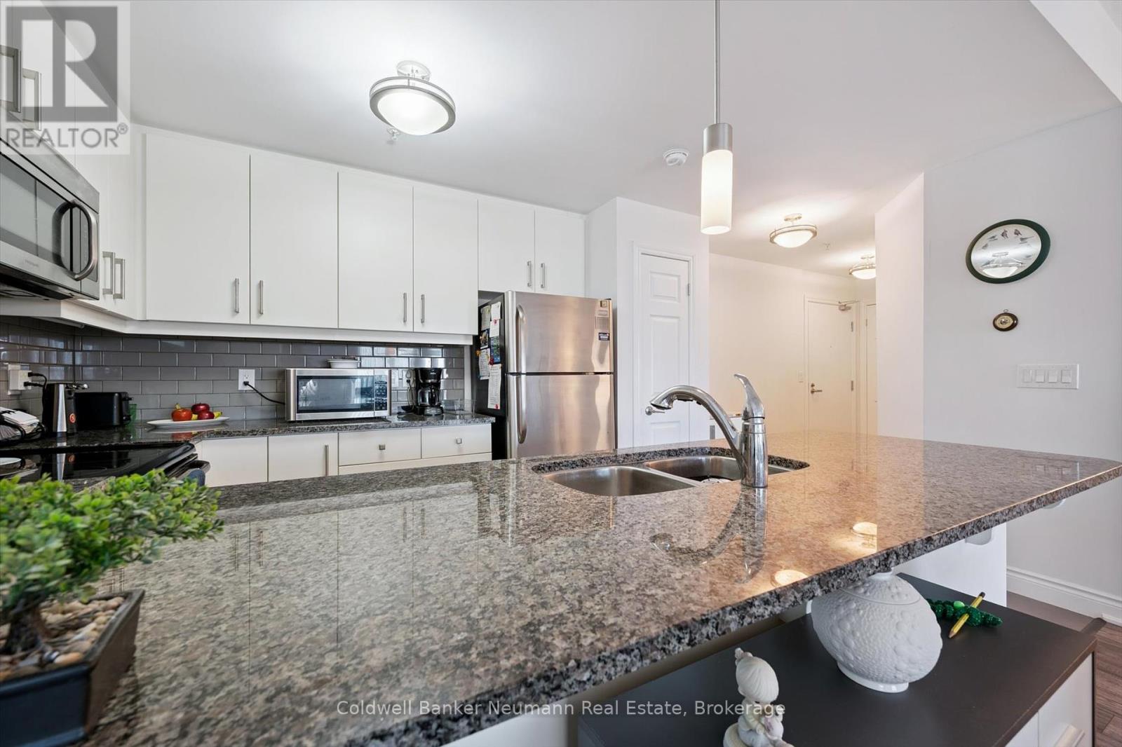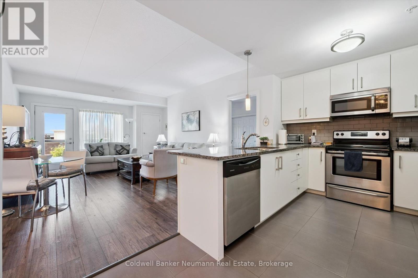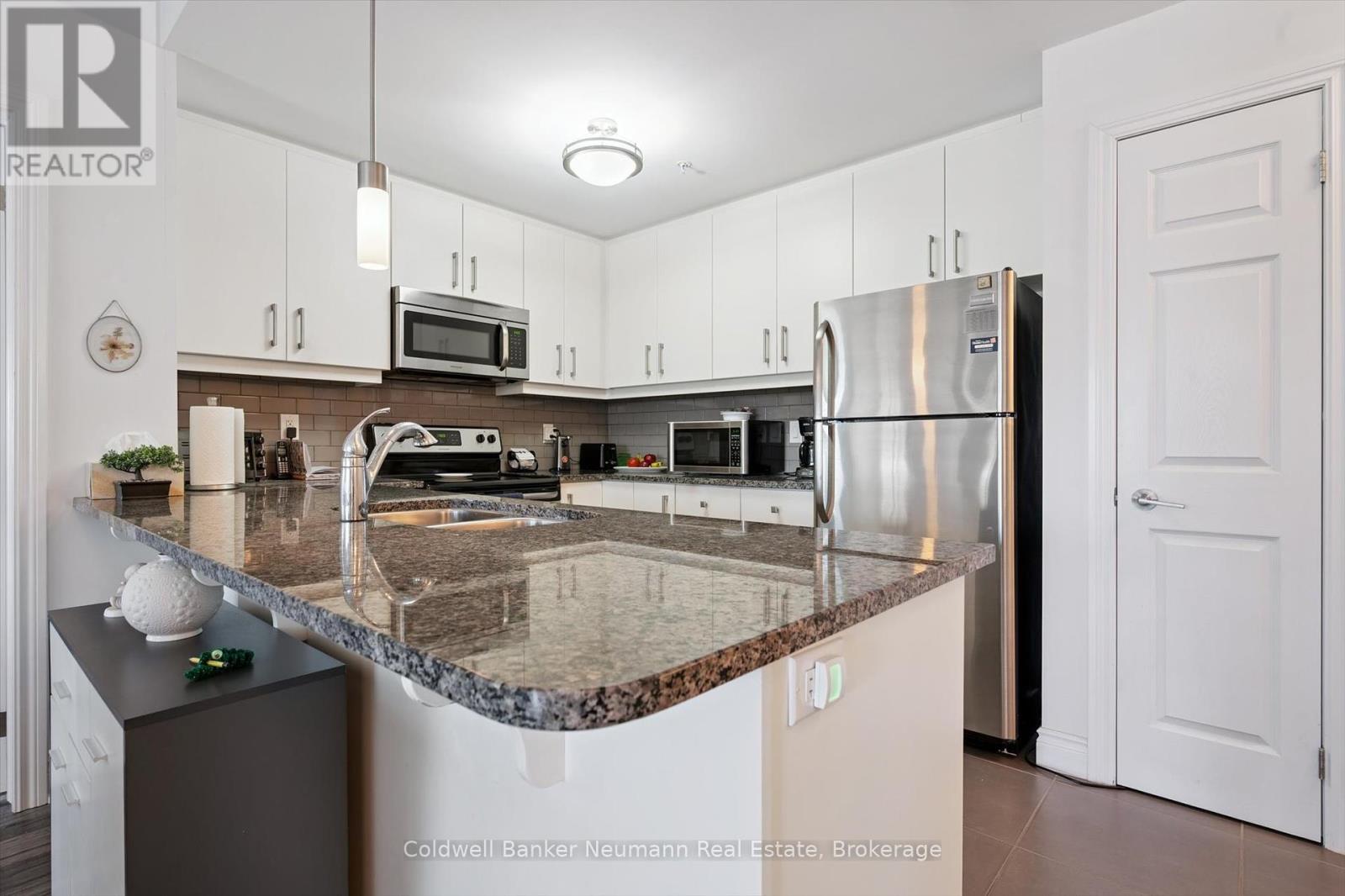 Discover stylish, maintenance-free living in this spacious and sun-filled 2-bedroom, 2-bathroom condo in Guelphs sought-after South End. Perfectly suited for first-time buyers, downsizers, or investors, this open-concept suite offers modern finishes and smart design in a well-managed, secure building.The open-concept living and dining area is filled with natural light thanks to oversized windows and 9-foot ceilings. The white kitchen features a granite countertop with breakfast bar, subway tile backsplash, and stainless steel appliances, creating a clean and functional space for everyday living.The primary bedroom includes a private 3-piece ensuite, while the second bedroom is ideal for guests, a home office, or shared accommodation. Additional highlights include in-suite laundry, engineered hardwood flooring, and one secure underground parking space. Ground floor entry adds extra convenience for daily access.Residents of this well-managed building enjoy access to excellent amenities including a full fitness facility, party room, rooftop terrace, and ample visitor parking. Located just minutes from the 401, restaurants, grocery stores, banks, and more, everything you need is close by. (id:64974)