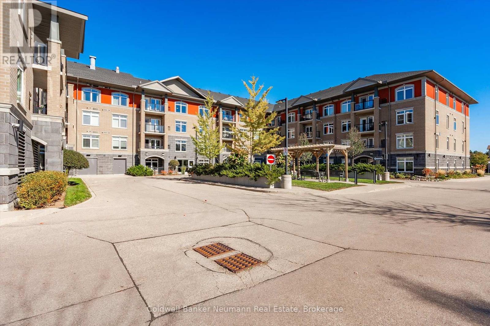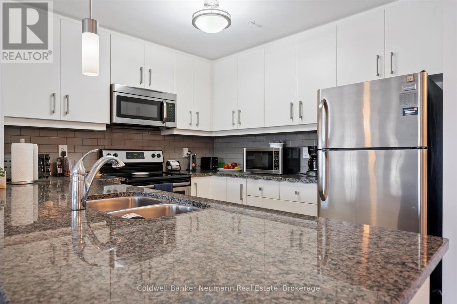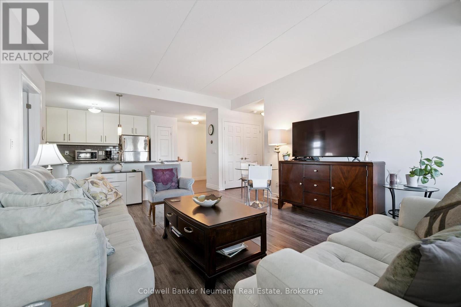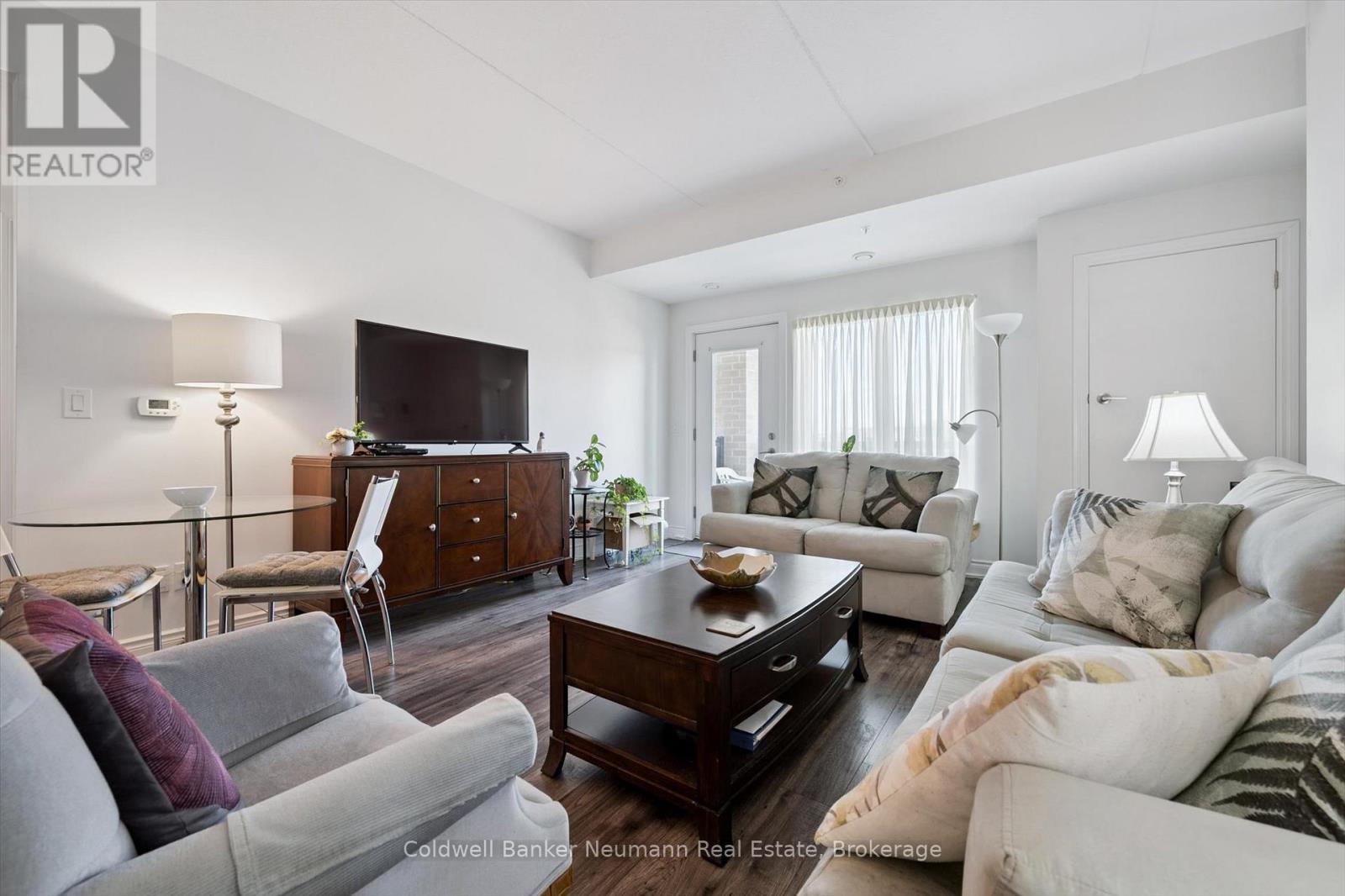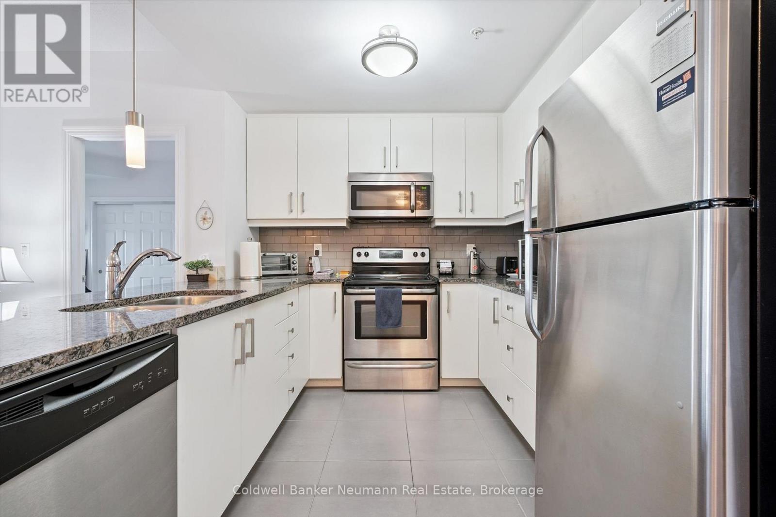 Discover stylish, maintenance-free living in this spacious and sun-filled 2-bedroom, 2-bathroom condo in Guelphs sought-after South End. Perfectly suited for first-time buyers, downsizers, or investors, this open-concept suite offers modern finishes and smart design in a well-managed, secure building.The open-concept living and dining area is filled with natural light thanks to oversized windows and 9-foot ceilings. The white kitchen features a granite countertop with breakfast bar, subway tile backsplash, and stainless steel appliances, creating a clean and functional space for everyday living.The primary bedroom includes a private 3-piece ensuite, while the second bedroom is ideal for guests, a home office, or shared accommodation. Additional highlights include in-suite laundry, engineered hardwood flooring, and one secure underground parking space. Ground floor entry adds extra convenience for daily access.Residents of this well-managed building enjoy access to excellent amenities including a full fitness facility, party room, rooftop terrace, and ample visitor parking. Located just minutes from the 401, restaurants, grocery stores, banks, and more, everything you need is close by. (id:64974)