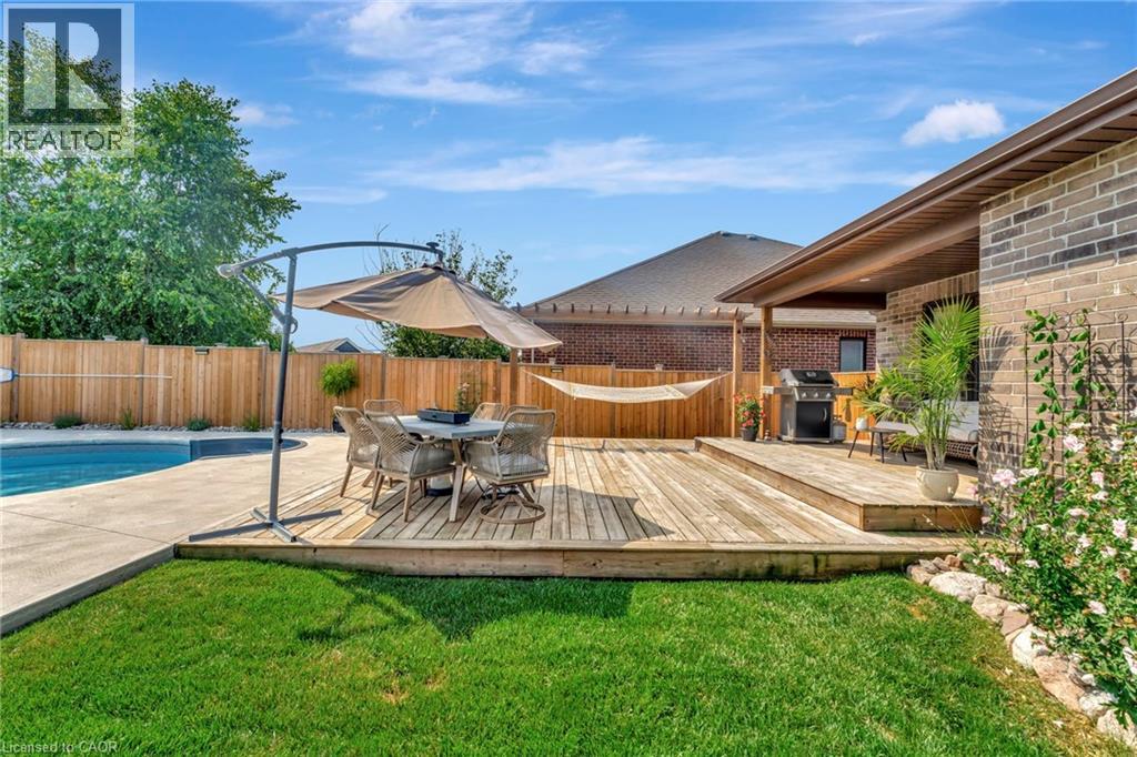 Welcome to this beautifully maintained 2+1 bedroom, 2 bathroom brick bungalow in Delhi, Ontario — offering stylish finishes, functional living space, and your own backyard oasis. Step inside to a welcoming foyer that leads to a bright front bedroom and convenient 4-piece bathroom — perfect for guests or a home office. The open-concept living room is warm and inviting, anchored by a stunning stone fireplace that creates the perfect focal point for relaxing or entertaining. The gorgeous quartz kitchen features rich dark wood cabinetry, a breakfast bar with pendant lighting, and a dedicated dining area with sliding doors leading to your outdoor patio. Just off the kitchen, the spacious primary bedroom retreat offers a luxurious 5-piece ensuite. Main floor laundry adds everyday convenience. Downstairs, the partially finished basement provides a large recreation room and an additional bedroom — ideal for guests, teens, or extended family— plus a bathroom rough-in offering the opportunity to easily add a third full bathroom. Step outside and experience your own private paradise. The expansive wood deck with a built-in hammock extends your living space, while the exposed concrete with stamped edging adds a polished touch. Enjoy summers by the beautiful heated 16x32 South Coast inground pool, all maintained effortlessly with a 4-zone Rain Bird irrigation system. This home blends comfort, style, and outdoor luxury — a true standout in Delhi. (id:64974)
