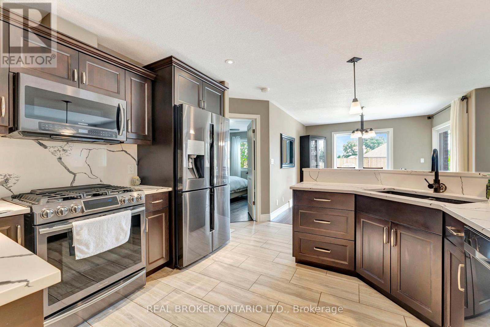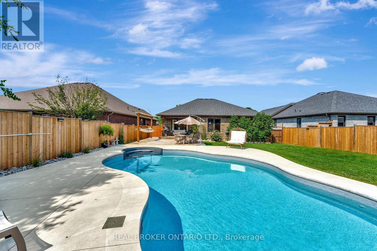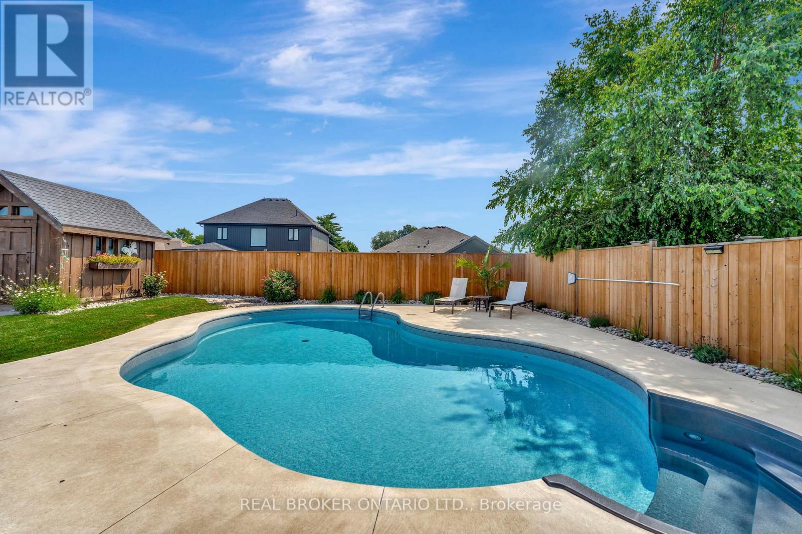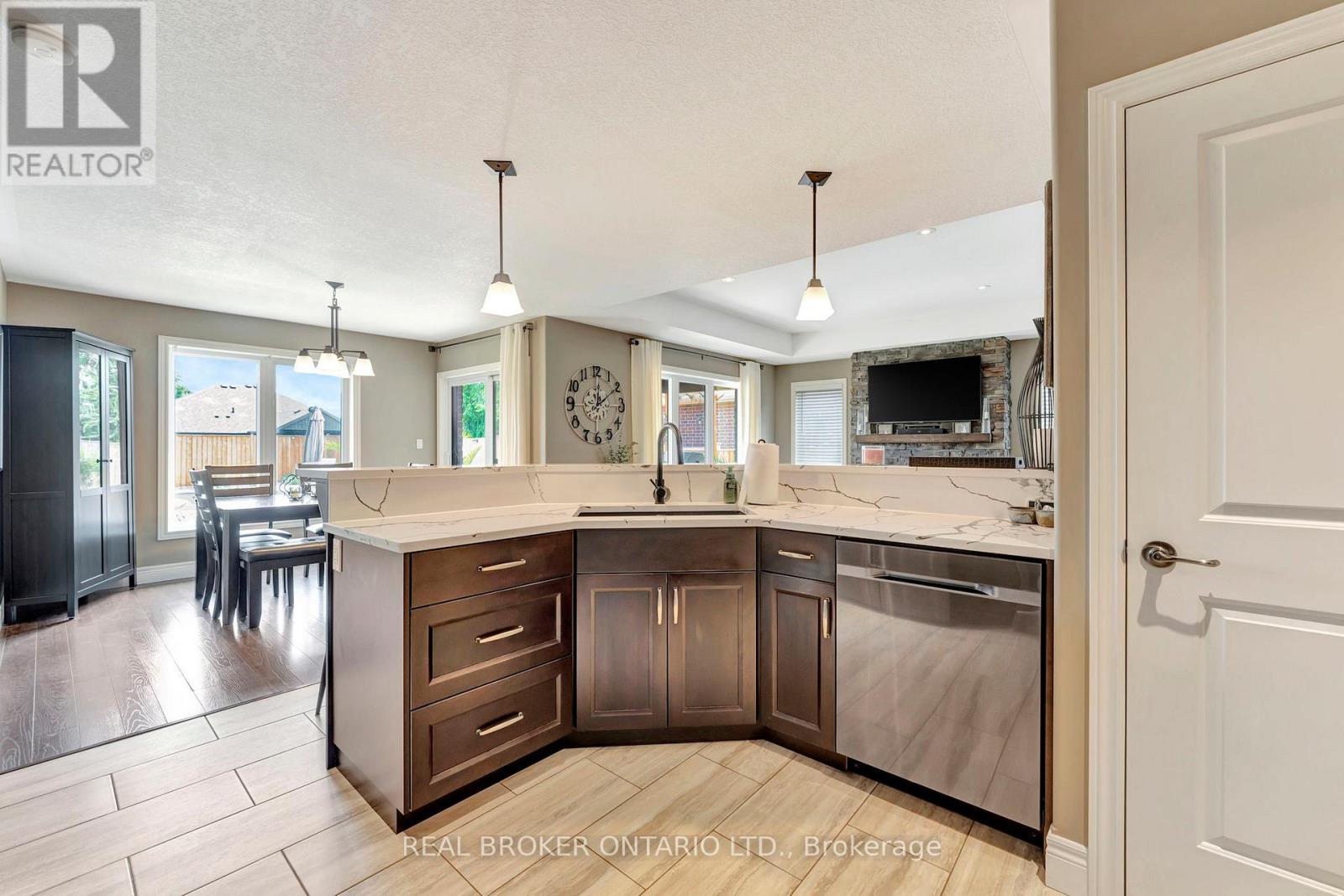 Welcome to this beautifully maintained 2+1 bedroom, 2 bathroom brick bungalow in Delhi, Ontario - offering stylish finishes, functional living space, and your own backyard oasis. Step inside to a welcoming foyer that leads to a bright front bedroom and convenient 4-piece bathroom - perfect for guests or a home office. The open-concept living room is warm and inviting, anchored by a stunning stone fireplace that creates the perfect focal point for relaxing or entertaining. The gorgeous quartz kitchen features rich dark wood cabinetry, a breakfast bar with pendant lighting, and a dedicated dining area with sliding doors leading to your outdoor patio. Just off the kitchen, the spacious primary bedroom retreat offers a luxurious 5-piece ensuite. Main floor laundry adds everyday convenience. Downstairs, the partially finished basement provides a large recreation room and an additional bedroom - ideal for guests, teens, or extended family- plus a bathroom rough-in offering the opportunity to easily add a third full bathroom. Step outside and experience your own private paradise. The expansive wood deck with a built-in hammock extends your living space, while the exposed concrete with stamped edging adds a polished touch. Enjoy summers by the beautiful heated 16x32 South Coast inground pool, all maintained effortlessly with a 4-zone Rain Bird irrigation system. This home blends comfort, style, and outdoor luxury - a true standout in Delhi. (id:64974)