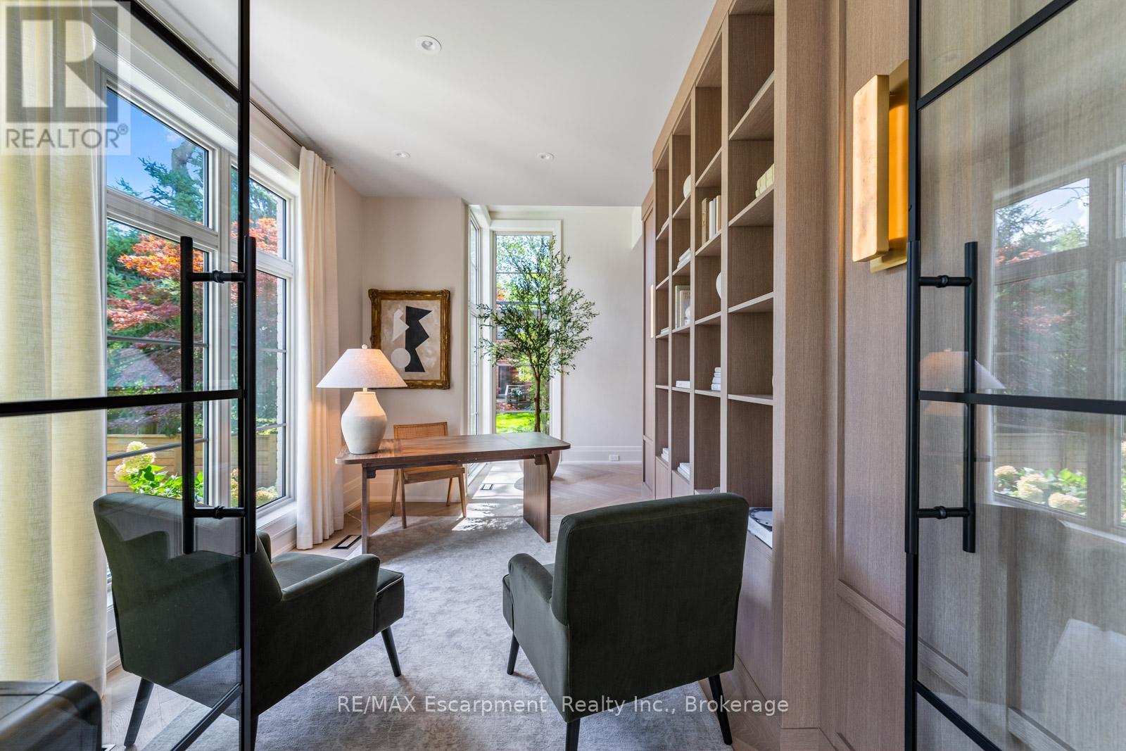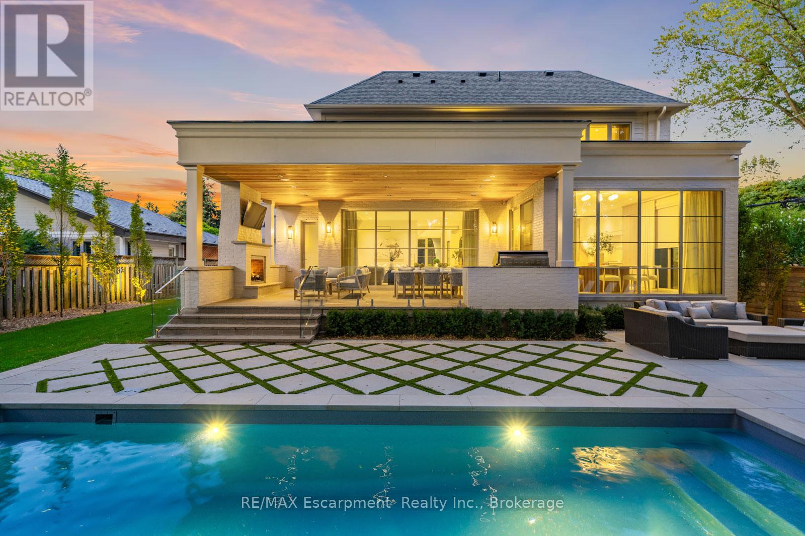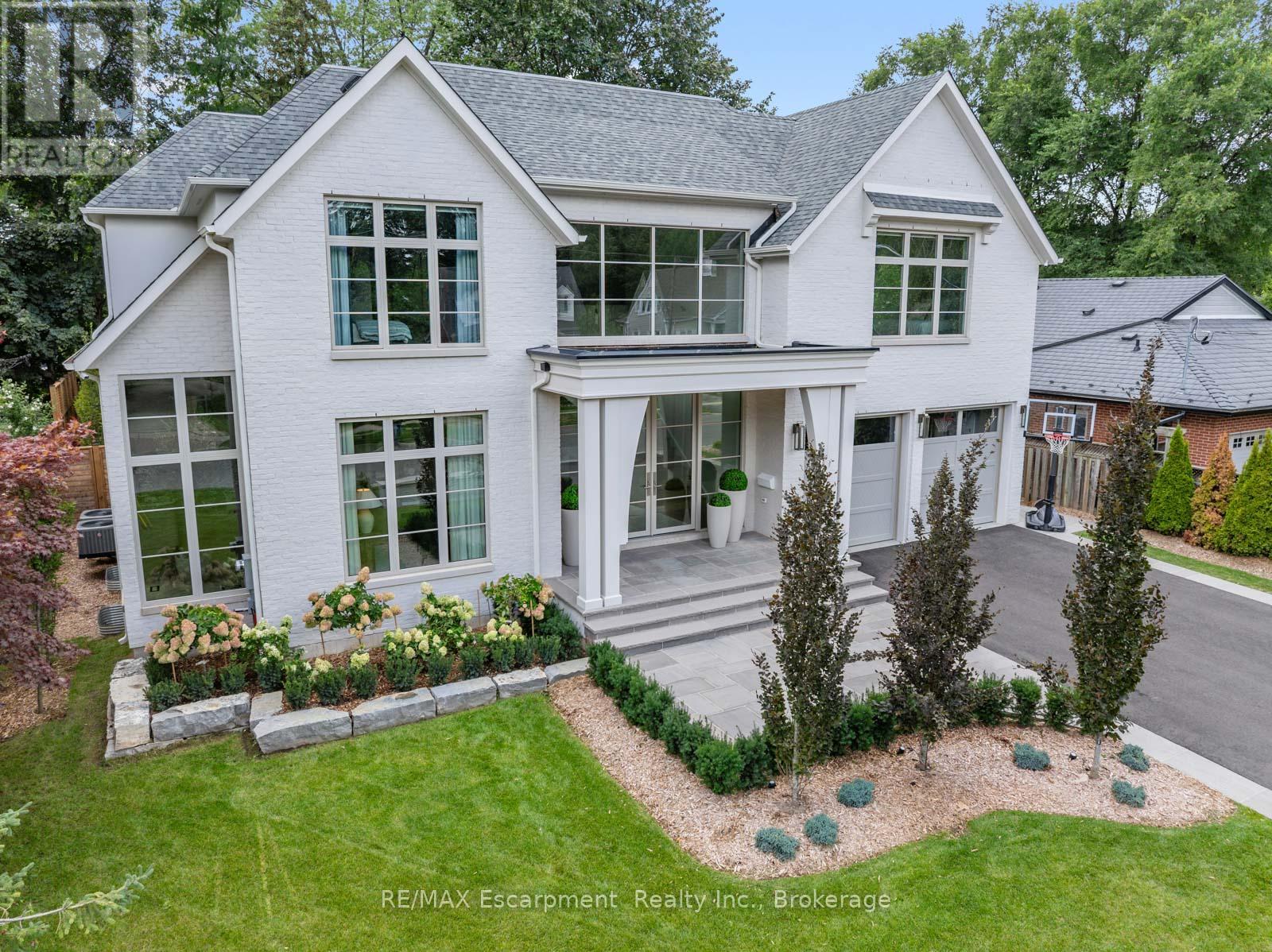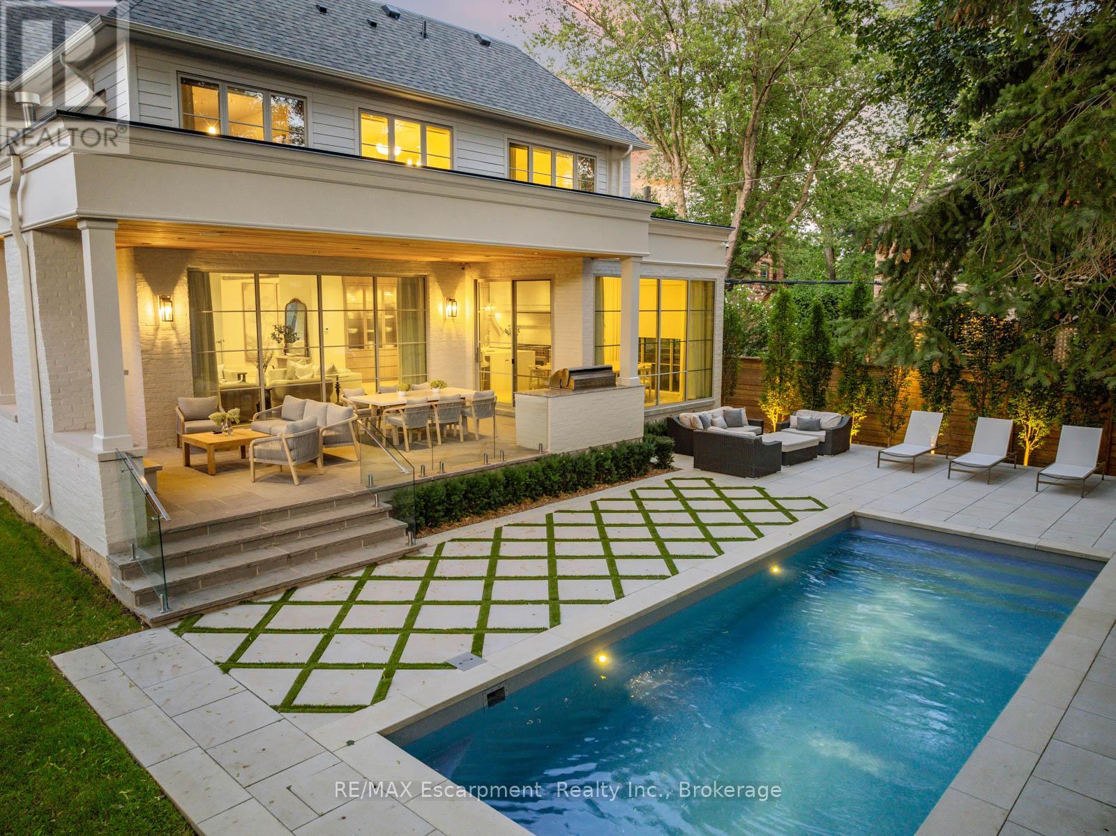 Welcome to 304 Pomona Avenue, a truly magnificent newly built home in Burlington's highly coveted Roseland community. Step inside and you're greeted by an incredible hand-carved plaster staircase rising through all three levels that's perfectly paired with rift-cut white oak herringbone floors that set an elevated tone. A formal dining room makes a statement with decorative ceiling beams, a glass wine display, and a marble wet bar. The private library draws you in, finished with oak panelled walls and a reading nook with floor-to-ceiling corner windows that flood the room with natural light. The living room completes the main level's gathering spaces with its plaster fireplace, oak shelving with integrated lighting, and full in-ceiling speakers. At the heart of the home, the kitchen offers a large custom plaster hood, oversized waterfall island, porcelain counters, and top-tier appliances including a 60" Wolf double oven, Sub-Zero fridge and freezer, and Bosch dishwasher. Pantry storage with reeded glass cabinetry and a walk-through servery extends the workspace. Just beyond, the breakfast area opens to a beautiful and serene covered terrace with a built-in BBQ, outdoor fridge, fireplace, and cedar-lined ceiling-overlooking the saltwater pool and landscaped gardens. Upstairs, four bedrooms each include private ensuites. The primary suite features a spacious walk-in closet and a spa-like bath with dual vanities, soaker tub, heated floors, and oversized shower. A full laundry room with custom cabinetry completes this level. The lower level expands the living space with a second kitchen, home theatre, gym, fifth bedroom, full bath, and radiant heated floors. Outside, stone patios, mature landscaping, irrigation, and a hydrangea wall create a welcoming backdrop. With 4+1 bedrooms, 7 bathrooms, and over 6,000 sq. ft. of living space, this Roseland residence combines thoughtful design with everyday comfort. Move in and enjoy! Luxury Certified. (id:64974)