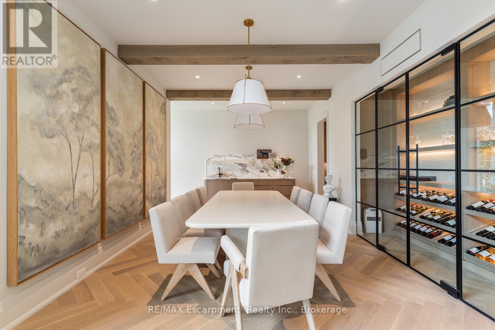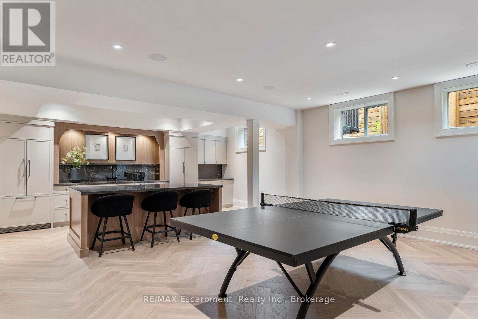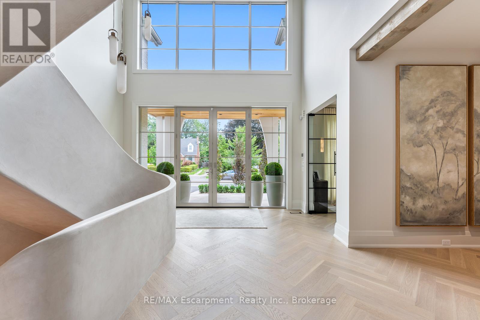 Welcome to 304 Pomona Avenue, a truly magnificent newly built home in Burlington's highly coveted Roseland community. Step inside and you're greeted by an incredible hand-carved plaster staircase rising through all three levels that's perfectly paired with rift-cut white oak herringbone floors that set an elevated tone. A formal dining room makes a statement with decorative ceiling beams, a glass wine display, and a marble wet bar. The private library draws you in, finished with oak panelled walls and a reading nook with floor-to-ceiling corner windows that flood the room with natural light. The living room completes the main level's gathering spaces with its plaster fireplace, oak shelving with integrated lighting, and full in-ceiling speakers. At the heart of the home, the kitchen offers a large custom plaster hood, oversized waterfall island, porcelain counters, and top-tier appliances including a 60" Wolf double oven, Sub-Zero fridge and freezer, and Bosch dishwasher. Pantry storage with reeded glass cabinetry and a walk-through servery extends the workspace. Just beyond, the breakfast area opens to a beautiful and serene covered terrace with a built-in BBQ, outdoor fridge, fireplace, and cedar-lined ceiling-overlooking the saltwater pool and landscaped gardens. Upstairs, four bedrooms each include private ensuites. The primary suite features a spacious walk-in closet and a spa-like bath with dual vanities, soaker tub, heated floors, and oversized shower. A full laundry room with custom cabinetry completes this level. The lower level expands the living space with a second kitchen, home theatre, gym, fifth bedroom, full bath, and radiant heated floors. Outside, stone patios, mature landscaping, irrigation, and a hydrangea wall create a welcoming backdrop. With 4+1 bedrooms, 7 bathrooms, and over 6,000 sq. ft. of living space, this Roseland residence combines thoughtful design with everyday comfort. Move in and enjoy! Luxury Certified. (id:64974)