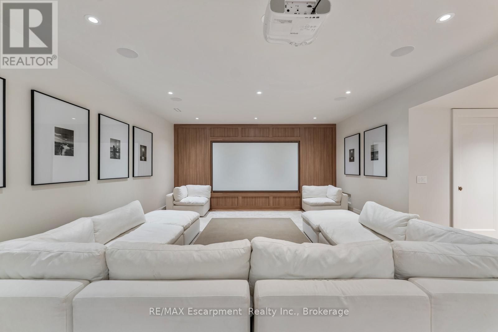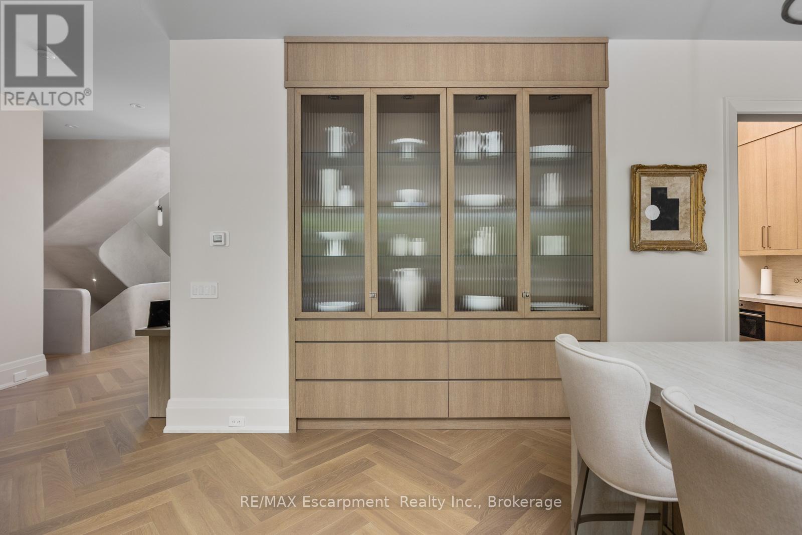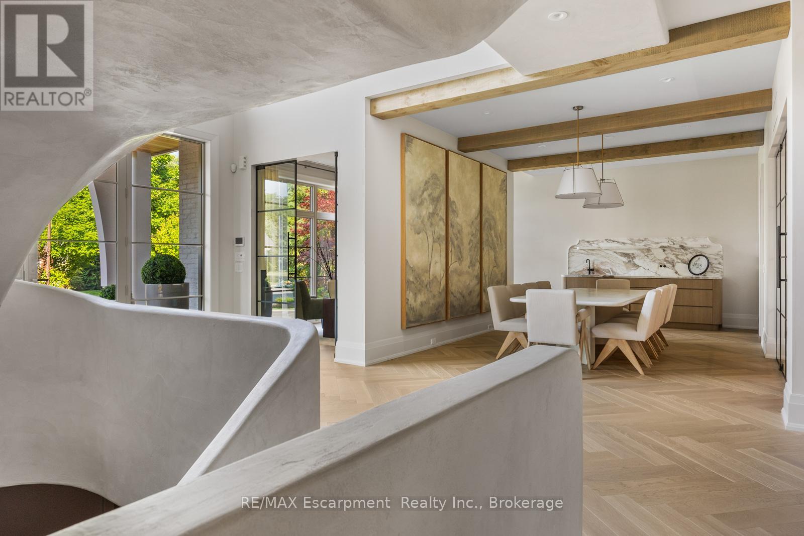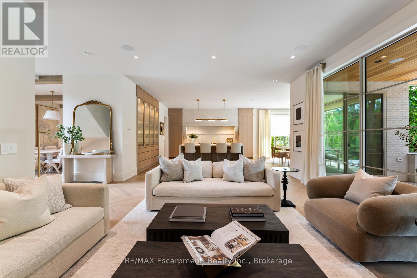 Welcome to 304 Pomona Avenue, a truly magnificent newly built home in Burlington's highly coveted Roseland community. Step inside and you're greeted by an incredible hand-carved plaster staircase rising through all three levels that's perfectly paired with rift-cut white oak herringbone floors that set an elevated tone. A formal dining room makes a statement with decorative ceiling beams, a glass wine display, and a marble wet bar. The private library draws you in, finished with oak panelled walls and a reading nook with floor-to-ceiling corner windows that flood the room with natural light. The living room completes the main level's gathering spaces with its plaster fireplace, oak shelving with integrated lighting, and full in-ceiling speakers. At the heart of the home, the kitchen offers a large custom plaster hood, oversized waterfall island, porcelain counters, and top-tier appliances including a 60" Wolf double oven, Sub-Zero fridge and freezer, and Bosch dishwasher. Pantry storage with reeded glass cabinetry and a walk-through servery extends the workspace. Just beyond, the breakfast area opens to a beautiful and serene covered terrace with a built-in BBQ, outdoor fridge, fireplace, and cedar-lined ceiling-overlooking the saltwater pool and landscaped gardens. Upstairs, four bedrooms each include private ensuites. The primary suite features a spacious walk-in closet and a spa-like bath with dual vanities, soaker tub, heated floors, and oversized shower. A full laundry room with custom cabinetry completes this level. The lower level expands the living space with a second kitchen, home theatre, gym, fifth bedroom, full bath, and radiant heated floors. Outside, stone patios, mature landscaping, irrigation, and a hydrangea wall create a welcoming backdrop. With 4+1 bedrooms, 7 bathrooms, and over 6,000 sq. ft. of living space, this Roseland residence combines thoughtful design with everyday comfort. Move in and enjoy! Luxury Certified. (id:64974)