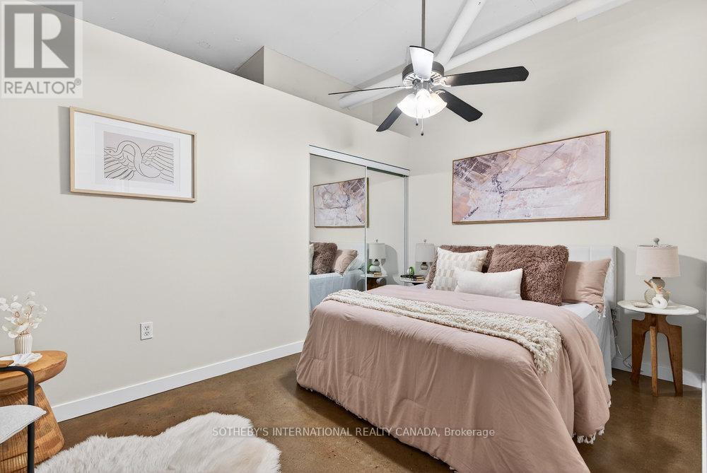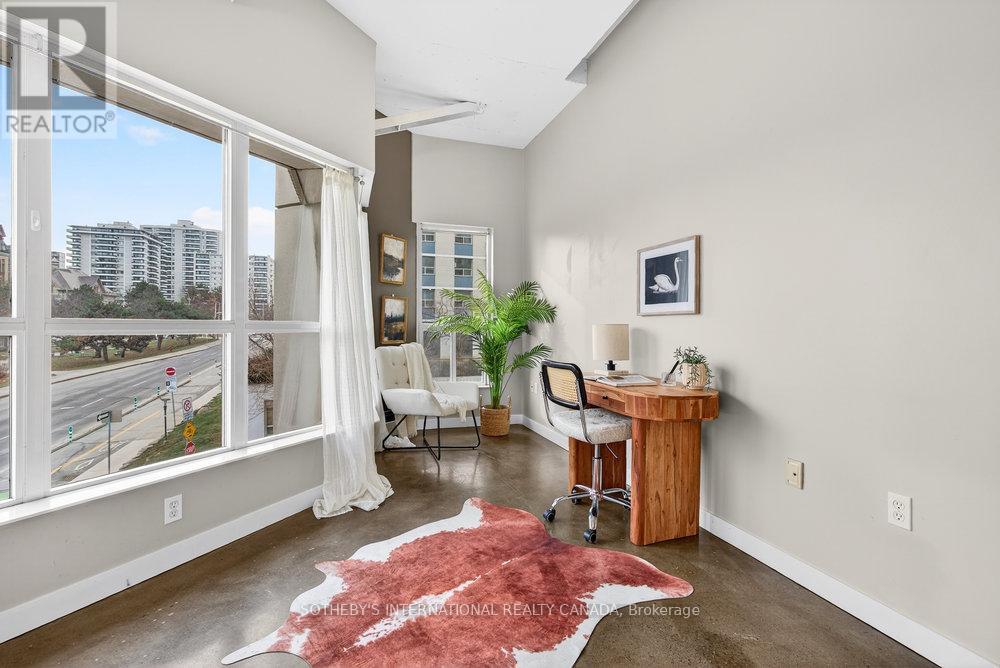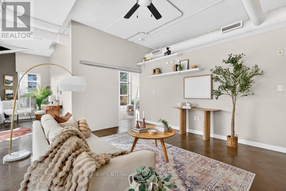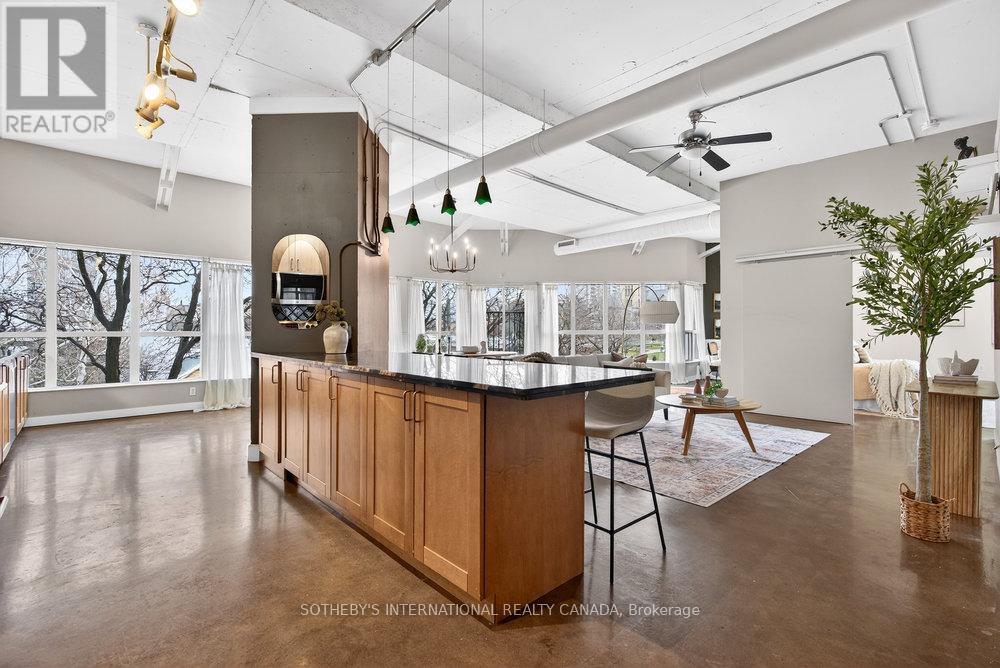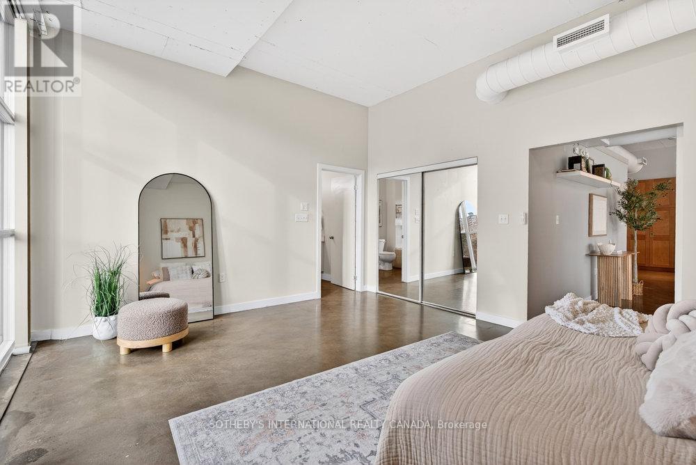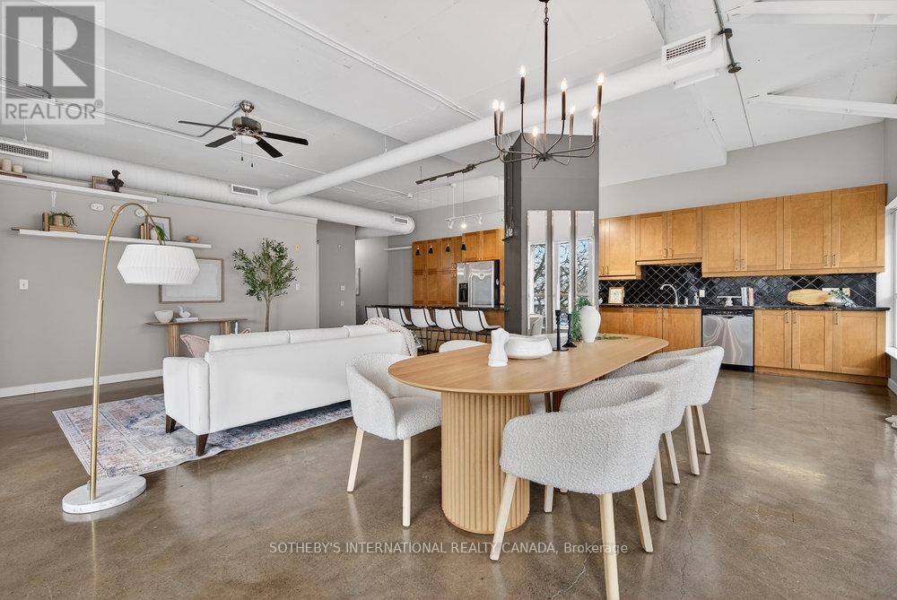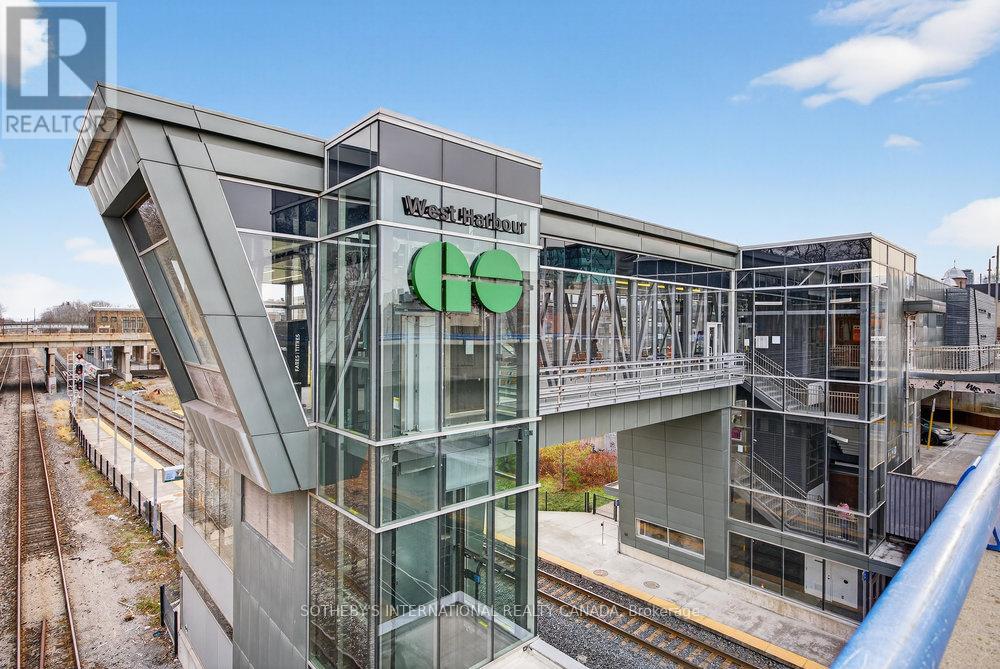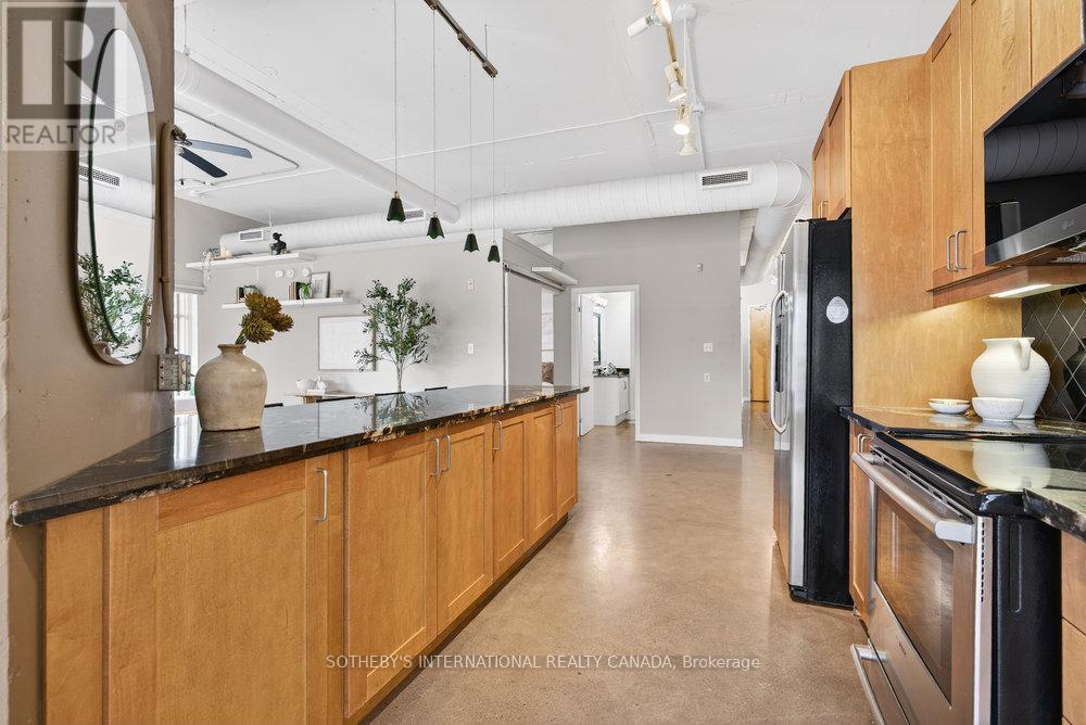 An exceptional corner loft at the sought-after Core Lofts, offering almost 1,700 sq. ft. of bright, open-concept living in the heart of downtown Hamilton. This 2-bedroom, 2-bathroom residence features 10+ ft ceilings, walls of glass, and beautiful morning sun that fills the space with natural light. The spacious kitchen is appointed with oak cabinetry and granite countertops, flowing seamlessly into expansive living and dining areas ideal for both everyday living and entertaining. The primary suite includes a spa-inspired ensuite with jacuzzi tub and oversized shower. In addition to two bedrooms, the layout includes a separate den-style alcove off the main living area, offering flexible use as a home office or sitting area. The second bedroom is interior and does not include an exterior window. Beautifully presented with a bright, clean feel throughout, this home offers effortless condo living well suited to professionals, with in-suite laundry, underground parking, and locker, in a secure, well-managed building with a fitness centre, rooftop terrace, and party room. Condo fees include heat and water, adding to the ease and convenience of day-to-day living. Enjoy a truly walkable lifestyle just steps from the newly opened TD Coliseum, along with downtown restaurants and cafés, the Art Gallery of Hamilton, Central Library, Farmers' Market, waterfront trails, GO Transit, and the vibrant communities of Locke Street South and James Street North. Convenient access to St. Joseph's Healthcare Hamilton, David Braley Health Sciences Centre, and major transit corridors makes commuting and downtown connectivity seamless. A rare opportunity to own a true loft-style corner residence offering space, light, and an effortless urban lifestyle. (id:64974)