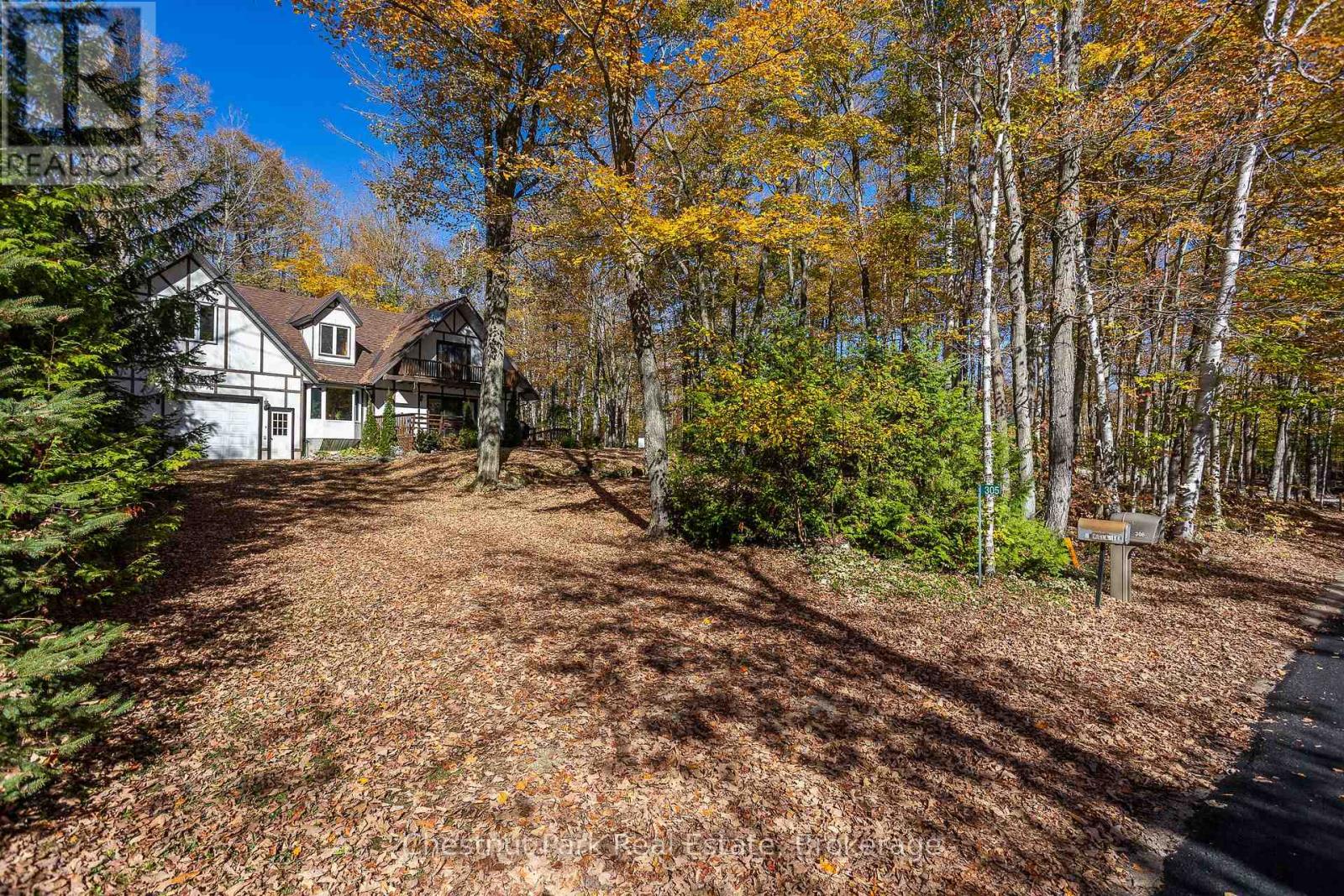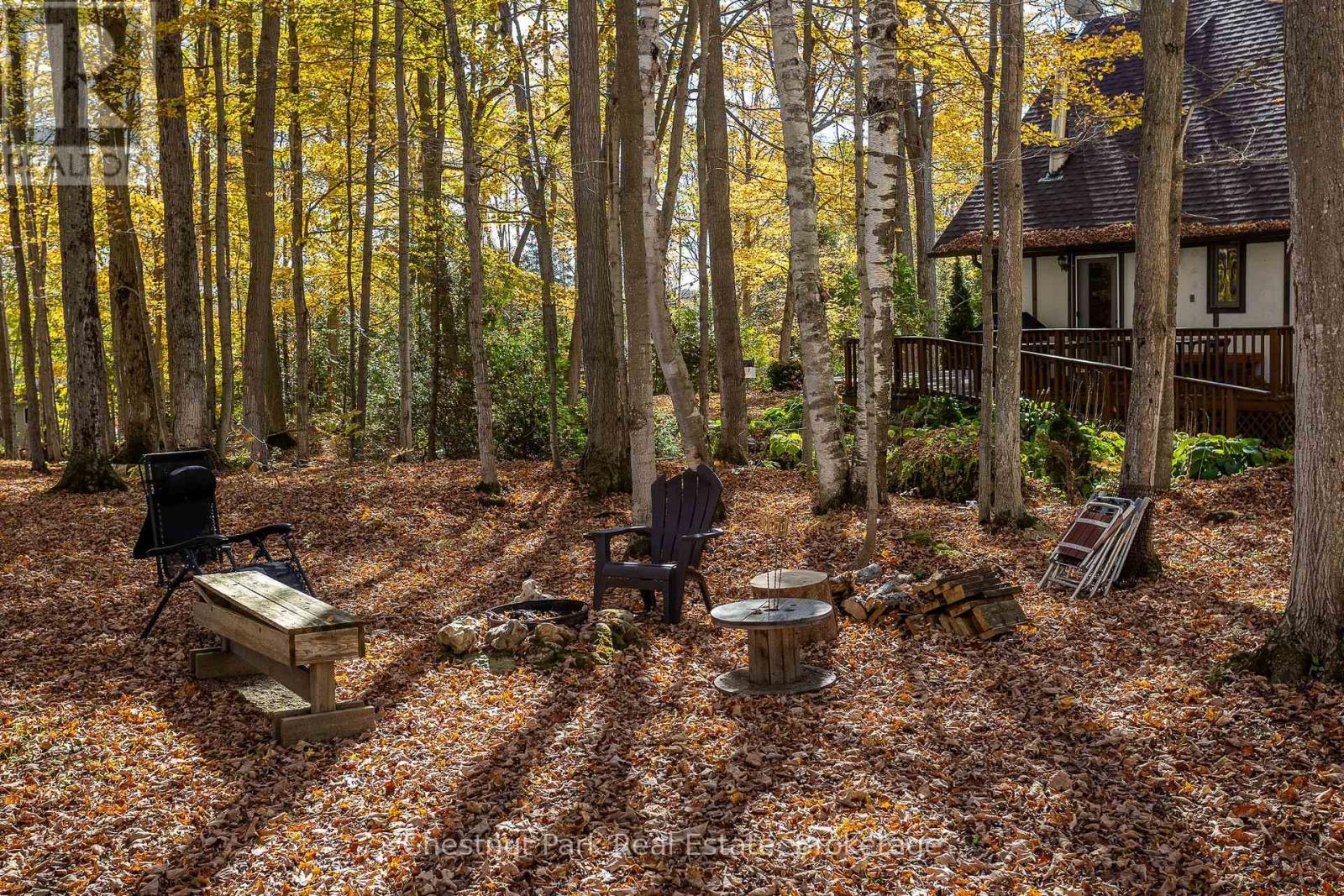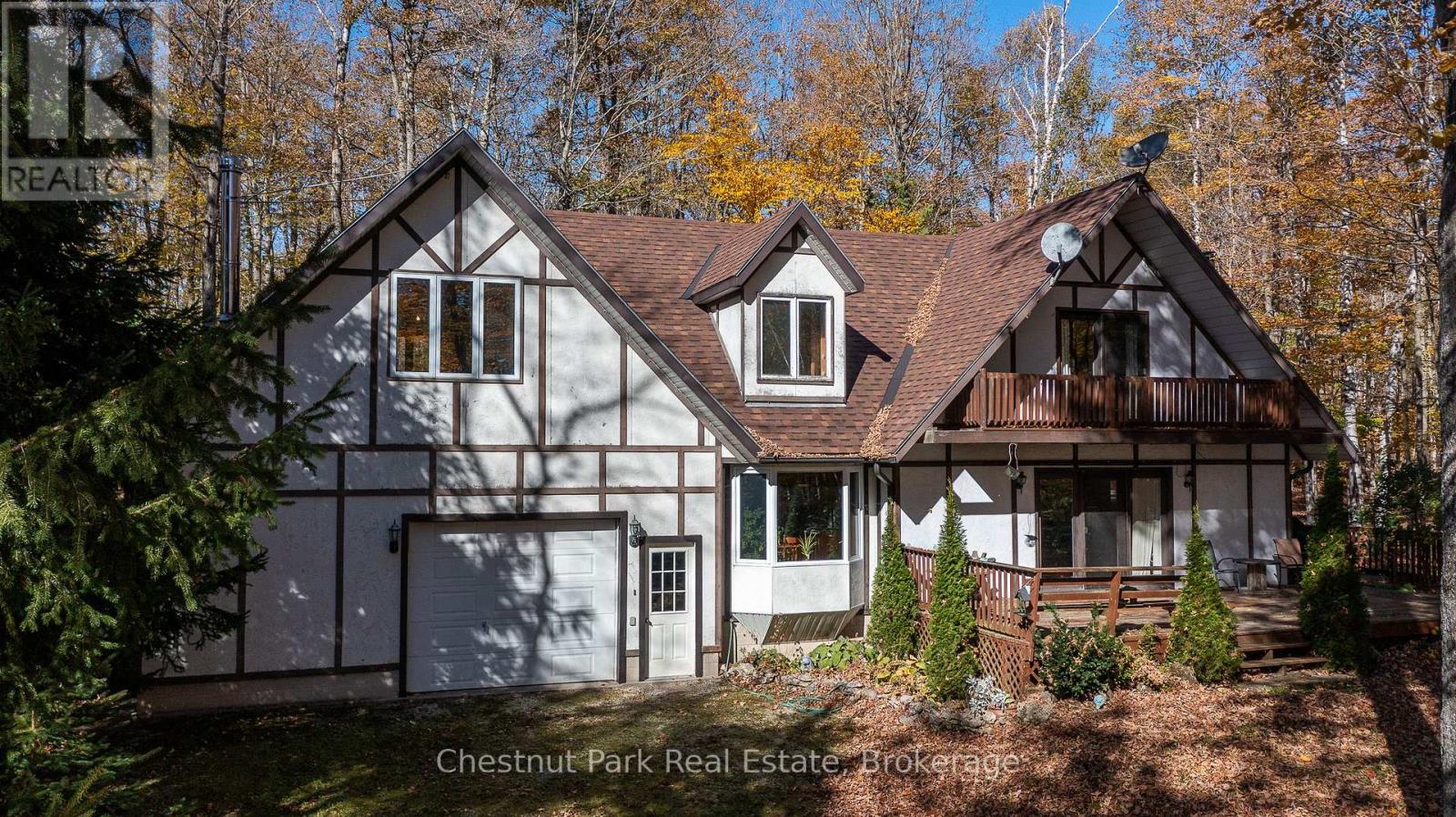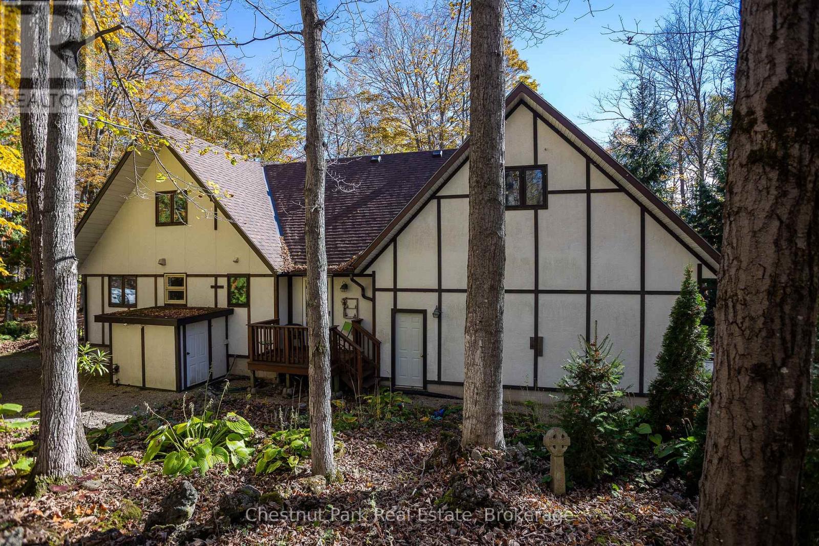 Set on a picturesque 2.3-acre hardwood lot on the beautiful Bruce Peninsula, this inviting Tudor-style four-season home or cottage offers a peaceful setting surrounded by nature, just minutes from the public boat launch on Miller Lake. With a seasonal glimpse of the water and a quiet wooded backdrop, it's an ideal retreat for those seeking privacy while remaining close to outdoor recreation. Inside, the home is bright and welcoming, featuring an open-concept living space with large windows that fill the interior with natural light. Hardwood floors add warmth and character, while the cozy wood stove creates the perfect gathering place on cooler evenings. The main level offers convenient everyday living, while the upper floor provides two additional generously sized bedrooms along with a well-appointed 3-piece bathroom. The attached 25' x 27' garage offers excellent space for vehicles, tools, and recreational gear, with a spacious bonus area above that could serve as a recreation room, studio, or creative workspace. A separate driveway includes RV parking complete with a hydro hook-up, while a large storage shed with dedicated wood storage adds further practicality for year-round use. Outdoors, the wrap-around deck with ramp access provides a wonderful place to relax and take in the peaceful surroundings. Wander along your own woodland trails, enjoy evenings gathered around the fire pit beneath the stars, or explore the nearby waters of Miller Lake, well known for swimming, boating, and fishing. Beautiful perennial rock gardens add colour and charm to the landscape throughout the warmer months. Whether you're searching for a year-round residence or a relaxing Peninsula getaway, this tranquil property offers space, privacy, and easy access to the natural beauty the Bruce Peninsula is known for. (id:64974)
