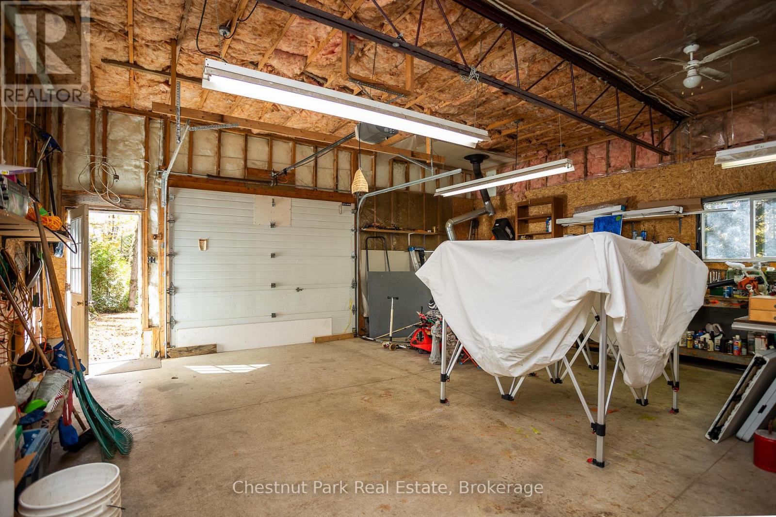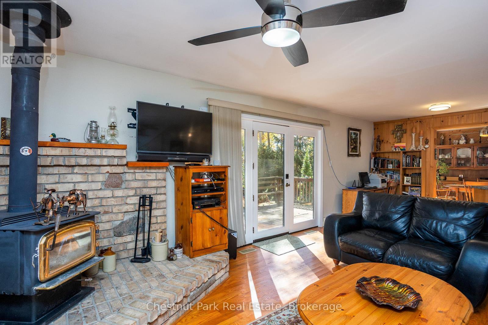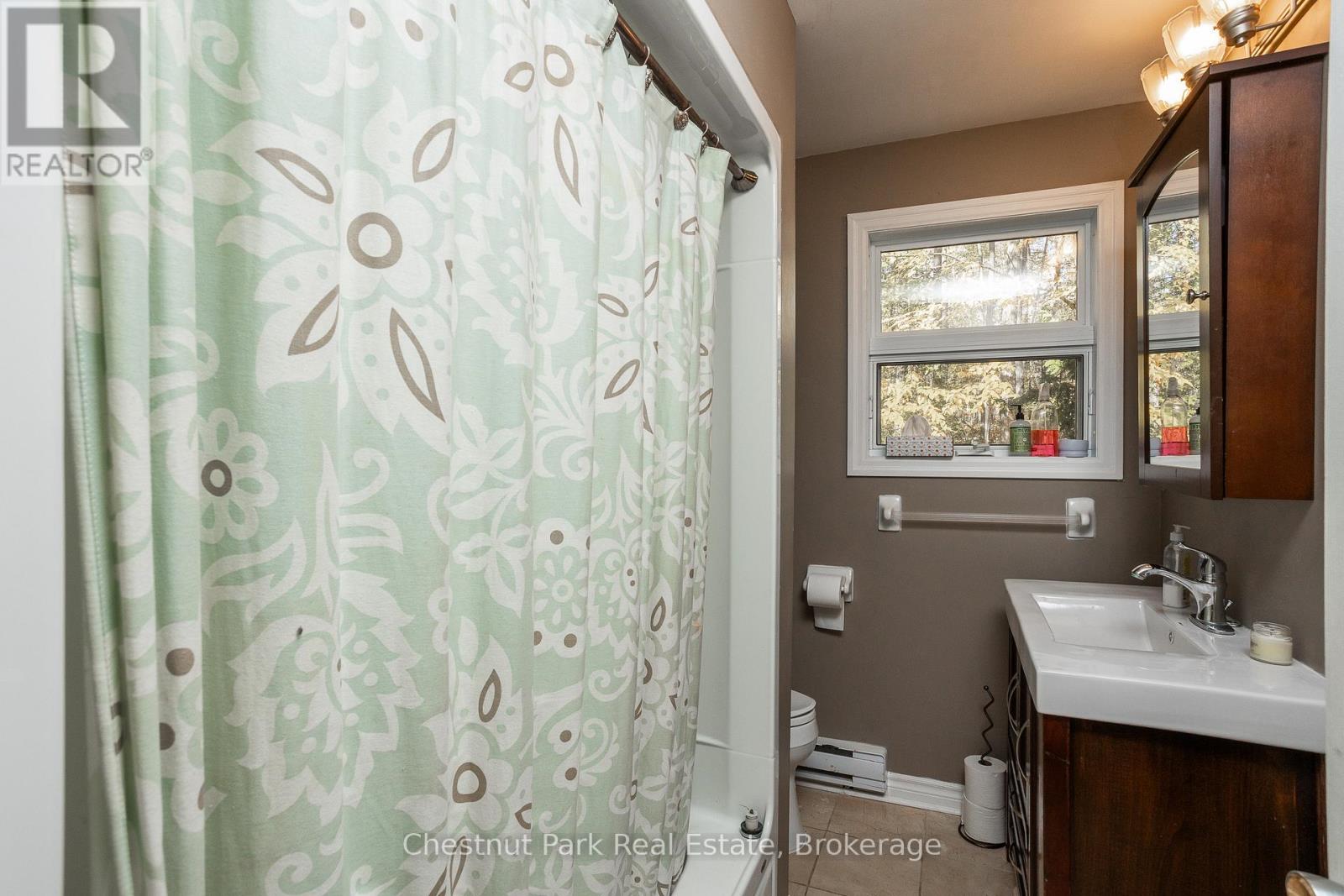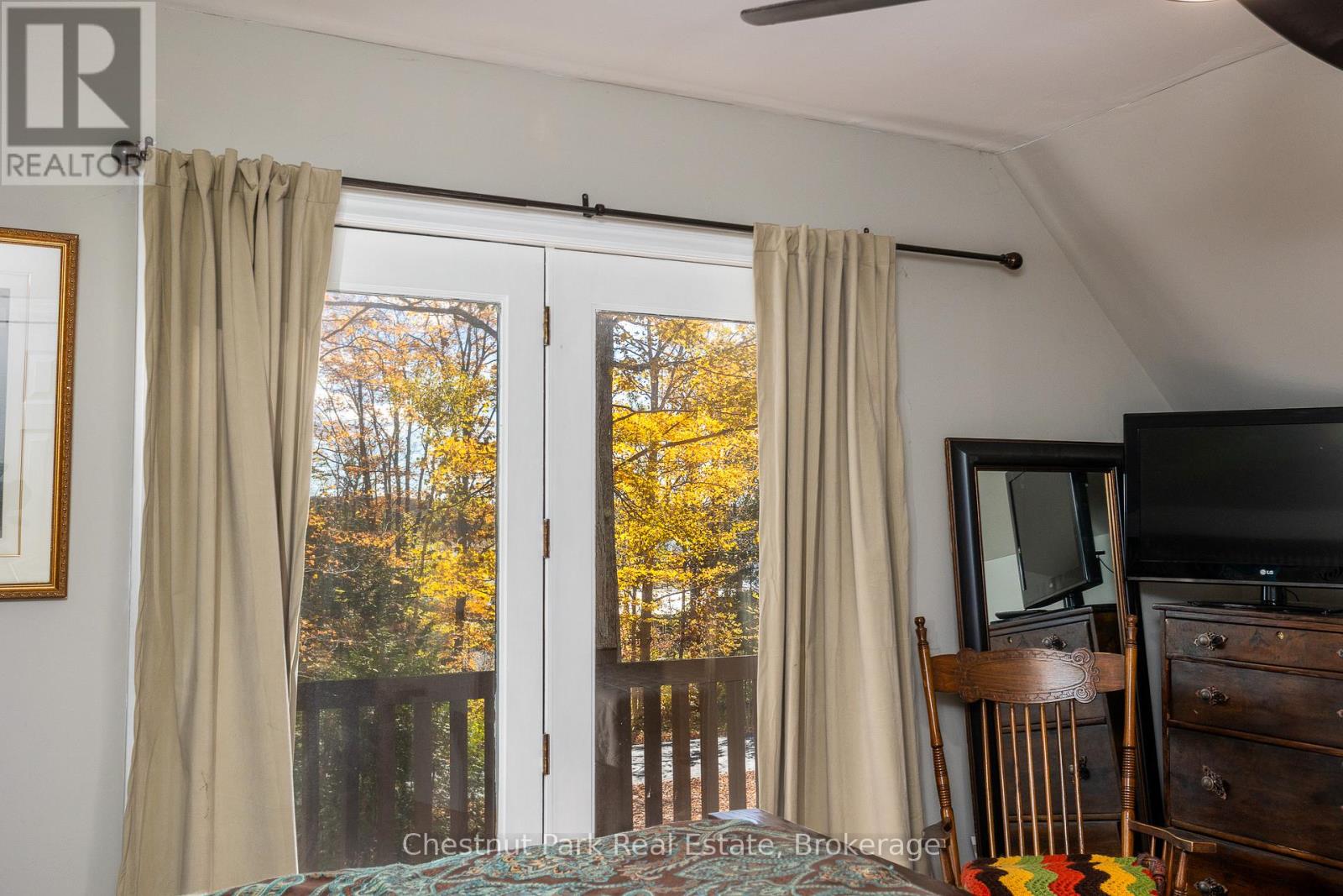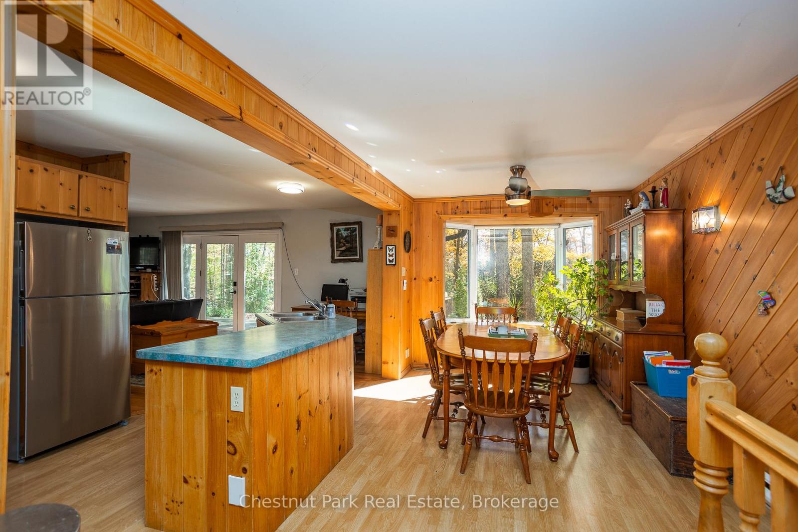 Set on a picturesque 2.3-acre hardwood lot on the beautiful Bruce Peninsula, this inviting Tudor-style four-season home or cottage offers a peaceful setting surrounded by nature, just minutes from the public boat launch on Miller Lake. With a seasonal glimpse of the water and a quiet wooded backdrop, it's an ideal retreat for those seeking privacy while remaining close to outdoor recreation. Inside, the home is bright and welcoming, featuring an open-concept living space with large windows that fill the interior with natural light. Hardwood floors add warmth and character, while the cozy wood stove creates the perfect gathering place on cooler evenings. The main level offers convenient everyday living, while the upper floor provides two additional generously sized bedrooms along with a well-appointed 3-piece bathroom. The attached 25' x 27' garage offers excellent space for vehicles, tools, and recreational gear, with a spacious bonus area above that could serve as a recreation room, studio, or creative workspace. A separate driveway includes RV parking complete with a hydro hook-up, while a large storage shed with dedicated wood storage adds further practicality for year-round use. Outdoors, the wrap-around deck with ramp access provides a wonderful place to relax and take in the peaceful surroundings. Wander along your own woodland trails, enjoy evenings gathered around the fire pit beneath the stars, or explore the nearby waters of Miller Lake, well known for swimming, boating, and fishing. Beautiful perennial rock gardens add colour and charm to the landscape throughout the warmer months. Whether you're searching for a year-round residence or a relaxing Peninsula getaway, this tranquil property offers space, privacy, and easy access to the natural beauty the Bruce Peninsula is known for. (id:64974)