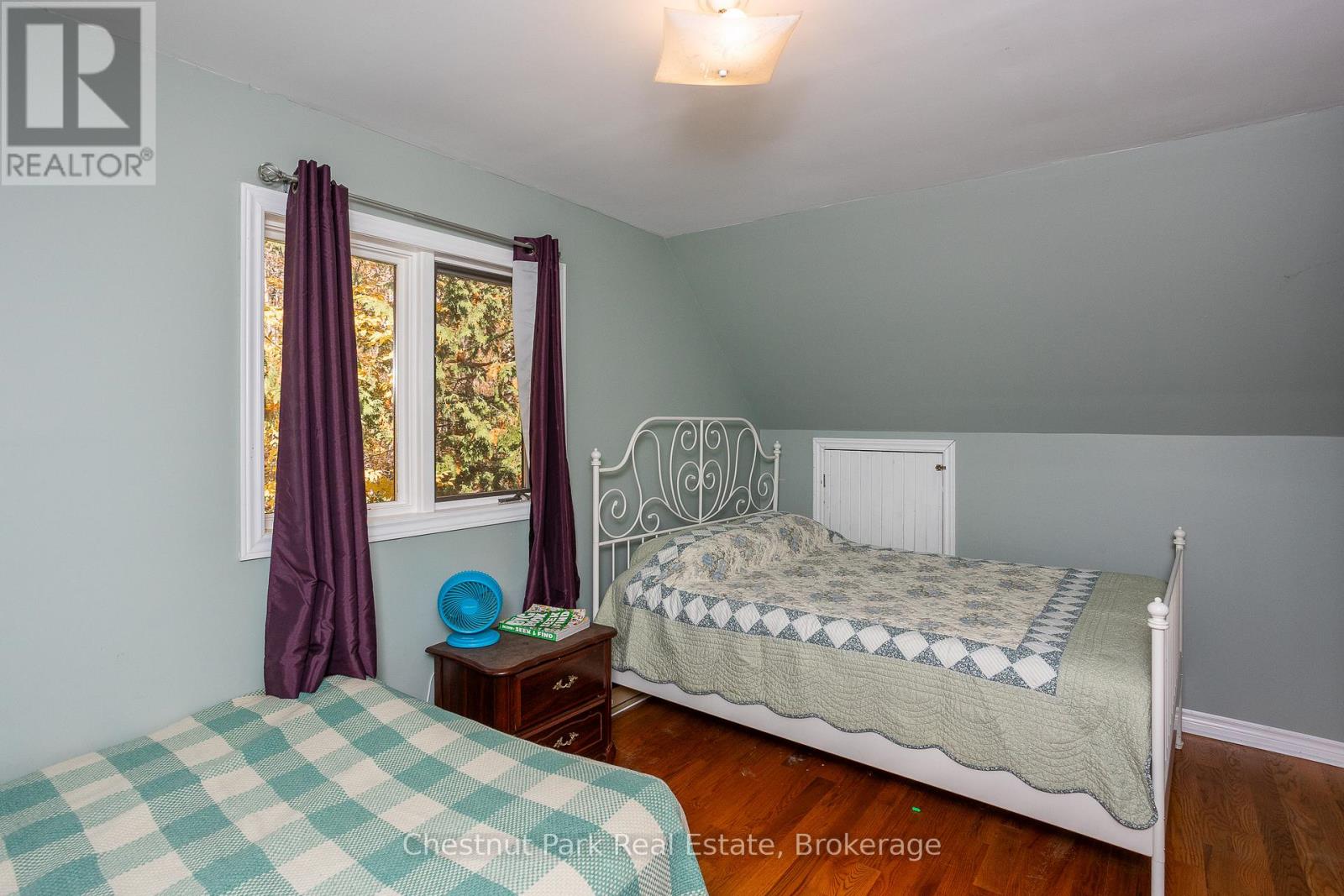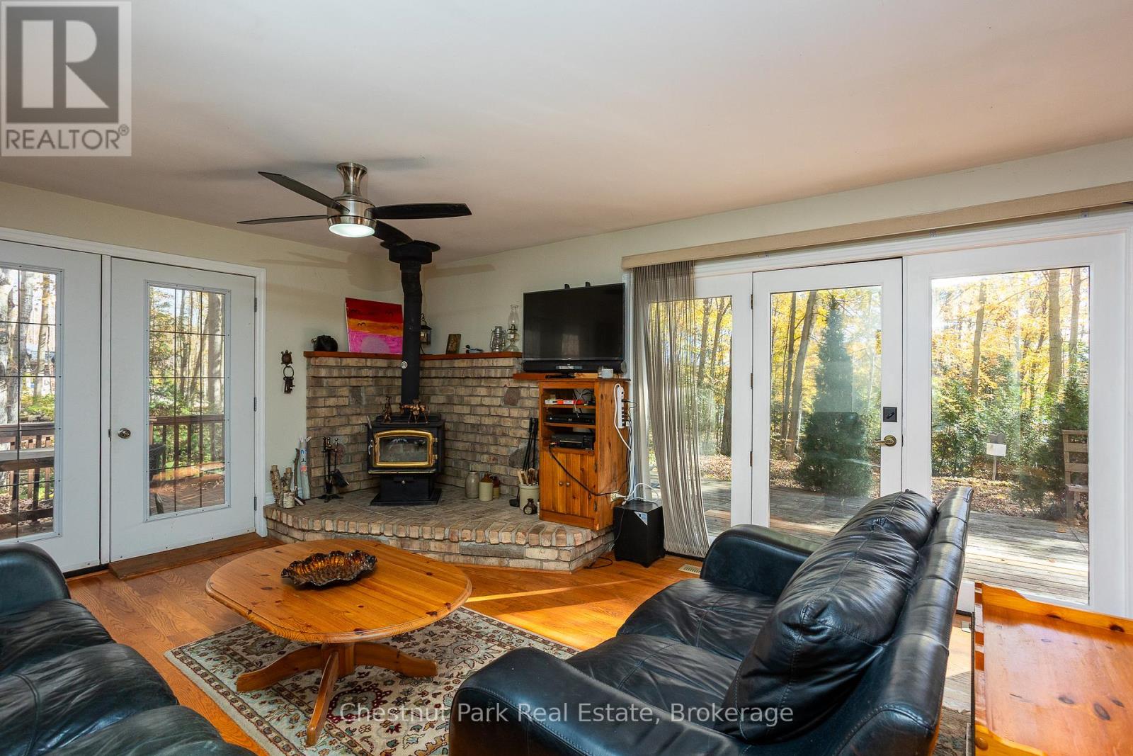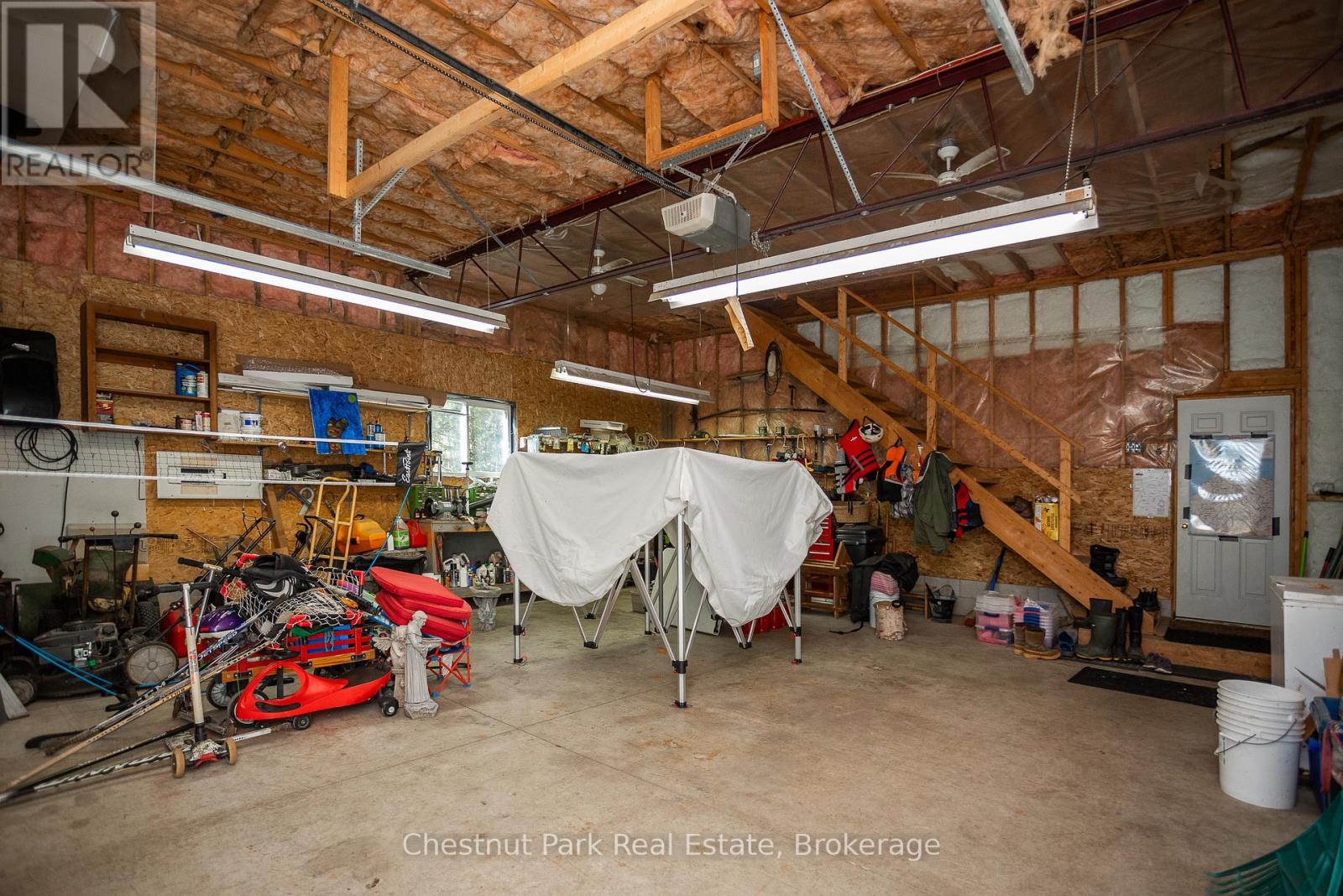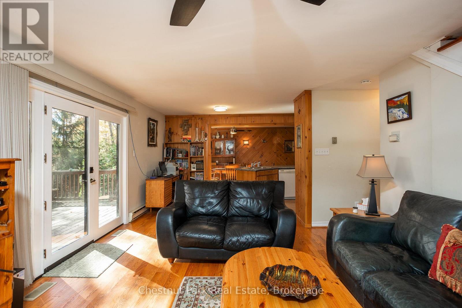 Set on a picturesque 2.3-acre hardwood lot on the beautiful Bruce Peninsula, this inviting Tudor-style four-season home or cottage offers a peaceful setting surrounded by nature, just minutes from the public boat launch on Miller Lake. With a seasonal glimpse of the water and a quiet wooded backdrop, it's an ideal retreat for those seeking privacy while remaining close to outdoor recreation. Inside, the home is bright and welcoming, featuring an open-concept living space with large windows that fill the interior with natural light. Hardwood floors add warmth and character, while the cozy wood stove creates the perfect gathering place on cooler evenings. The main level offers convenient everyday living, while the upper floor provides two additional generously sized bedrooms along with a well-appointed 3-piece bathroom. The attached 25' x 27' garage offers excellent space for vehicles, tools, and recreational gear, with a spacious bonus area above that could serve as a recreation room, studio, or creative workspace. A separate driveway includes RV parking complete with a hydro hook-up, while a large storage shed with dedicated wood storage adds further practicality for year-round use. Outdoors, the wrap-around deck with ramp access provides a wonderful place to relax and take in the peaceful surroundings. Wander along your own woodland trails, enjoy evenings gathered around the fire pit beneath the stars, or explore the nearby waters of Miller Lake, well known for swimming, boating, and fishing. Beautiful perennial rock gardens add colour and charm to the landscape throughout the warmer months. Whether you're searching for a year-round residence or a relaxing Peninsula getaway, this tranquil property offers space, privacy, and easy access to the natural beauty the Bruce Peninsula is known for. (id:64974)