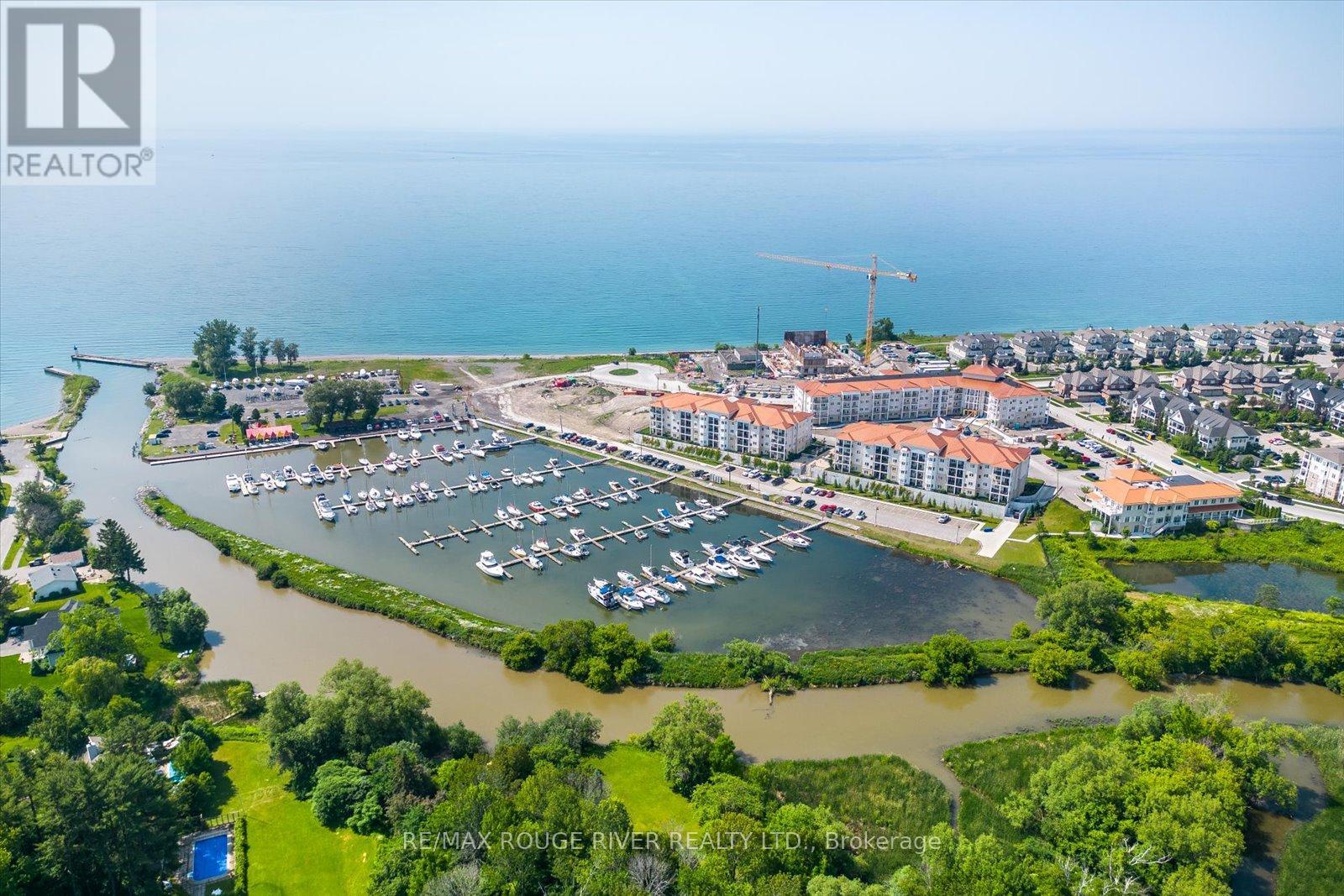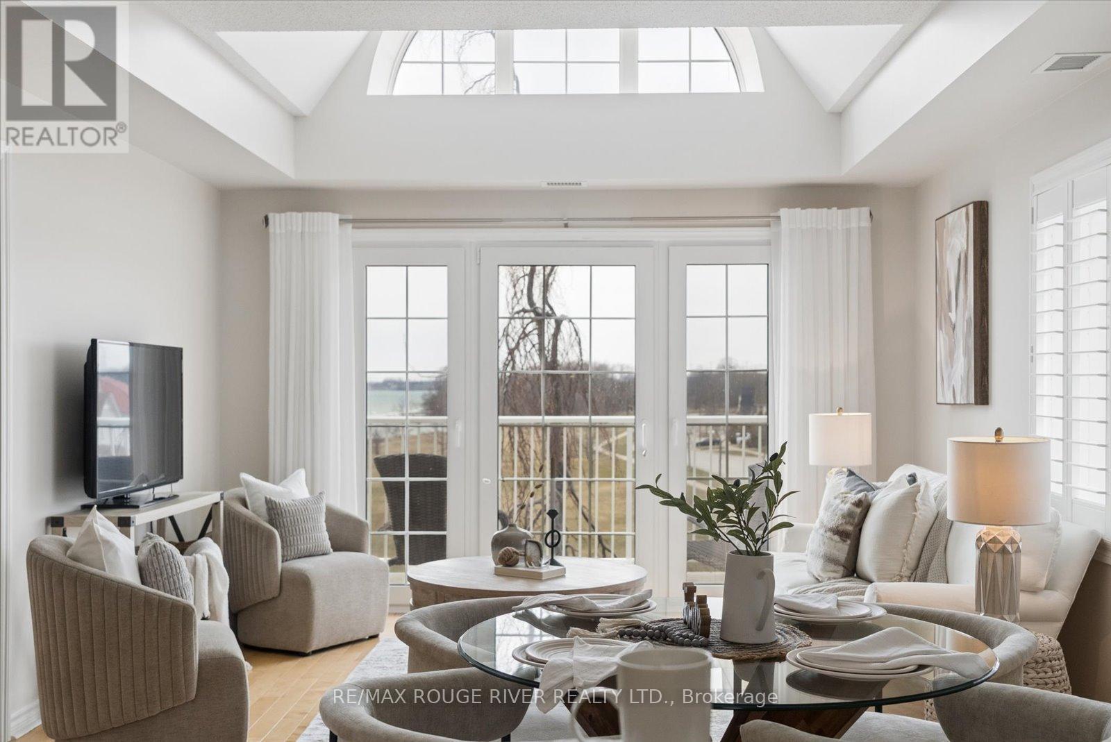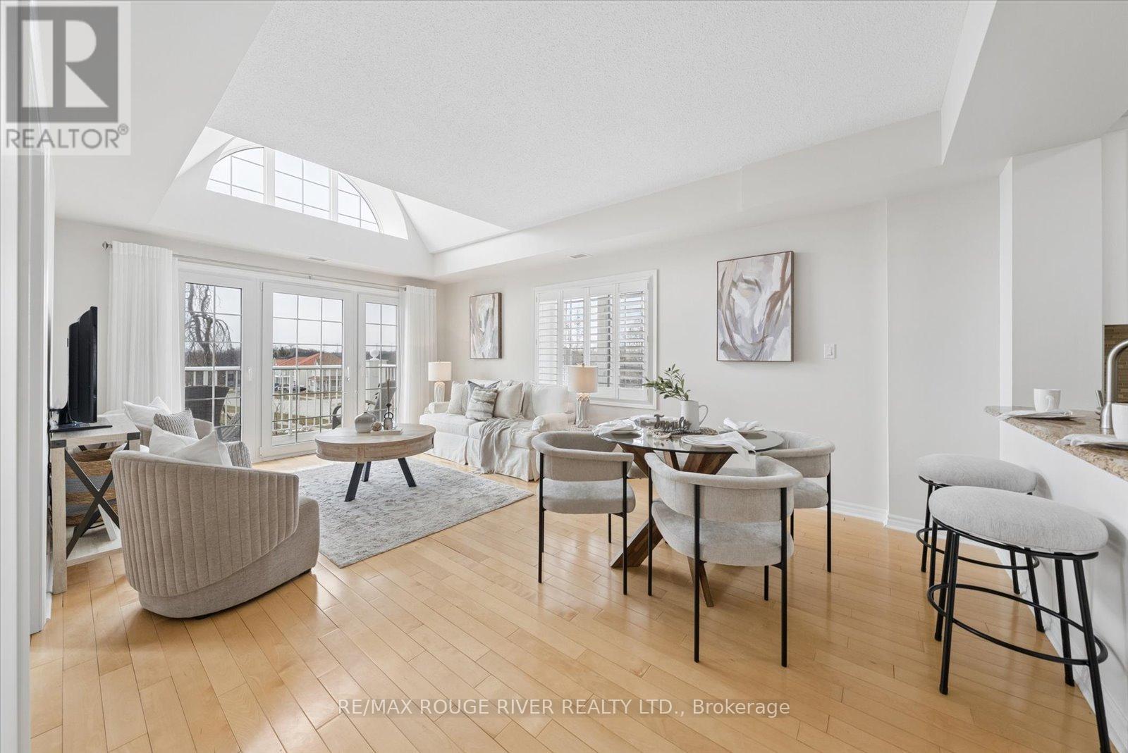 Experience the very best of lakeside living in this stunning corner condo at the highly sought-after Port of Newcastle. Perched on the top floor above the water with no neighbouring building to interrupt the skyline, this west-facing suite offers breathtaking, unobstructed views of Lake Ontario and surrounding parkland-sunsets here are simply extraordinary. At over 900 square feet, this bright and airy corner unit is filled with natural light from multiple exposures and enhanced by soaring vaulted ceilings that create a grand, open feel. Freshly painted in a modern palette with updated lighting, every detail has been thoughtfully curated. Rich maple hardwood floors, California shutters, and refined finishes add warmth and sophistication throughout.The open-concept living and dining area flows seamlessly to a private balcony where lake and park views take centre stage-an ever-changing backdrop through the seasons. The kitchen features granite countertops, an undermount sink, stylish backsplash, and breakfast bar-perfect for morning coffee overlooking the water.The primary bedroom is a true retreat with hardwood floors, a 4-piece ensuite with quartz countertops, his-and-hers closets, and serene lake views. The second bedroom is a standout, complete with a cozy fireplace and beautiful park views-ideal as a guest room, den, or inspiring home office.Rarely offered in condo living, this suite includes a private storage unit and two parking spaces. Ownership also includes two exclusive Gold Memberships to the Admirals Walk Clubhouse, featuring a gym, indoor pool, sauna, steam room, library, tennis courts, and vibrant community programming.Just steps from your door: lakeside parks, marina, and direct access to the Great Lakes Waterfront Trail-offering thousands of kilometres of scenic trails-perfect for an active, maintenance-free lifestyle. (id:64974)