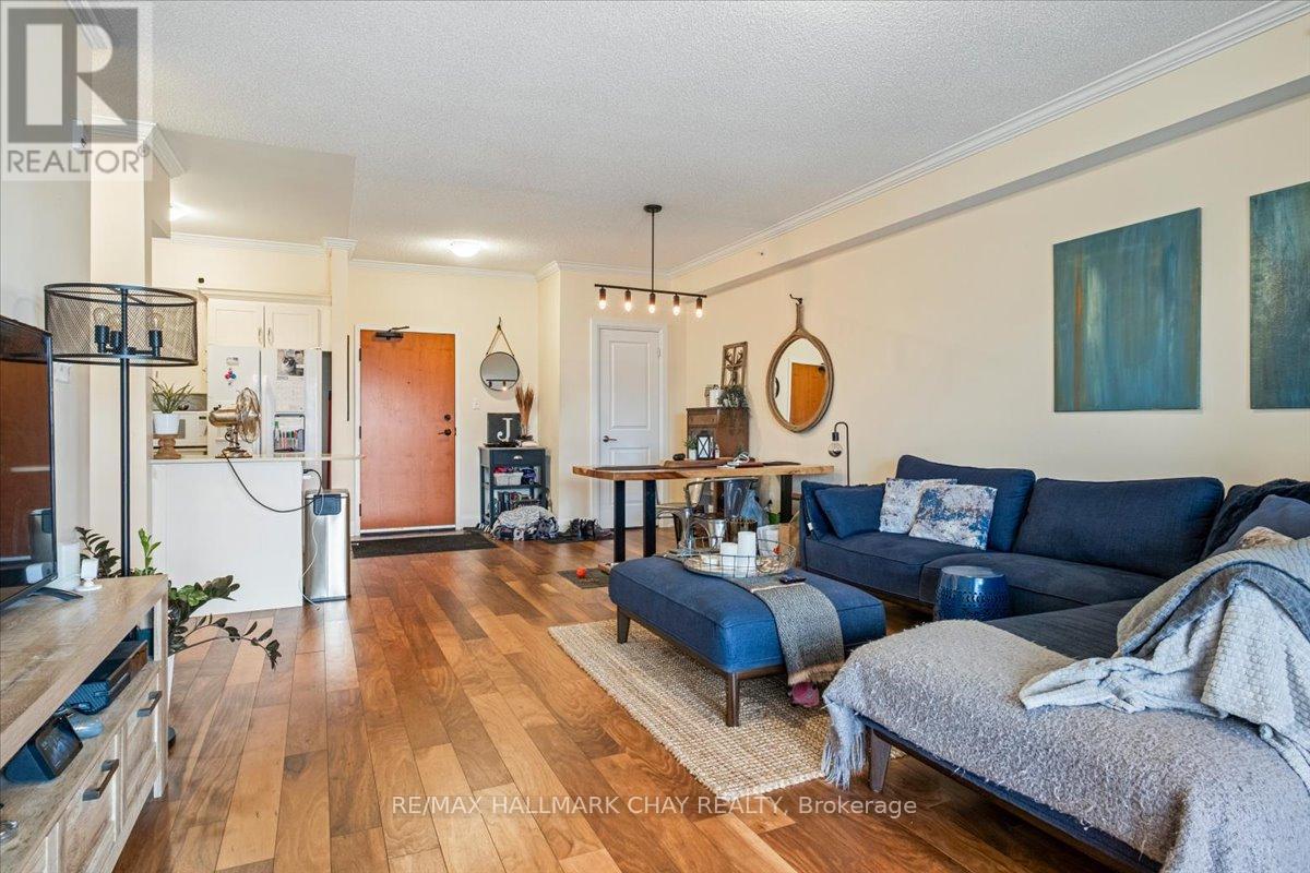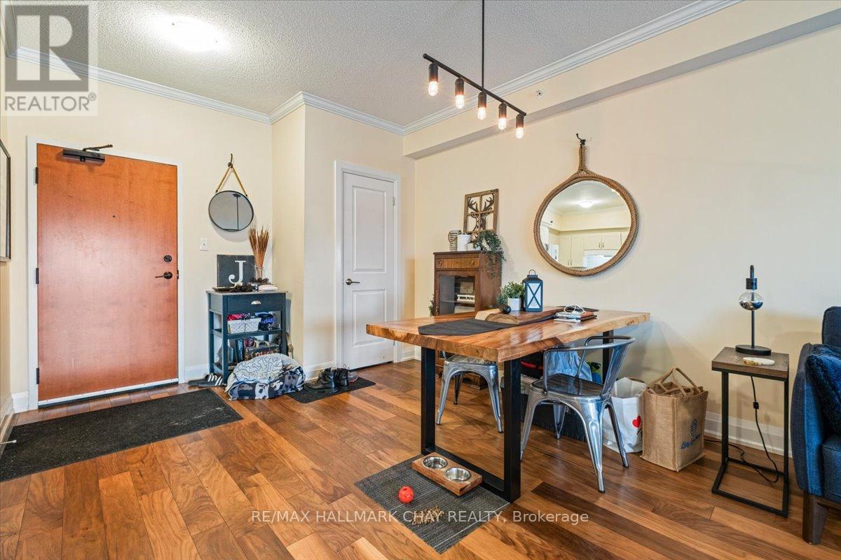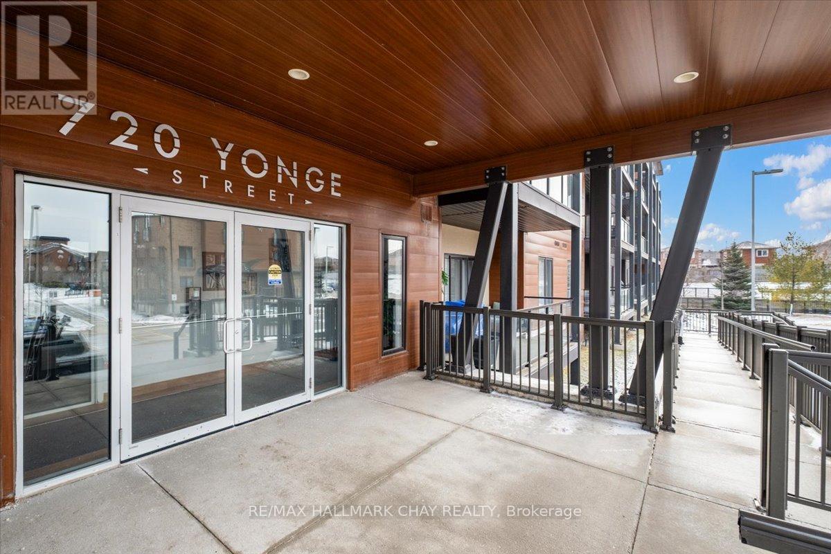 Welcome to this spacious, bright, and beautifully maintained 1-bedroom, 1 bathroom condo at the highly desirable Yonge Station community in South Barrie. Upgraded throughout with an open-concept layout. The kitchen features tile backsplash, white appliance package, quartz counters, pot drawers, and an undermount sink, seamlessly overlooks the generous living area and separate dining area - perfect for entertaining. California Shutters package throughout, Engineered laminate flooring, upgraded lighting, Crown moulding, custom doors to laundry area and bedroom. $30,000 in upgrades. The large primary bedroom offers a comfortable retreat. Spacious bathroom provides for a custom walk-in shower, nice sized vanity, upgraded toilet, laundry and storage. Convenient location just steps to the GO Station, making commuting a breeze, and close to excellent schools, shopping, parks, and everyday amenities. Enjoy your private balcony, barbecue's are permitted, large enough for comfortable patio furniture set, pet friendly building, underground parking, and a dedicated locker for extra storage. Common exercise facility/gym exclusive to the residents. Lots of visitor parking, quiet, friendly complex with secure entry and elevator. Quick access to Highway 400, Barrie's lovely waterfront and just minutes to Innisfil, and Friday Harbour resort. An excellent opportunity for first-time buyers, downsizers, or investors. (id:64974)
