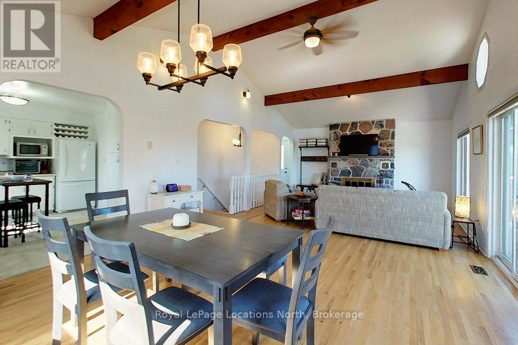 Poised on a gently sloping lot, this captivating chalet style, four-bedroom, two-bathroom home is filled with natural light and partial views of Georgian Bay and water access across the street. Some of the most attractive highlights of this home include the cathedral ceiling in the main living area, the floor to ceiling stone fireplace and the walk out to the generous sized deck. The main floor boasts hardwood floors, a renovated semi-ensuite bathroom, walk out to the back deck and two great sized bedrooms. The open concept living area is a joy to spend time in whether it's cooking on the gas stove in the kitchen, entertaining or reading a book by the fire. On the lower level you will be pleasantly surprised with the walk out family room with gas fireplace and full window wall, two additional bedrooms, a large and bright laundry/storage room and a 3-piece bathroom. Step outside to the large yard space at the rear of the house, original cabin which would make a terrific studio or play space if you opted not to use it as a shed. New furnace 2024. New exterior stone retaining wall and stone steps 2025. New water heater 2023. Living area furniture negotiable. The location of this home positions you on the edge of town, near all amenities, shops and restaurants in Meaford while providing you the cottage feel with Georgian Bay right across the street. Grab a picnic and stroll down to St Vincent Park on the shore. (id:64974)