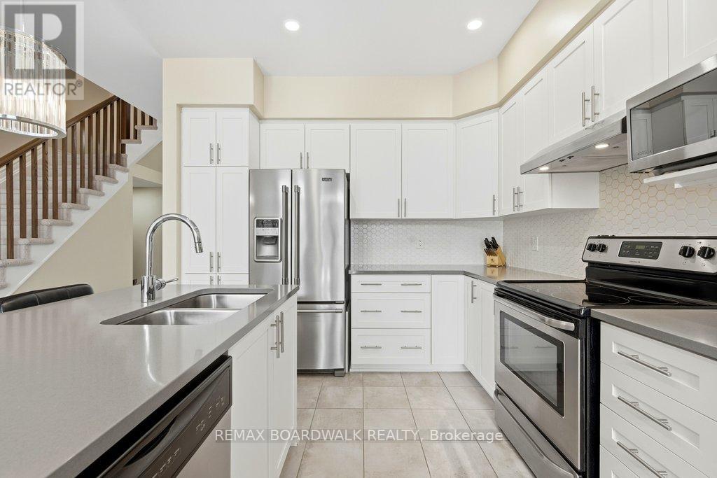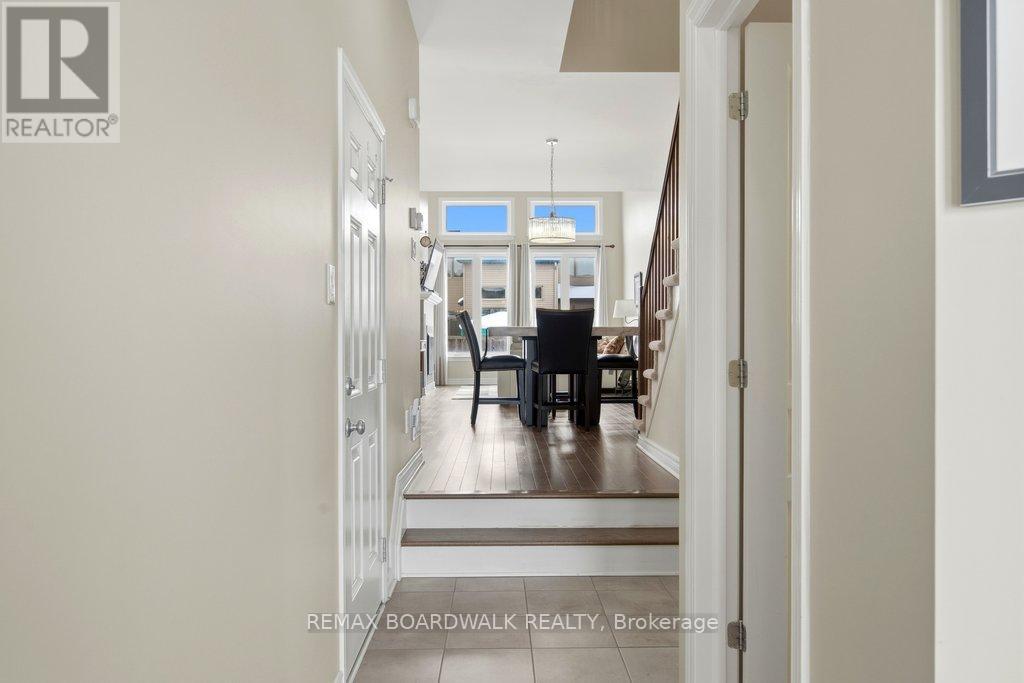 Welcome to this beautifully maintained Richcraft Addison model in the Trailsedge community of Orléans, one of Ottawa's most desirable neighbourhoods for families, professionals, and long-term homeowners. Built in 2017, this move-in ready 3-bedroom home offers thoughtful design, and everyday comfort in a prime east-end location. The main floor features rich dark oak hardwood flooring throughout the living areas, complemented by newer tile in the foyer and kitchen. The bright white kitchen is finished with stone countertops, a central island, and generous cabinetry, creating a functional and welcoming space ideal for daily living. Open to the living room, soaring cathedral ceilings and a feature fireplace wall add architectural interest, warmth, and a sense of calm sophistication. Freshly painted in soft neutral tones, the home offers a modern aesthetic throughout. Wall-to-wall neutral carpeting on the stairs & upper and lower levels provides comfort and continuity. The upper level includes three well-proportioned bedrooms, offering flexibility for families, guests, or home office space, while the finished lower level extends the living area, ideal for recreation, fitness, media, or additional workspace. All appliances, light fixtures, draperies and rods are included, along with a natural gas BBQ, and the seller is open to leaving select furniture, creating a rare turnkey opportunity. An attached garage and rare two-car driveway parking, increasingly hard to find in newer Orléans homes, adds everyday convenience and long-term value. Ideally located close to Patrick Dugas Park, the nature trails, top-rated English and French schools, transit routes, major shopping along Innes Road, and extensive parks, walking trails, and recreation facilities. This exceptional home delivers the perfect blend of lifestyle, location, and livability, offering an outstanding opportunity in today's competitive Ottawa real estate market. (id:64974)