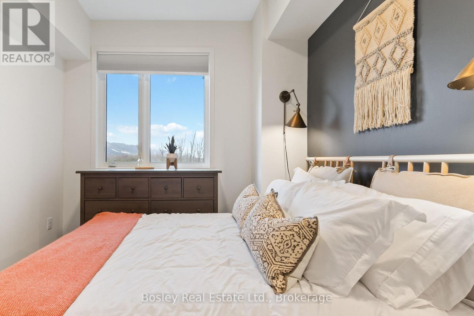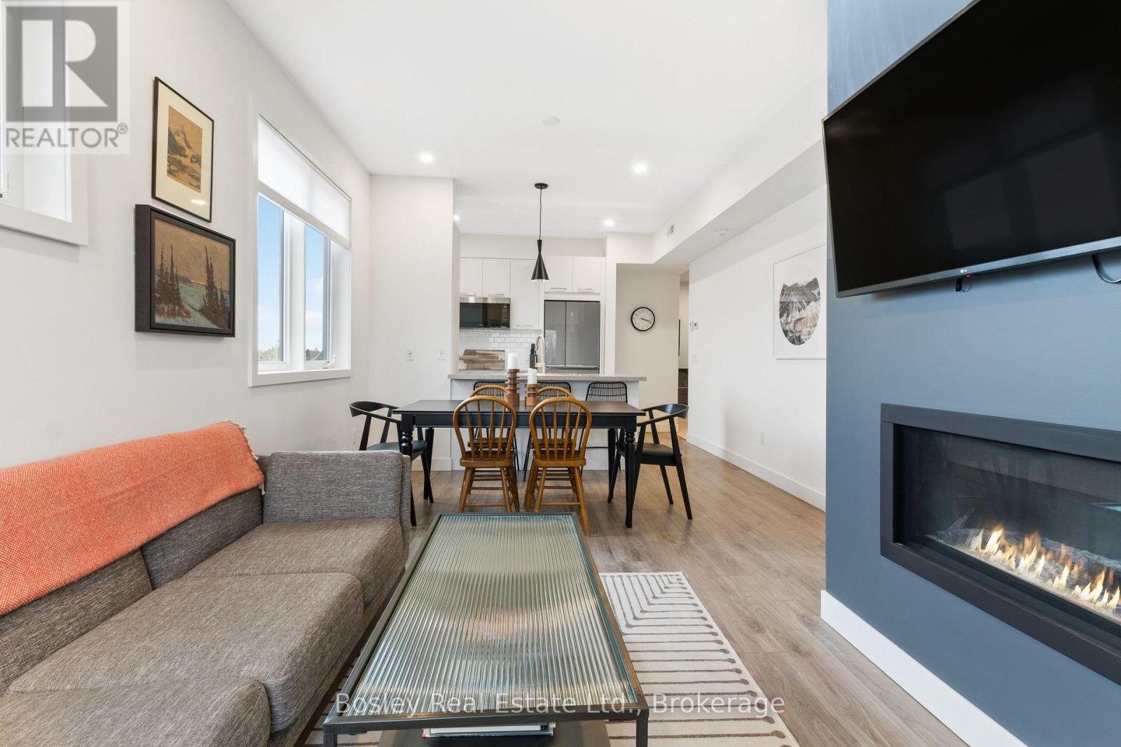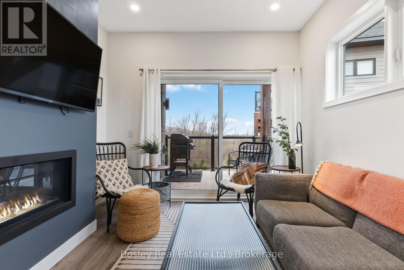 This modern top-floor corner suite offers two parking spots and is filled with windows that flood the space with natural light. Featuring 3 bedrooms and 2.5 bathrooms, Unit 307 delivers the perfect base to experience everything the Blue Mountains lifestyle has to offer. The open-concept living and kitchen area is made for entertaining, anchored by a stone gas fireplace with a beautiful wood mantel. Step out to the spacious balcony-ideal for BBQs and relaxed evenings. The kitchen showcases a quartz waterfall countertop and backsplash, integrated appliances, and a generous breakfast bar. The primary bedroom features a stylish ensuite with an oversized glass walk-in shower. Owners enjoy access to Mountain House's Zephyr Springs oasis, complete with a year-round heated outdoor pool, seasonal cold pool, sauna, fitness room, and the Apres Lodge with its indoor/outdoor fireplace. Embrace four-season living surrounded by scenic views and endless outdoor adventure. (id:64974)