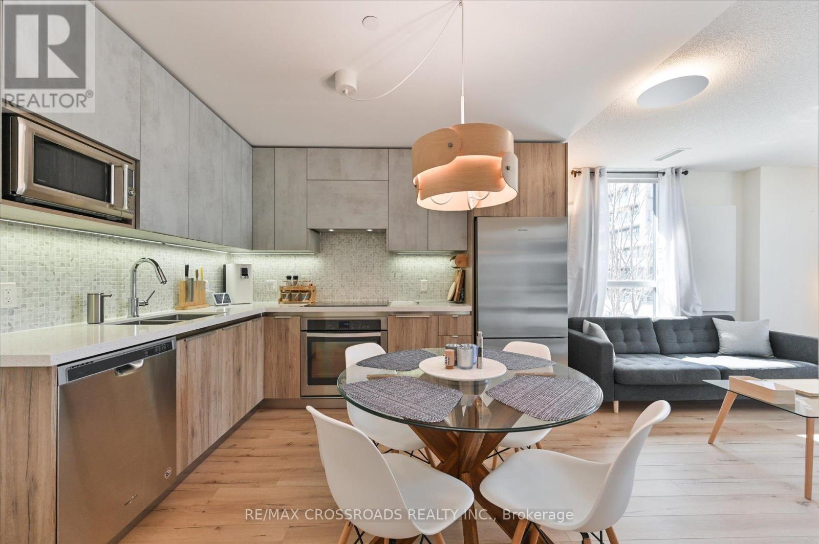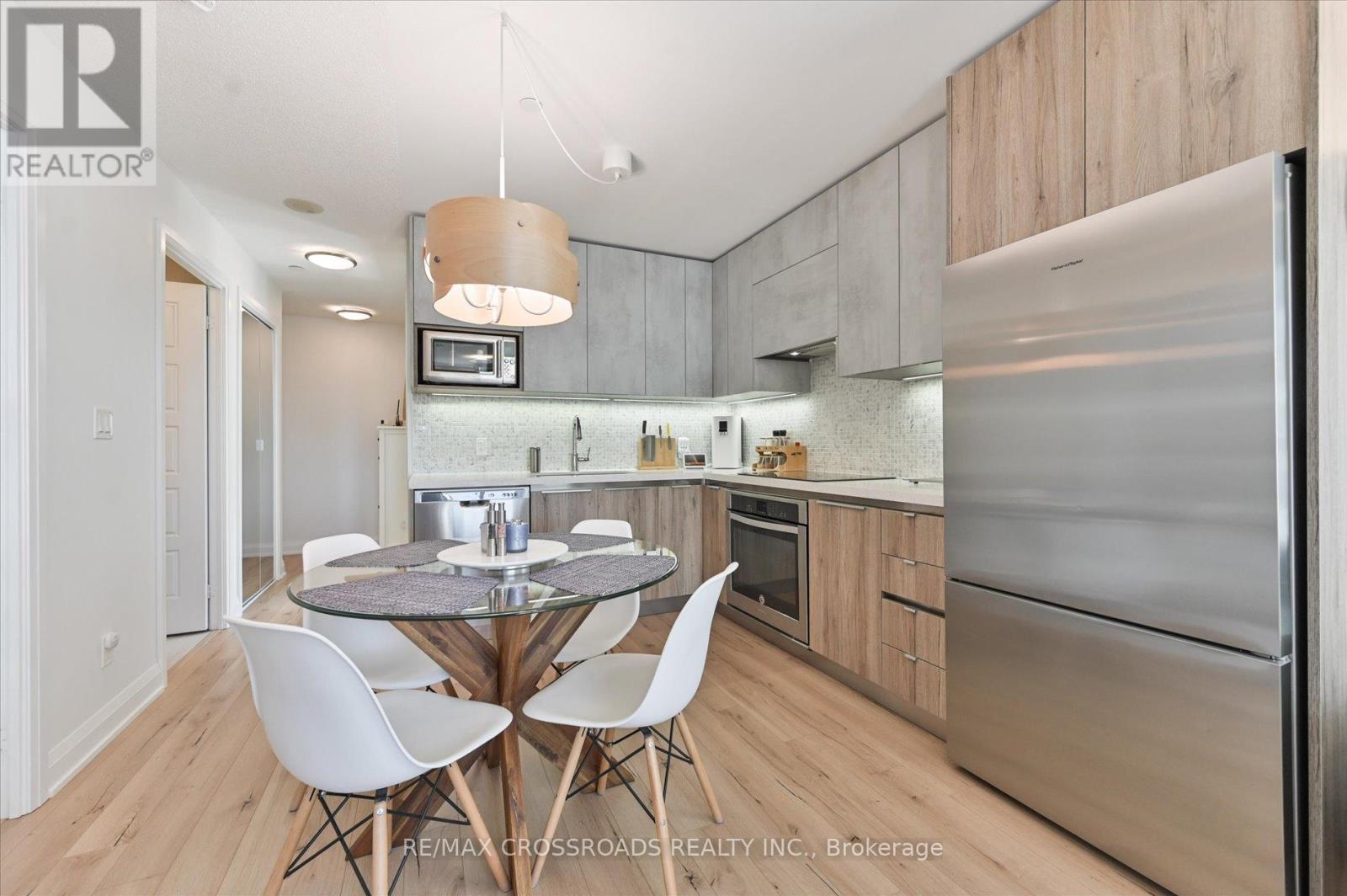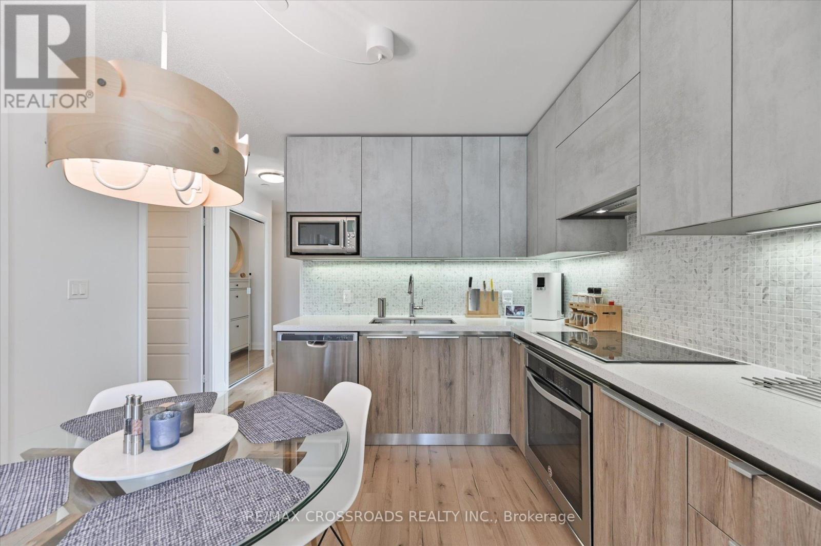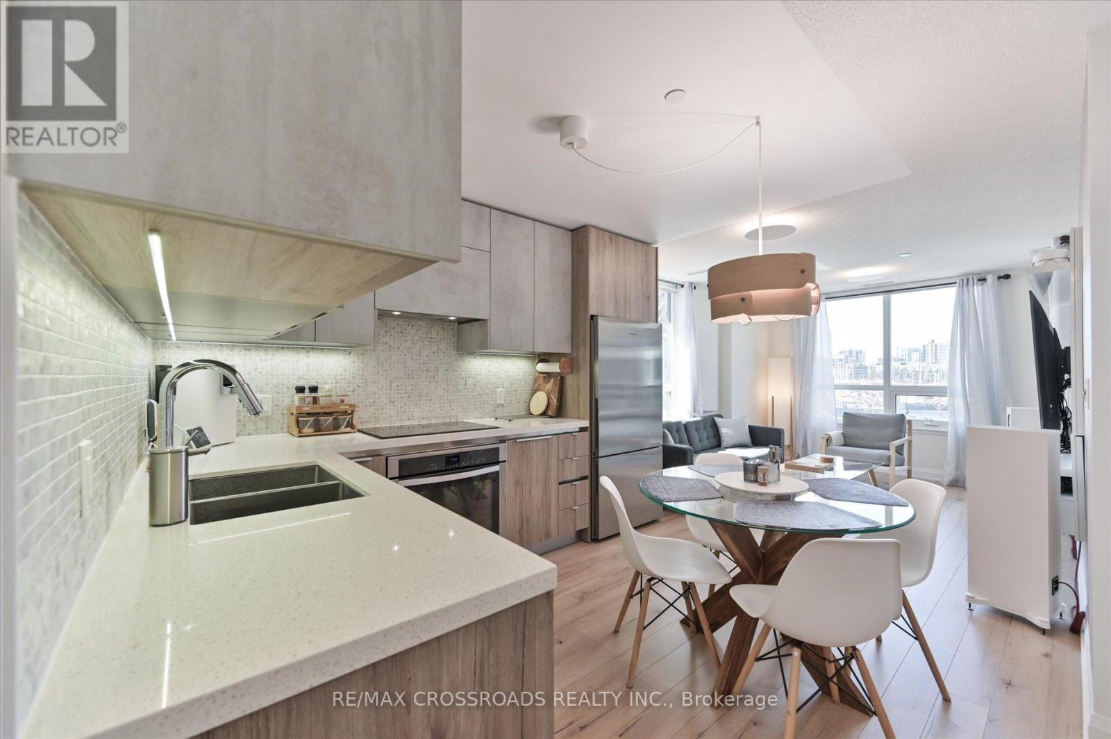 Rare Corner Sanctuary in Riverside Uptown Markham - Sunset Views & Ultimate Privacy. True pride of ownership! Experience the pinnacle of urban living in this meticulously maintained oversized 1-bedroom plus den corner suite. Spanning 695 square feet of meticulously upgraded space, this southwest-facing unit is flooded with natural light and offers a rare level of tranquility - tucked away at the end of the hallway with no neighbours above! The versatile, sun-filled den features a large window and is easily convertible into a functional second bedroom or executive home office. The gourmet kitchen is a chef's dream, featuring an upgraded GE Cafe induction cooktop, premium stainless steel appliances, and sleek cabinetry. The open-concept living area is anchored by a custom built-in media wall unit and accented by upgraded designer light fixtures throughout. Upgraded with CAT6 network wiring throughout for seamless, high-speed internet connectivity in every room. Not to mention, already included in the maintenance fee is Rogers 1.5 gigabit internet for your convenience! Includes 1 Parking & 1 Locker. Enjoy world-class LEED Gold amenities: an infinity rooftop pool, fitness centre, library/Wi-Fi lounge, and 24-hour concierge. Located steps from Whole Foods, luxury dining, and Viva Transit, with rapid access to Highways 407 and 404. (id:64974)