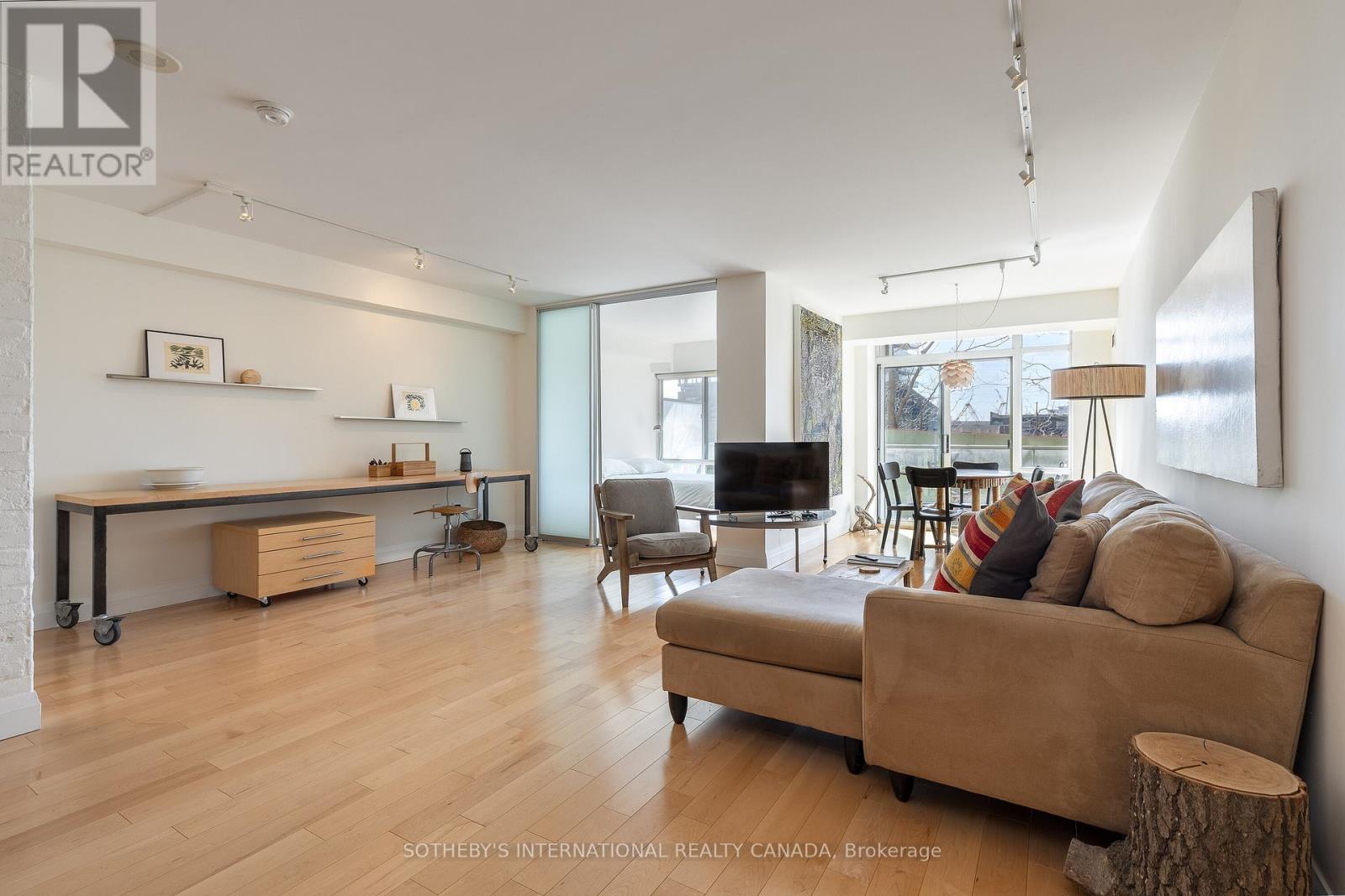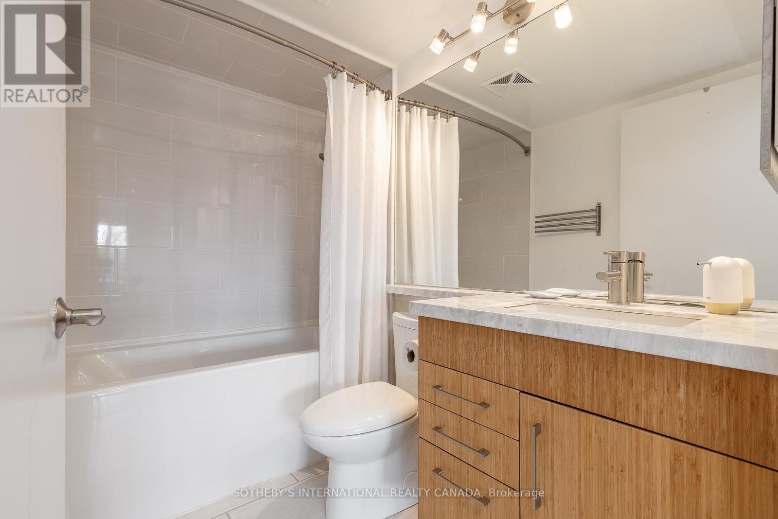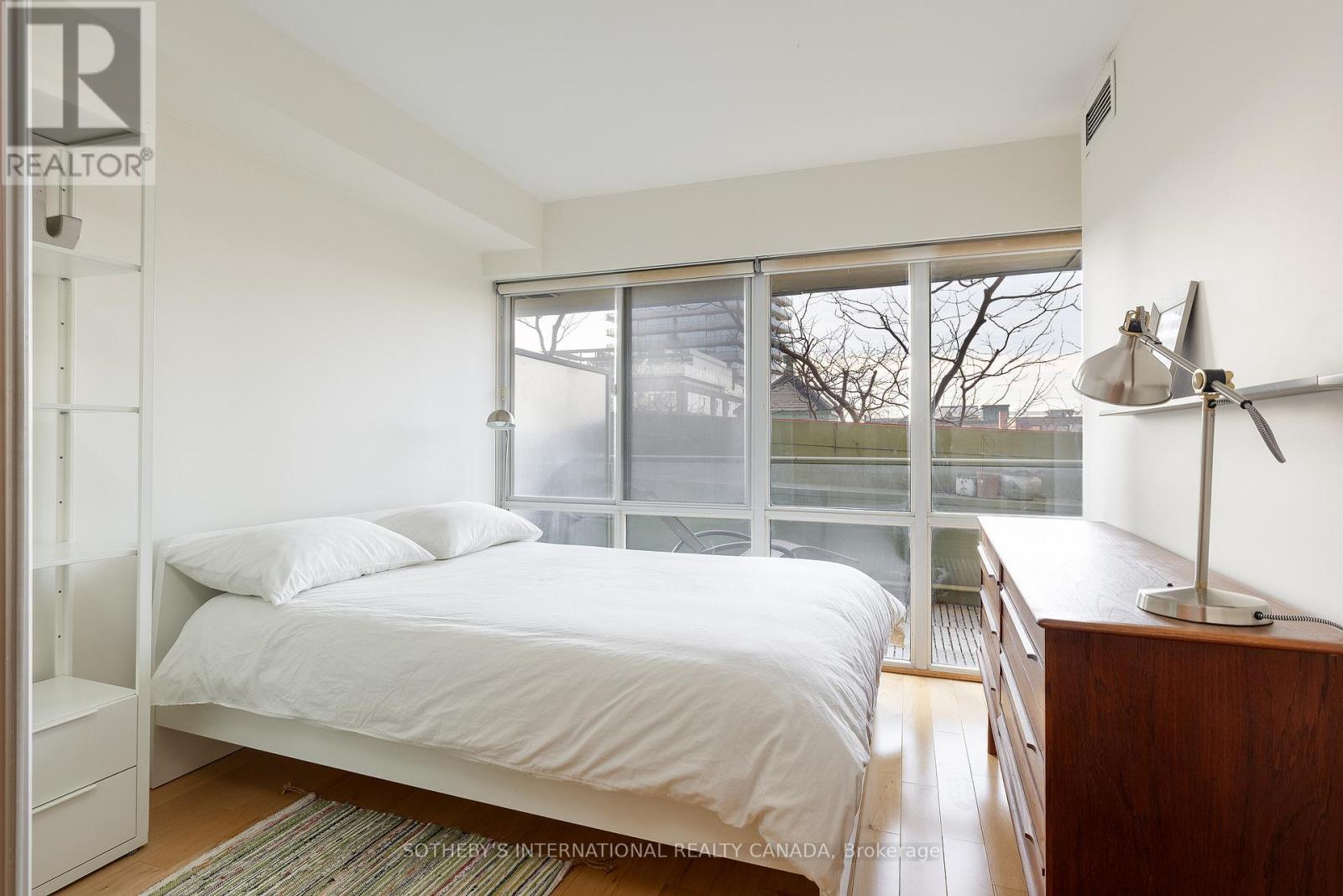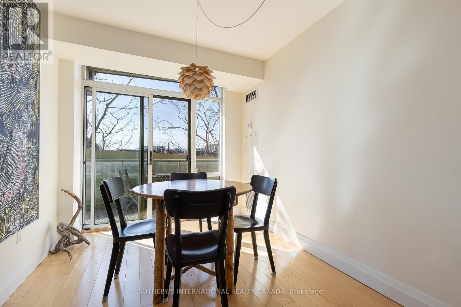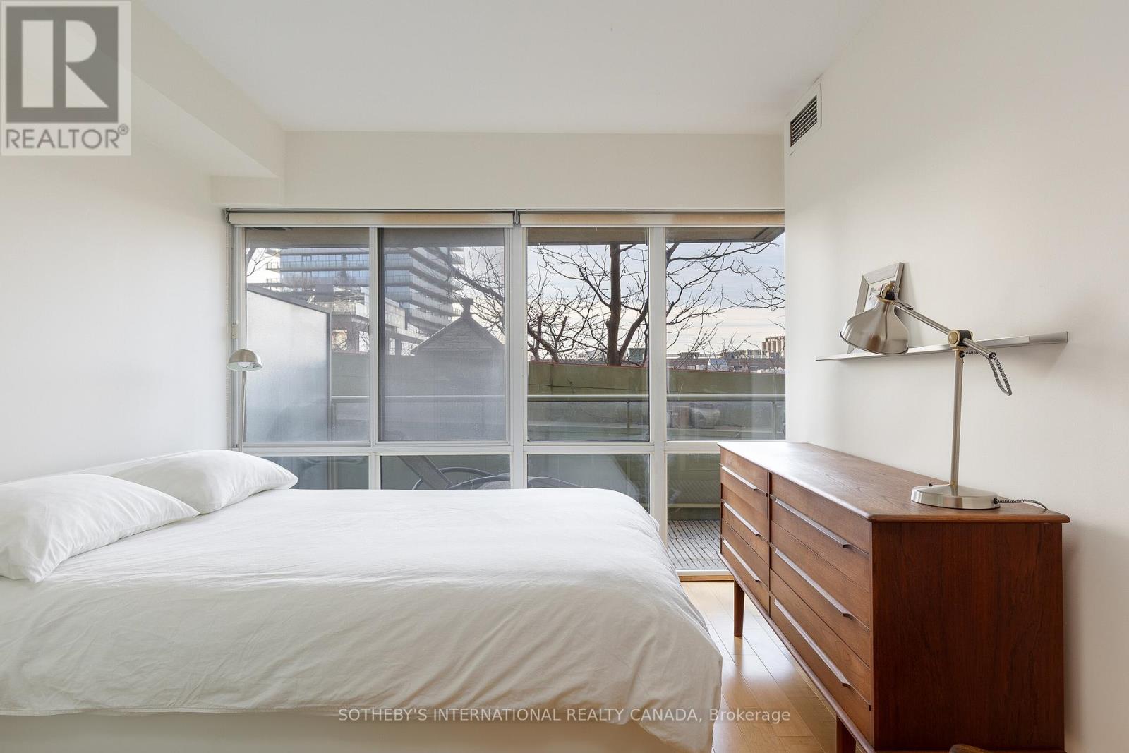 Offering a composed expression of city living with the historic Distillery District, this fully furnished two bedroom, two bathroom suite is thoughtfully arranged as a turnkey short term residence, designed for ease, comfort and flexibility. Hardwood floors and integrated millwork create a cohesive interior, while the updated kitchen anchors the living space with a centre island, bamboo cabinetry, stainless steel appliances, and generous preparation space. Natural light moves easily through the combined living and dining areas, framed by floor to ceiling south facing windows and a walkout to a large private balcony. The suite's split bedroom plan provides both privacy and adaptability. The primary bedroom features a walk in closet, a well proportioned ensuite bathroom, and a quiet south facing outlook. The second bedroom offers versatility as a guest room, office, or extended living space, also benefiting from southern exposure. Warm materials, refined finishes, and an intuitive layout establish a calm contemporary atmosphere. Offered fully furnished and configured for short term occupancy, the suite is ideally suited for executives, relocations, and professionals seeking a refined, turnkey residence in the city. Positioned within one of Toronto's most distinctive neighbourhoods, the Distillery District's cobblestone streets, galleries, cafés, and restaurants unfold just outside the door. Convenient access to the Financial District, St Lawrence Market, King East, transit, and major routes further enhances its ease of living. Parking and a bicycle are included. (id:64974)
