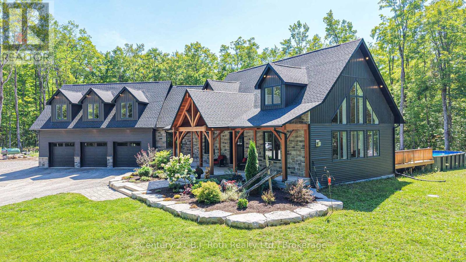 One-of-a-kind modern Craftsman nestled among the trees offering ultimate privacy on a 50-acre property. Welcoming covered entry w/rich stonework & Douglas Fir Timber frame accents sets the tone for exceptional living space within. Step inside to the Great rm. w/natural light, soaring ceilings & open-concept layout, perfect for both family life & entertaining. Custom solid maple Kitchen cabinetry w/Quartz countertops & centre island. The kitchen flows seamlessly into the dining area & great room, complete w/a cozy fireplace & expansive windows overlooking the surrounding forest. Walkout to deck & above-ground pool w/54" walls. Main floor Primary suite w/walkout, Ensuite w/heated floors, soaker tub, sep. tile shower, & quartz-topped vanity plus Walk-in closet. Main flr. 2pc powder rm, laundry, & a spacious mudroom w/walkout to a covered Douglas Fir and Cedar deck, plus direct access to the garage. Upstairs in the main part of the home, you'll find 2 additional Bdrms., a 4 pc. bath, dormer-lit living spaces, & a versatile loft area, ideal for a home office or studio. Above the garage, a second upper living space provides a large family room, perfect for gatherings. 3-car garage offers ample parking & storage w/9 x 8 doors, side-mount openers w/deadbolt locks. While roughed in for in-floor heating, the incoming heat line from the outdoor wood furnace keeps the garage warm during the winter months. The garage includes a man door to the side yard & direct access to both the main floor & basement. Whether relaxing on the front porch or covered back deck, hosting gatherings, exploring the trails, or simply enjoying the quiet surroundings, this property delivers the perfect balance of elegance, comfort, and rustic charm in a serene country retreat. 200-amp service, LED pot lights, 22KW Generac whole-home generator. Upgraded BIBS insulation. Outdoor wood furnace, plus propane forced-air heating & central air. ICF Construction-foundation to top of main floor (incl. Garage) (id:64974)