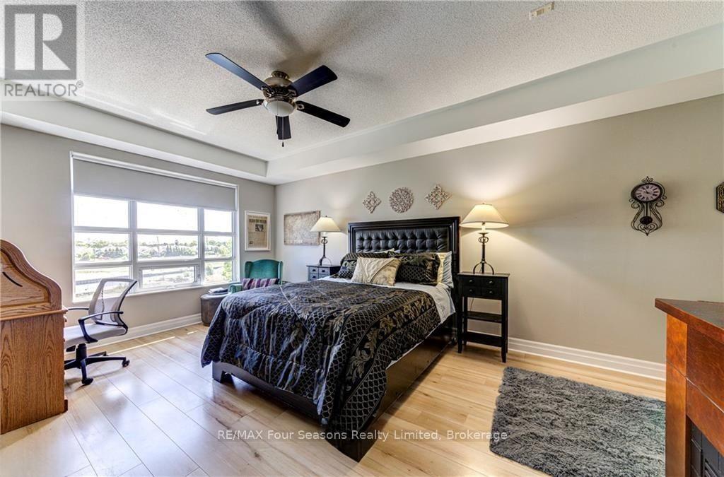 PENTHOUSE CONDO WITH DIRECT WATERVIEWS in The Shipyards Side Launch building. This one bedroom plus den with an unobstructed water view has an access door from both the living room and the den to the large northeast facing deck to watch our fabulous Georgian Bay sunrise. Open plan living space with a combination living room/dining room ,kitchen with island bar, granite counters and stainless steel appliances. Wake up in your good sized primary bedroom with sunrise water views. The den which can also be used as a bedroom also has water views and access to the deck. A 3 piece bathroom, two hall closets and utility/laundry room are located in the large foyer. The Side launch building is safe, secure and immaculately maintained with underground parking. Located just a couple of minutes walk to the Historic Downtown Collingwood and walking trails along the waterfront but yet only a 10 minute drive from the ski hills. Enjoy underground parking, one large exclusive locker an elevator and a newly renovated social/party room. (id:64974)