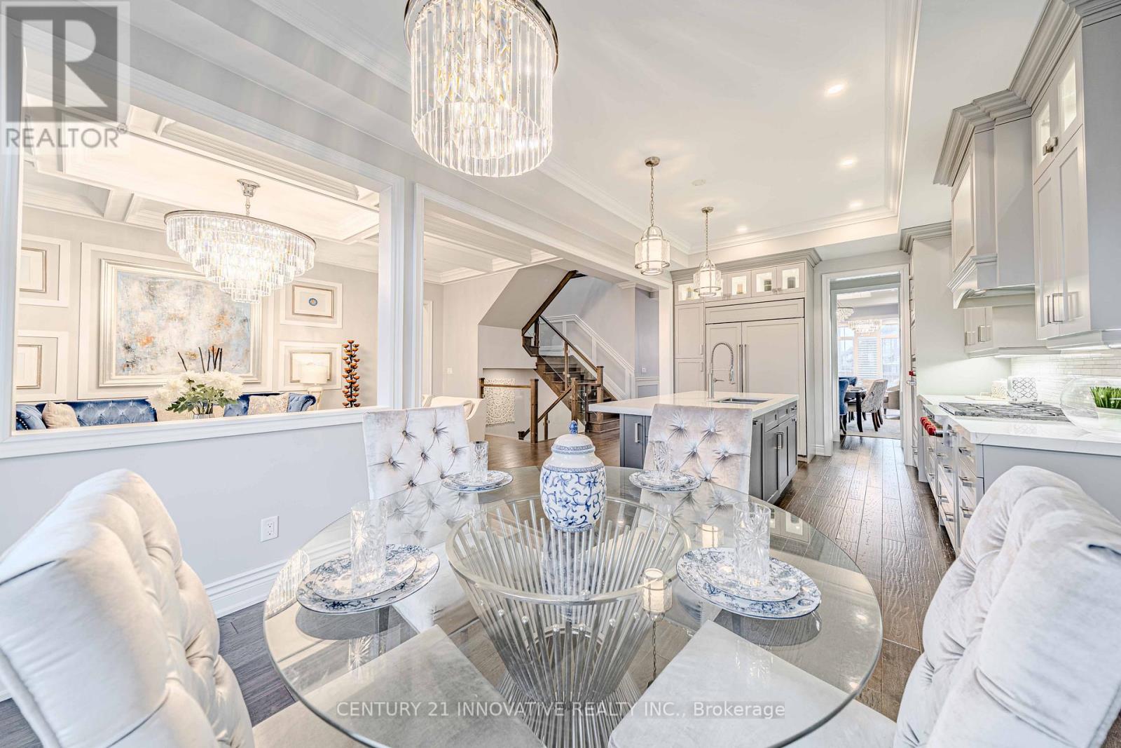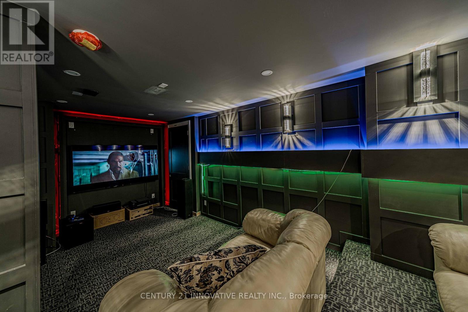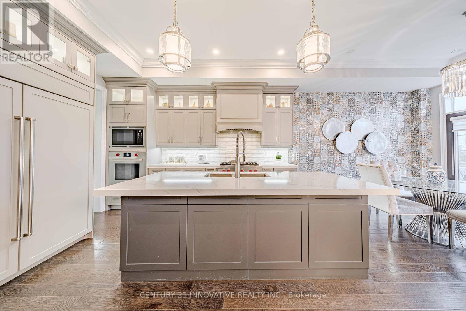 Exquisite Luxury Home on a Ravine Lot in Prestigious Seven Oaks! Boasting over 5,400 sq. ft. of opulent living space, including 3,600+ sq. ft. above grade, this masterpiece is designed for those who appreciate fine craftsmanship and unparalleled detail.Step into grandeur with soaring 11' ceilings on the main floor and solid 9' wood doors throughout. Crystal chandeliers illuminate the elegant living and dining areas, creating an entertainer's dream with custom wainscoting and detailed ceiling designs.The chef's kitchen is a showstopper, featuring built-in Sub-Zero & Wolf appliances, Italian quartz countertops, and dual-tone extended cabinetry. The family room exudes warmth, showcasing a waffle ceiling, gas fireplace with stone mantle, and oversized windows that flood the space with natural light. A grand staircase with glass railings adds to the home's sophisticated charm.The primary suite is a retreat with double walk-in closets leading to a spa-inspired ensuite with upgraded marble countertops. The second bedroom boasts a wall of windows, walk-in closet, and a private 3-piece ensuite, while the third bedroom rivals the primary in size, featuring a deep walk-in closet and Jack & Jill ensuite with 9'ceilings.A professionally finished basement with soaring 10' ceilings offers a soundproofed theatre room, linear gas fireplace, and custom shelving. A roughed-in sauna/steam room and second kitchen add future potential, complete with gas range, cabinetry lighting, and appliance rough-ins.Backing onto lush green space, this home is perfectly situated near top-rated schools, parks, shopping, dining, community centers, and major highways.This is the new definition of luxury! (id:64974)