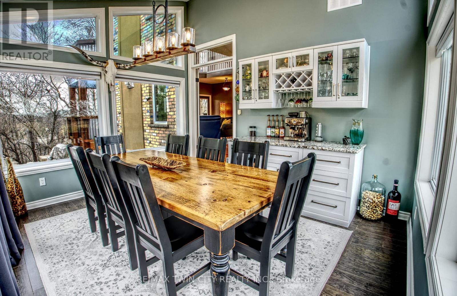 Experience the epitome of luxurious living at 31 Chapel Street, a breathtaking two-story Muskoka-style home situated in the charming community of Vienna. Spanning 2349 square feet of living space, this remarkable residence artfully combines sophisticated design with nearly two acres of pristine land along the tranquil Otter River. Upon entry, you are greeted by a spacious foyer that flows into an elegant open-concept main floor. The gourmet kitchen features stunning granite countertops and is complemented by hardwood floors that create a warm, inviting atmosphere. The grand great room serves as the heart of the home, showcasing a striking two-story stone fireplace and offering captivating views to the second-floor mezzanine. Expansive walk-out patio doors seamlessly connect the indoor space to the enchanting rear yard, making it ideal for entertaining. The main floor also boasts a sunlit dining room, surrounded by windows, and an oversized bedroom with a luxurious three-piece ensuite bathroom. On the second floor, a stunning mezzanine overlooks the great room and leads to a serene balcony, perfect for enjoying scenic vistas. This level includes a spacious guest bedroom and an opulent master suite featuring a private four-piece ensuite bathroom finished in exquisite marble. The professionally landscaped yard evokes a true Muskoka feel, providing picturesque views of the river, lush trees, and abundant wildlife. A two-story deck, complete with a soothing hot tub, creates an ideal outdoor haven for relaxation. The thoughtfully designed lower level enhances the home's functionality, featuring upgraded cork flooring, a fourth bedroom, a cold room, a utility room, and an additional three-piece bathroom, with convenient access to the garage. This extraordinary property combines luxury, comfort, and serene living, inviting you to embrace a lifestyle enriched by nature. 31 Chapel Street is more than a residence; it is a sanctuary of elegance. (id:64974)