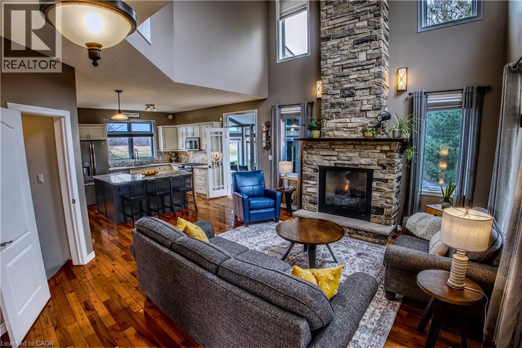 Experience the pinnacle of luxurious living at 31 Chapel Street, a stunning two-story Muskoka-inspired home nestled in the charming community of Vienna. Offering 2,349 square feet of beautifully designed living space, this exceptional residence blends refined elegance with nearly two acres of pristine land along the peaceful Otter River. From the moment you enter, a spacious foyer welcomes you into an impressive open-concept main floor. The gourmet kitchen is appointed with striking granite countertops and complemented by rich hardwood flooring that adds warmth and sophistication throughout. The grand great room is the centerpiece of the home, highlighted by a dramatic two-story stone fireplace and captivating sightlines to the second-floor mezzanine. Expansive walk-out patio doors create a seamless connection to the picturesque rear yard, making this home ideal for entertaining. The main level also features a sun-filled dining room framed by windows, as well as an oversized bedroom complete with a luxurious three-piece ensuite. Upstairs, the beautiful mezzanine overlooks the great room and opens onto a tranquil balcony, perfect for taking in the scenic surroundings. This level also offers a spacious guest bedroom and an elegant primary suite with a private four-piece ensuite finished in exquisite marble. The professionally landscaped grounds capture a true Muskoka ambiance, showcasing river views, mature trees, and abundant wildlife. A two-story deck with a relaxing hot tub provides the perfect outdoor retreat. The thoughtfully finished lower level adds versatility with upgraded cork flooring, a fourth bedroom, cold room, utility room, and an additional three-piece bathroom, along with convenient garage access. This extraordinary property offers a rare blend of luxury, comfort, and peaceful living, inviting you to enjoy a lifestyle immersed in nature. 31 Chapel Street is more than a home; it is a private sanctuary of timeless elegance. (id:64974)