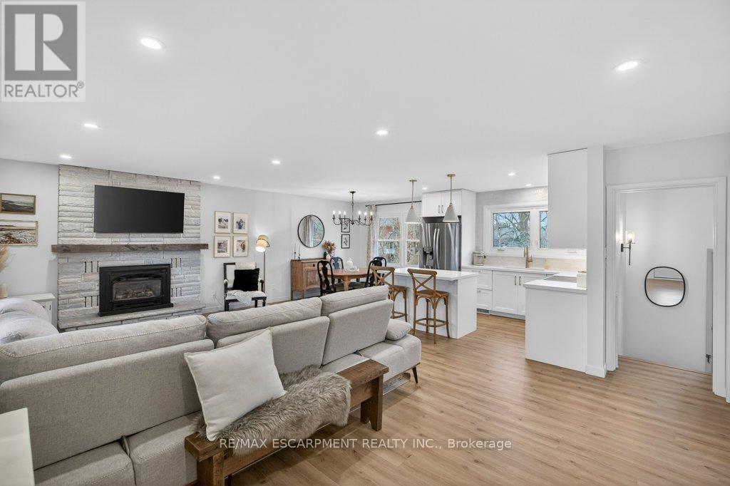Stunning bungalow with large front porch on a large pie shaped lot on a quiet court backing onto a ravine! Desirable location close to shopping and highway access! This beautifully renovated home offers a desirable open floor plan! The sharp kitchen features quartz counters, quality stainless appliances including an induction stove, tasteful backsplash, large island and a convenient pantry closet! The kitchen overlooks a dining room and living room with gas fireplace. Updated and on trend light flooring throughout, smooth ceilings with recessed lighting and wainscotting trim cover all the "I wants" for that perfect home! The four piece bathroom has been updated and offers heated flooring. The primary bedroom and a second bedroom complete this floor! The lower level provides a 3 piece bathroom and a recently completed family room and third bedroom! A separate entrance provides the opportunity for an in-law set up. The expansive rear yard is fully fenced and overlooks a beautiful ravine! An attached single car garage completes this fabulous offering. Additional updates include garage door, front door, exterior lighting, furnace and a/c (2020) and a metal roof! Be prepared to fall in love! (id:64974)