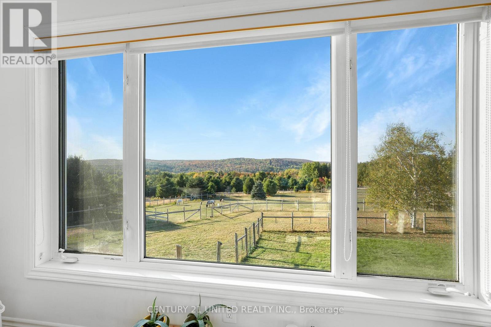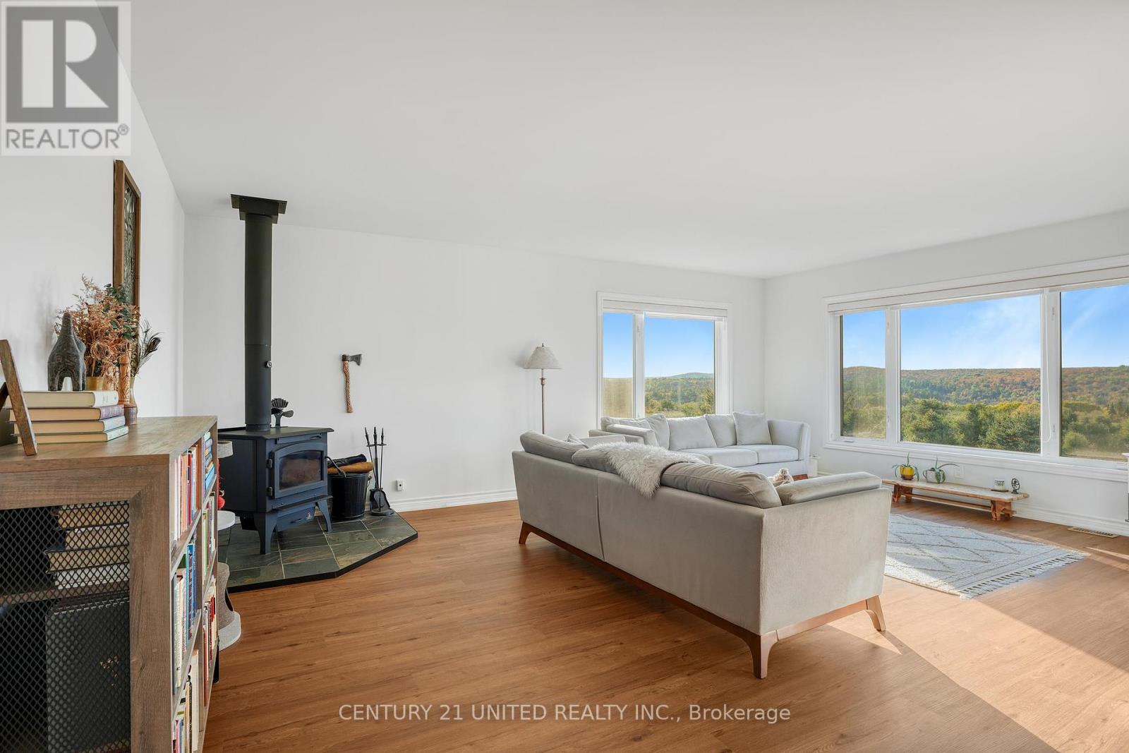 Recently renovated from top to bottom, this lovingly cared for home is expertly located on a beautifully appointed 15 acre lot. One of the most sought after locations in the region with unmatched commanding, panoramic views right from your screened in porch. Offering 4 bedrooms and 3 bathrooms, a tastefully updated kitchen complete with new appliances, a spacious, cozy living room overlooking the grounds and capturing the ever changing dynamic views and a comfortable lower level with walk-out and plenty of storage. Outside the three stall run in shed is versatile with three 10x10 stalls, hydro and water year round. One of the stalls is insulated and separated from the other two. This can easily be retrofitted if desired. The 1 acre paddock is well set up for horses with a ring and separate pasture area. The walking trails on the property allow you to appreciate the diverse terrain. The large vegetable garden, with young fruit trees, is fenced in and draws water from the well or from the rain water storage container beside the garage. Some of the recent renovations include, but are not limited to, Starlink (2023), quartz countertops, sinks, faucets, and a carbon filtered drinking water line in the kitchen (2023), a WETT certified wood stove and chimney (2023), a 16'x6' outdoor firewood shed (2023), and metal roofing on the garage and the house (2023/2024). The recently severed 10 acre lot adjacent to this property is also listed and available to make this a true family retreat. (id:64974)