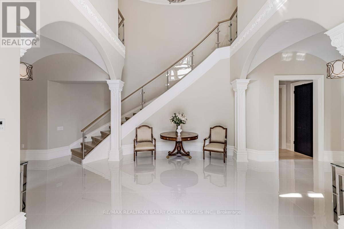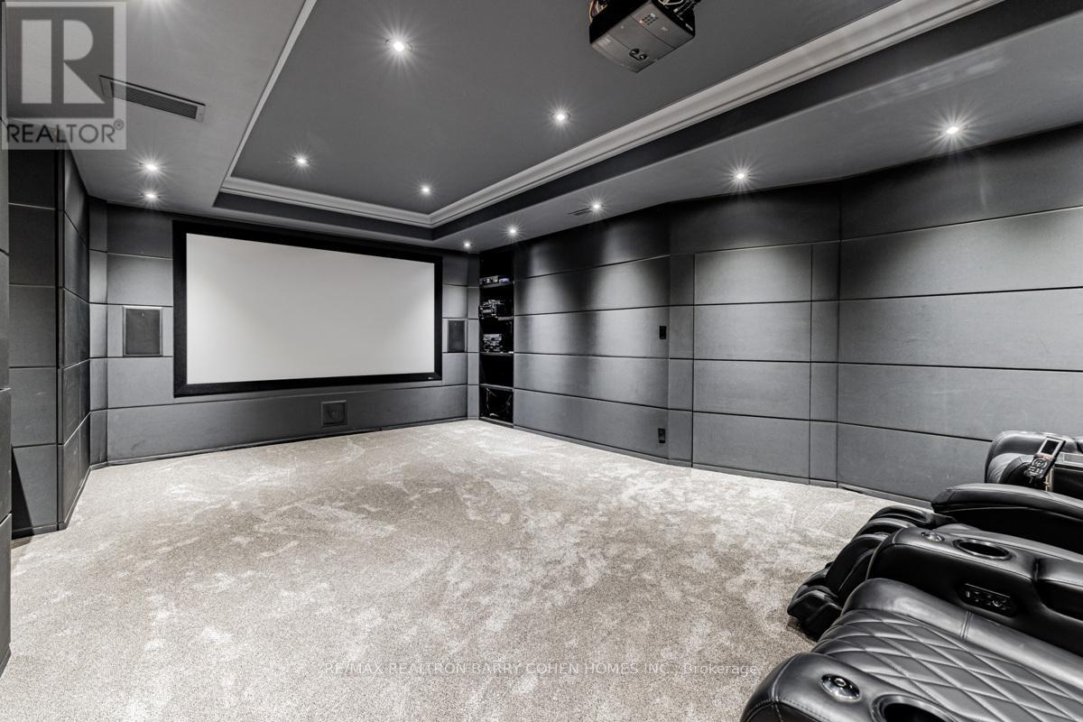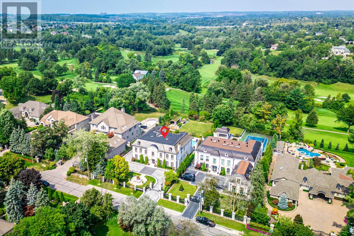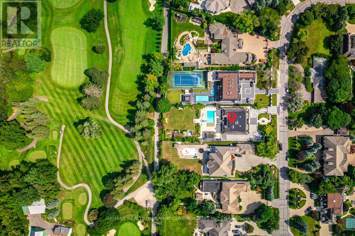 This sprawling, classically designed mansion has a gated front entrance to a circular courtyard with formal gardens with over 10,000 Sq-ft liveable area combined "Lower & upper levels" and lot size of 100 ft X 302 Ft, back to the Prestigious"Thornhill & upland Golf Club" Professionally Interior Designed & Furnished - 6+2 Bedrooms,9 Washrooms- Showcasing A Grand Cathedral Foyer, Magestic Archways And 11 Ft Ceilings with Elevator, Multiple Walk-Outs To Terraces & Enclosed-Veranda Overlook The Backyard Retreat & Swimming Pool Oasis, professional landscaping, heated driveway and surrounding wrought iron fencing with an entrance gate, Kitchen highlights include a hardwood floor, granite counters, a large centre island/breakfast bar with an integrated sink, a pantry, pot lights, a detailed decorative ceiling, custom backsplash, high-end stainless steel appliances, a built-in desk, arched windows, and a sliding door walkout to a covered patio. Off the kitchen is a covered outdoor loggia in Italian with a wood-burning fireplace. The living room features a hardwood floor, crown moulding, a wood-burning fireplace with detailed plaster surround, a ceiling medallion and chandelier, and two arched double garden-door walkouts. In the dining room, highlights include a hardwood floor, crown moulding, a chandelier and two arched windows. The office features rich wood walls, a coffered wood ceiling, wall sconces, floor-to-ceiling built-in shelves, and two double-door walkouts to the front. The backyard has a covered patio, an inground pool, a three-piece bathroom, a cabana, an inground hot tub, a large lanai with a wood-burning fireplace, an outdoor kitchen with stainless steel appliances and a dining area, fountains, gardens, a potting shed, and lawn space. The lower level wine room, a 700-bottle wine cellar, features cabinetry, counter space, exposed brick walls and ceiling, a tile floor, a games room and a soundproof movie theatre.3-car garage and 12 parking spaces. (id:64974)
