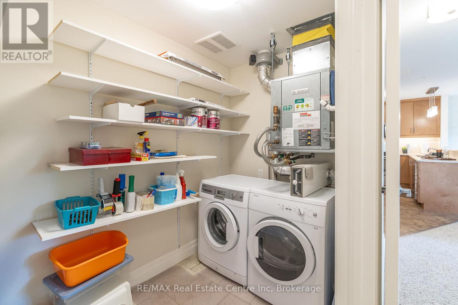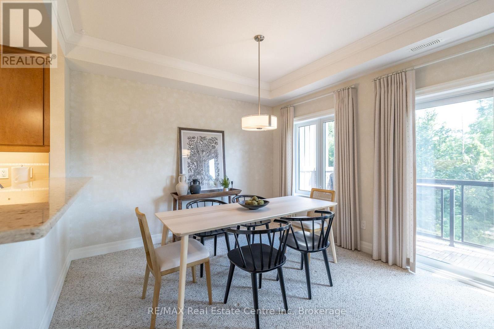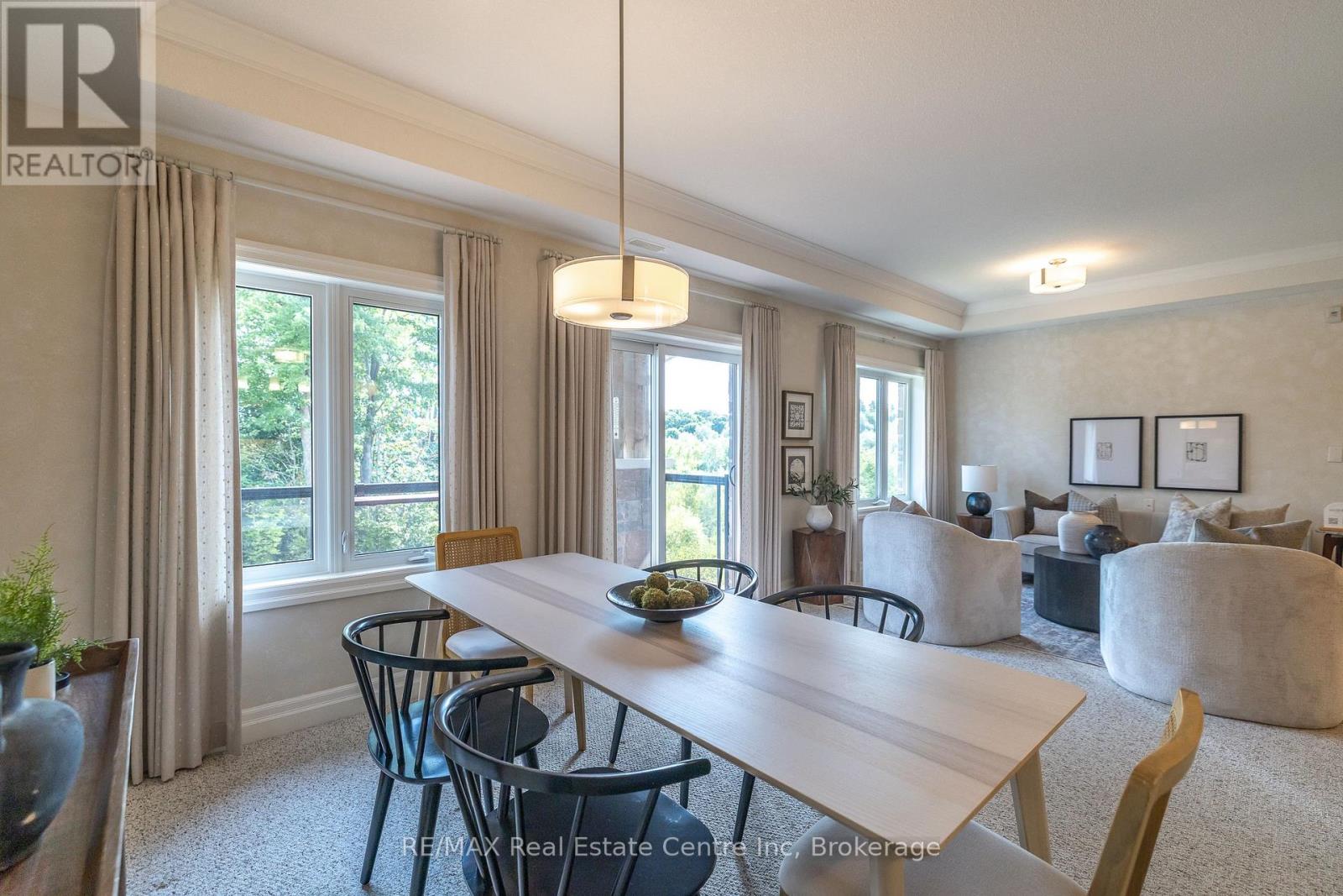 Welcome to Unit 310 at 23 Stumpf Street-where privacy, views, and location come together in one of Elora's most sought-after condo communities. This beautifully maintained two-bedroom, two-bathroom suite offers a rare setting overlooking peaceful greenspace, creating a calm, nature-filled backdrop to everyday living. Inside, the open-concept layout is both functional and inviting, designed for easy living and effortless entertaining. The kitchen is a standout with cork flooring, quartz countertops, stainless steel appliances, and a breakfast bar that flows seamlessly into the dining area and bright living room. Step out through sliding doors to your private patio-perfect for morning coffee or unwinding at the end of the day surrounded by greenery. The primary bedroom features a private ensuite, while the second bedroom offers flexibility for guests, a home office, or multi-purpose use. In-suite laundry, ample storage, an underground parking space, and a locker add everyday convenience. Residents enjoy access to a well-appointed party room and fitness centre, enhancing the lifestyle this building offers. Just steps to downtown Elora, scenic trails, parks, and the Grand River, this location is hard to beat. Whether you're downsizing, investing, or looking for a low-maintenance home in a beautiful setting, this condo delivers exceptional value with a lifestyle to match. (id:64974)