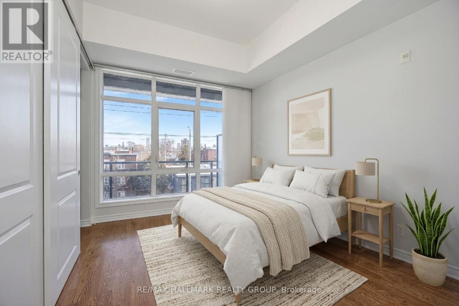 Penthouse 2-bedroom condo offering an unbeatable Westboro lifestyle with exceptional natural light and true turnkey living. Ideally located just steps to Westboro's vibrant shops, restaurants, cafés, and everyday amenities, with quick access to the 417, this boutique-style building offers both convenience and comfort. Inside, you'll find hardwood flooring throughout and a bright, open-concept layout. The stylish kitchen features stone countertops, stainless steel appliances, and a functional design perfect for both everyday living and entertaining. The main living space opens onto a spacious private balcony with eastern exposure, ideal for enjoying sunrise views and unobstructed sightlines. The primary bedroom is generously sized and showcases floor-to-ceiling windows, a large walk-in closet, and a private 3-piece ensuite. The second bedroom offers flexibility as a guest room, home office, or additional living space. A second full 3-piece bathroom, in-unit laundry, and a convenient storage/utility area complete the interior. This unit also includes an exclusive storage locker and underground parking that are owned. The building is pet-friendly, EV charging permitted, underground visitor parking, main-floor gym, beautifully maintained common area gardens and patio. Freshly painted in a modern, neutral palette and updated with contemporary light fixtures and window coverings, this condo is truly move-in ready. (id:64974)