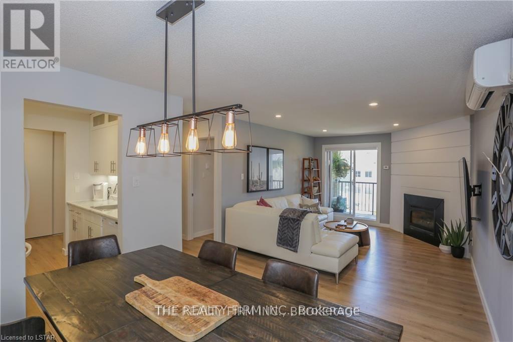 Welcome to this beautifully maintained 3-bedroom, 1.5-bathroom end-unit condo perched on the top floor-offering privacy, natural light, and stylish upgrades throughout.Step inside to a spacious foyer complete with a large hall closet, perfect for everyday organization. The upgraded white kitchen features a modern tile backsplash, under-cabinet lighting, and ample cabinetry, seamlessly flowing into the open-concept dining and living area-ideal for entertaining or relaxing at home.The living room showcases a stunning gas fireplace feature wall, pot lights, and durable laminate flooring, with direct access to your east-facing balcony-the perfect spot to enjoy your morning coffee in the sun.All three bedrooms are generously sized and equipped with closet organizers for maximum storage. The bathrooms have been tastefully updated with ceramic tile finishes, while the in-suite laundry and dedicated storage room add everyday convenience.Additional features include ductless central air (2020) and water included in the condo fees.Located in the highly desirable Pond Mills neighbourhood, residents enjoy direct access to the outdoor pool and close proximity to the highway, hospital, shopping, public transit, and schools-making this an ideal location for commuters and families alike.Please note: Photos are from a previous listing; the property shows in the same condition. (id:64974)