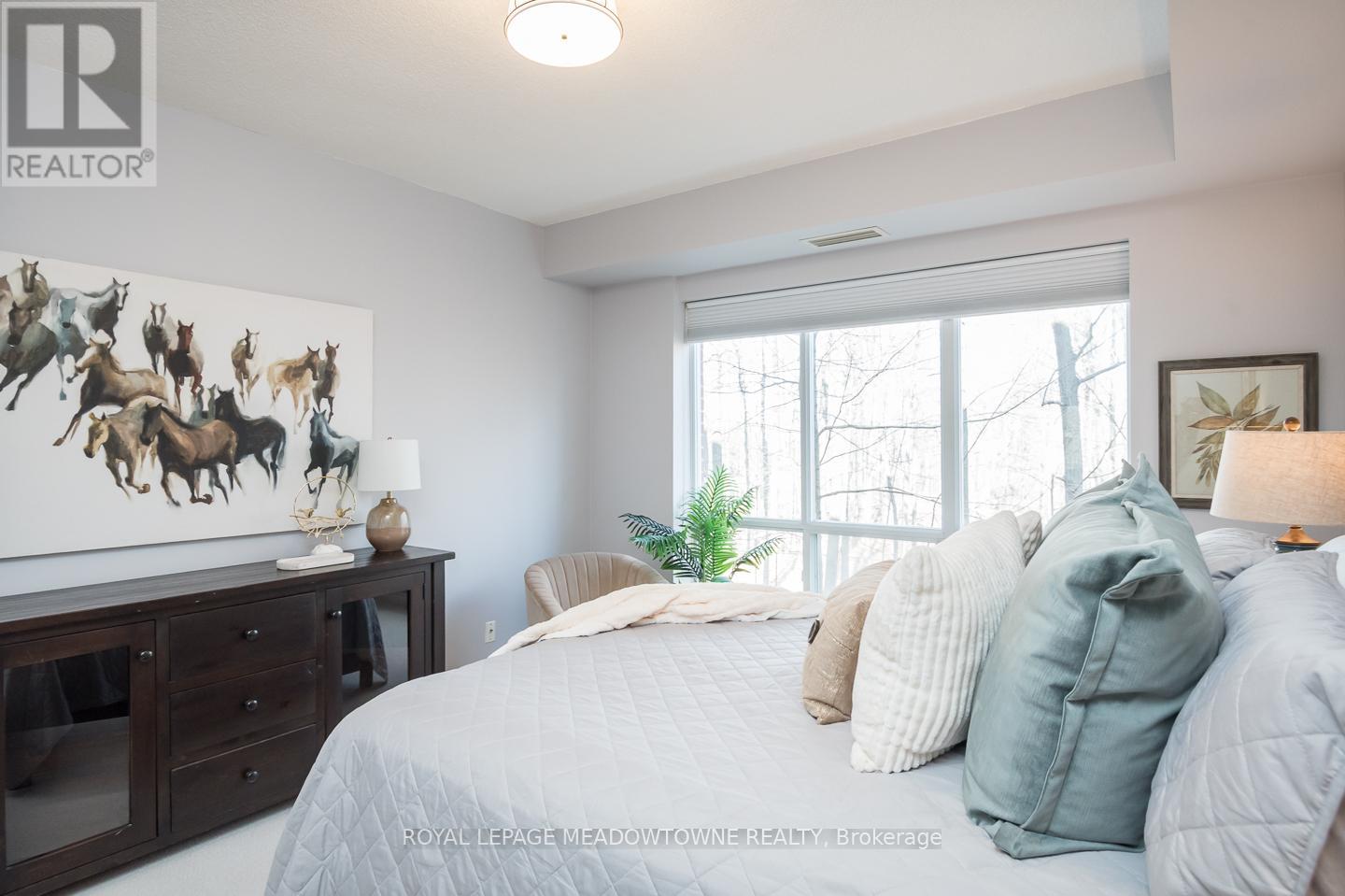 Welcome to this stunning corner unit in the prestigious Woods End Condominiums, ideally located in the sought-after Hurontario neighbourhood of Mississauga. Offering approximately 1200 sq ft of thoughtfully designed living space, this bright and spacious 2-bedroom, 2-bathroom condo showcases beautiful views of the surrounding wooded greenspace. The modern eat-in kitchen features a breakfast bar island, stainless steel appliances, tile backsplash, ample counter space, and direct access to a large private balcony complete with a gas line for BBQs. The open-concept living and dining areas are enhanced with hardwood flooring, upgraded lighting, expansive windows, and a neutral colour palette throughout. The generously sized bedrooms include a primary retreat with a walk-in closet and 4-piece ensuite, along with cozy newly installed carpeting and a large main bath. Enjoy upscale building amenities such as concierge service, guest suites, a party room, and an exercise facility. Conveniently located just minutes from Square One Shopping Centre and the vibrant Heartland area, with easy access to transit, parks, golf, and recreation-this is condo living at its finest. (id:64974)