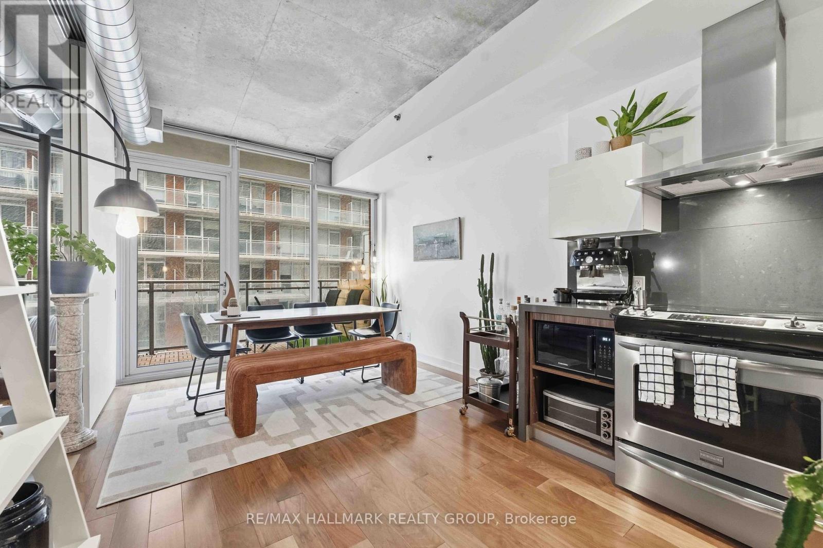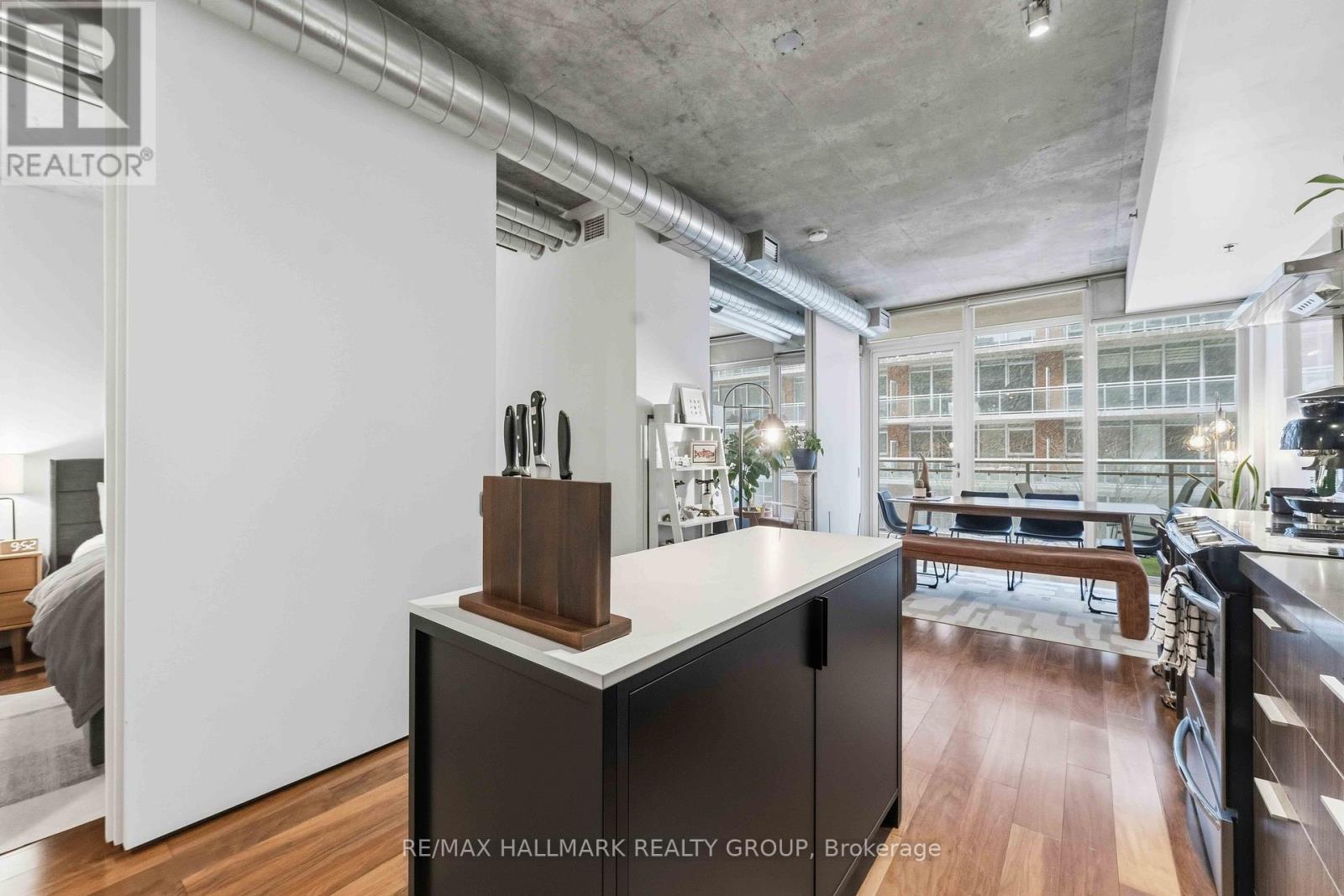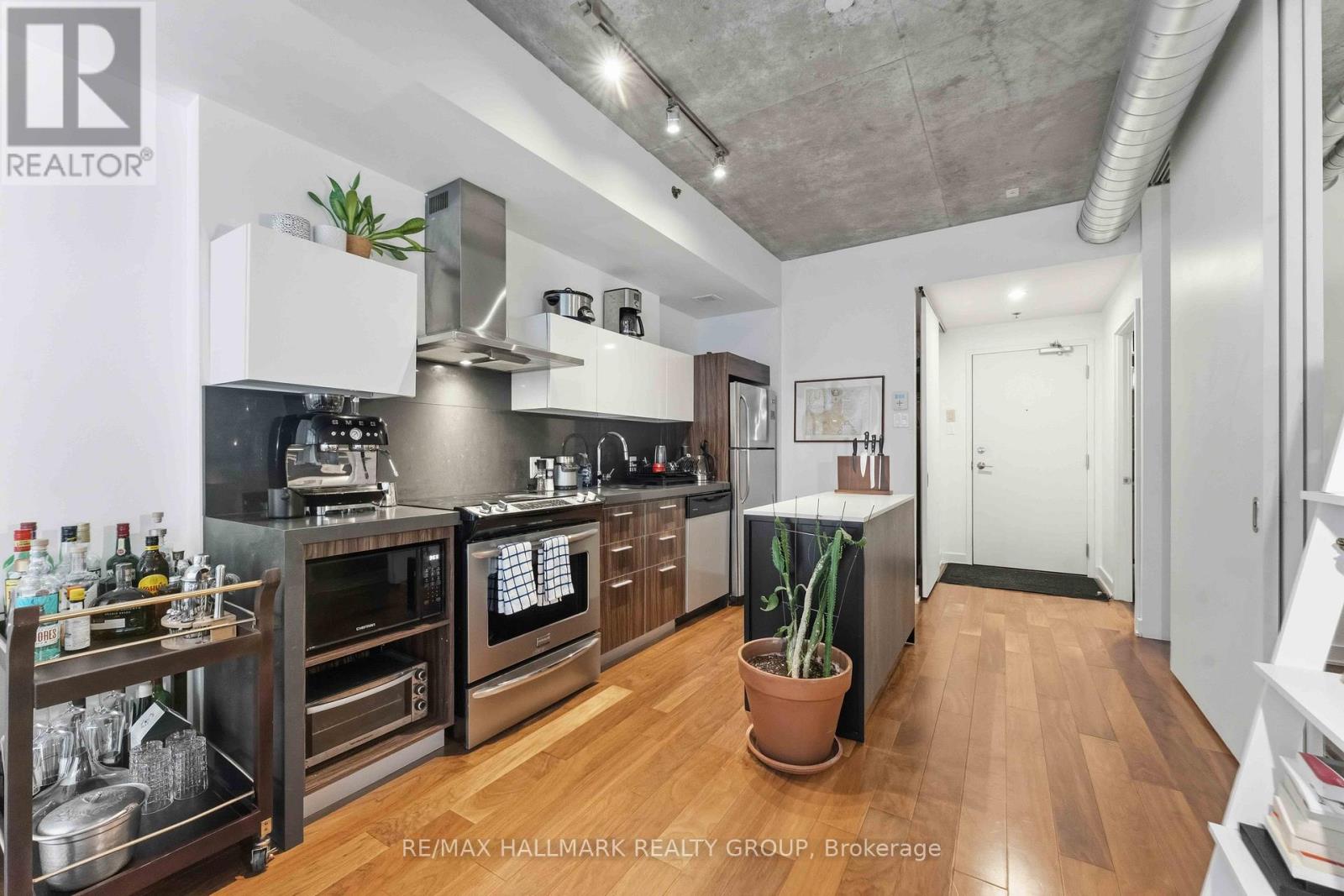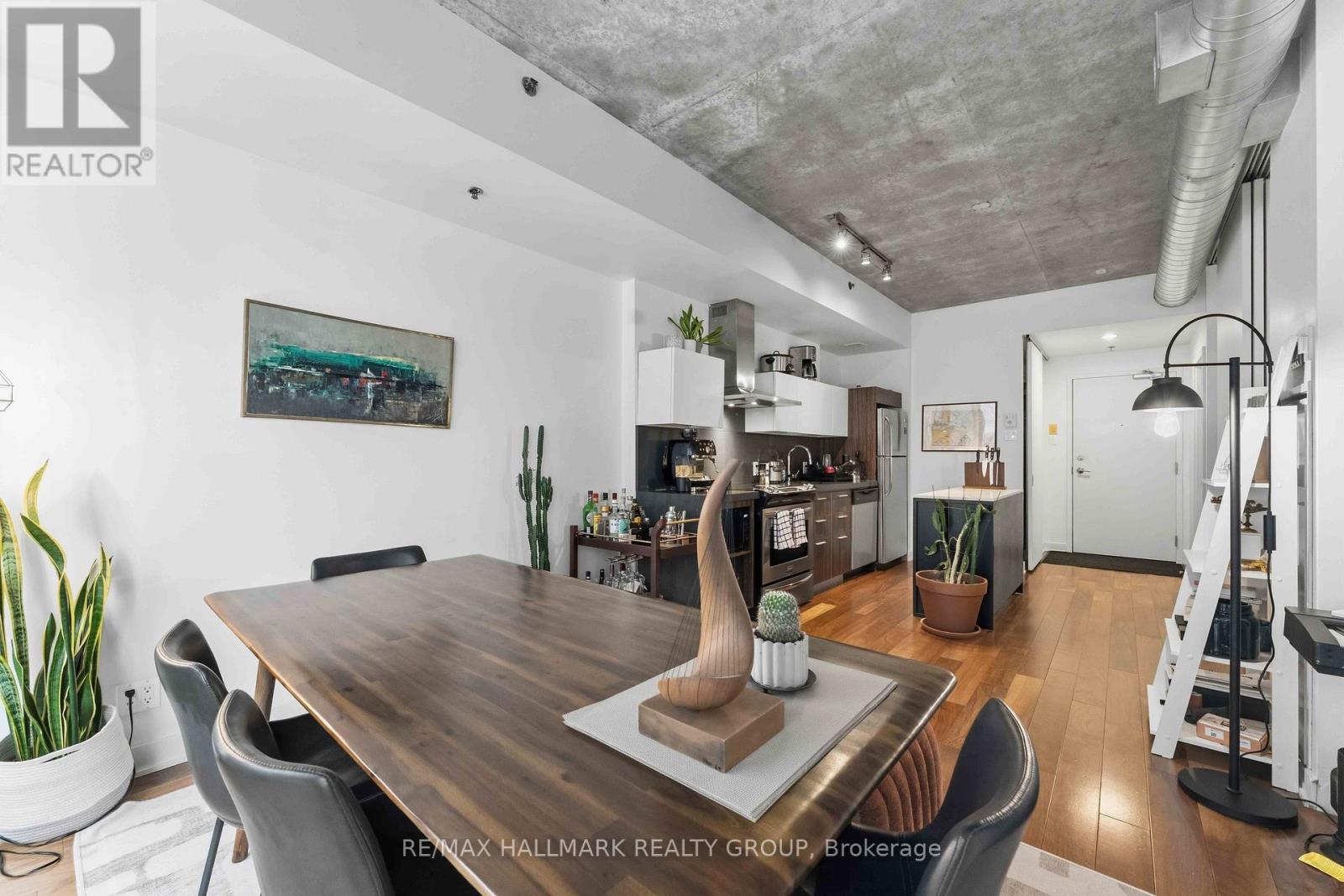 Welcome to Unit 313 at 360 McLeod Street - a stylish and functional 1 bedroom + den condo perfectly located in the heart of Centretown. This thoughtfully designed unit offers an open-concept layout with modern finishes throughout. The sleek kitchen features contemporary cabinetry, stone countertops, and stainless steel appliances, seamlessly flowing into the bright living and dining area - ideal for both everyday living and entertaining. The primary bedroom provides a comfortable retreat, while the versatile den is perfect for a home office, guest space, or cozy reading nook. Enjoy the convenience of in-unit laundry. Step outside to your private balcony - the perfect spot to unwind and take in the vibrant downtown surroundings. Located just steps from shops, restaurants, cafes, parks, and transit, this unbeatable location offers the ultimate urban lifestyle. Condo Fees include heat, water, central a/c, and building insurance. Currently tenanted, with possession available after June 1 - making it a great opportunity for both investors and future homeowners alike. (id:64974)