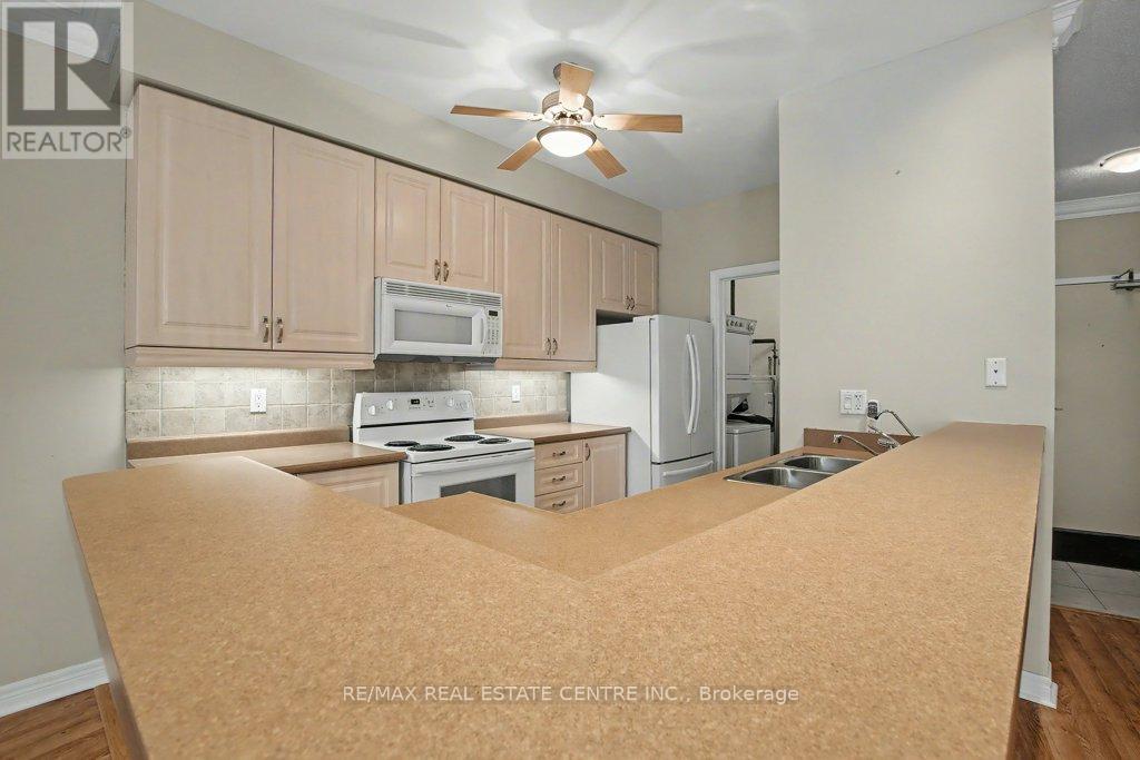 Beautiful open concept unit that fills with natural light from the plentiful windows overlooking a treed ravine. The inviting kitchen with breakfast bar opens to the vast dining room and living room with nine foot ceilings and walkout to 41 foot long balcony. The spacious bedroom is complimented by the convenient ensuite bathroom with long vanity, tub and shower plus a separate easy step in shower. The comfortable den provides options for convenient living. Full size laundry appliances. Additional two piece washroom. Underground parking space and locker. Centennial Forest Heights is a highly desired cozy building with popular meeting and games room for social events. Ideally located close to walking trails, transit and shopping. You/ll love living here. (id:64974)