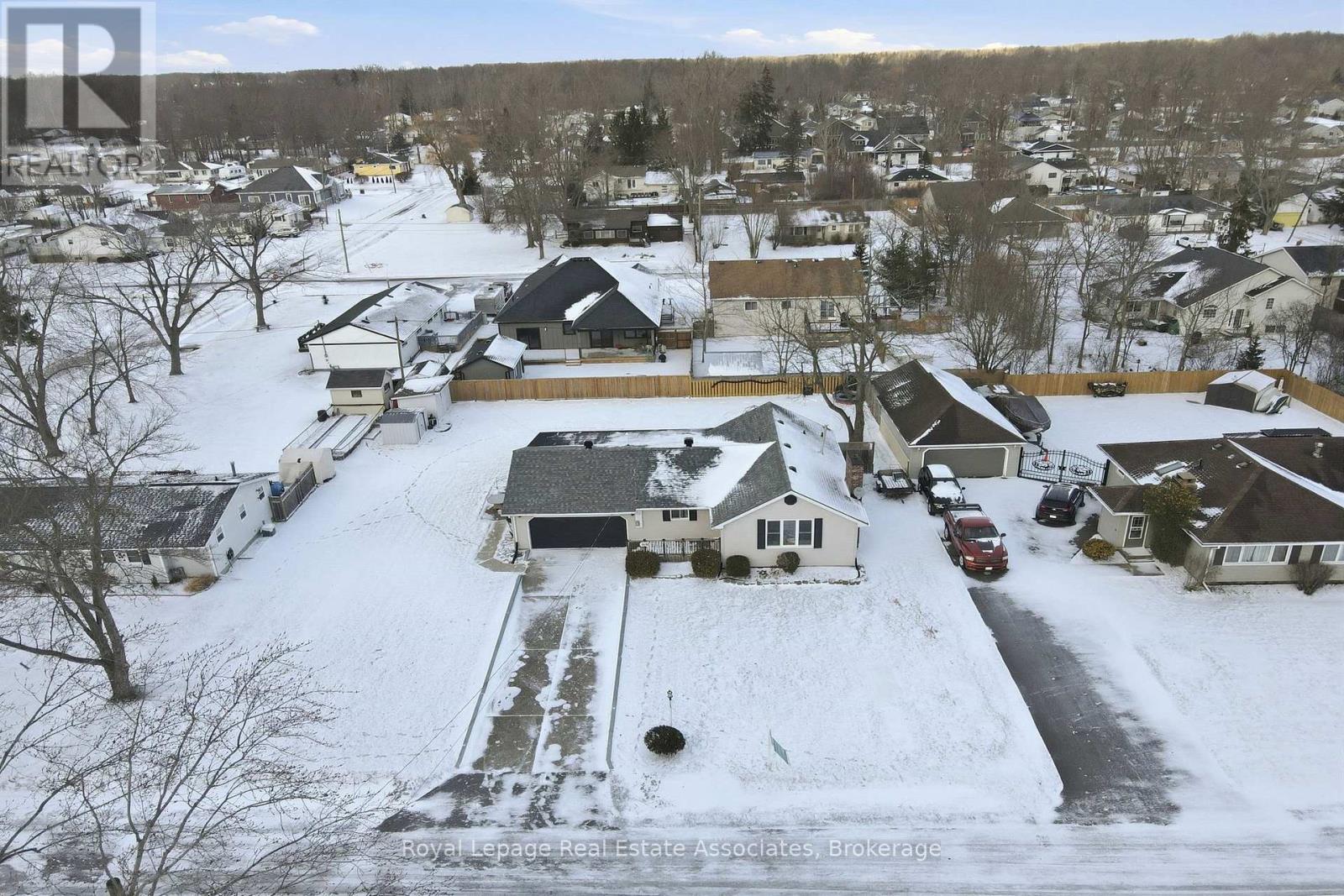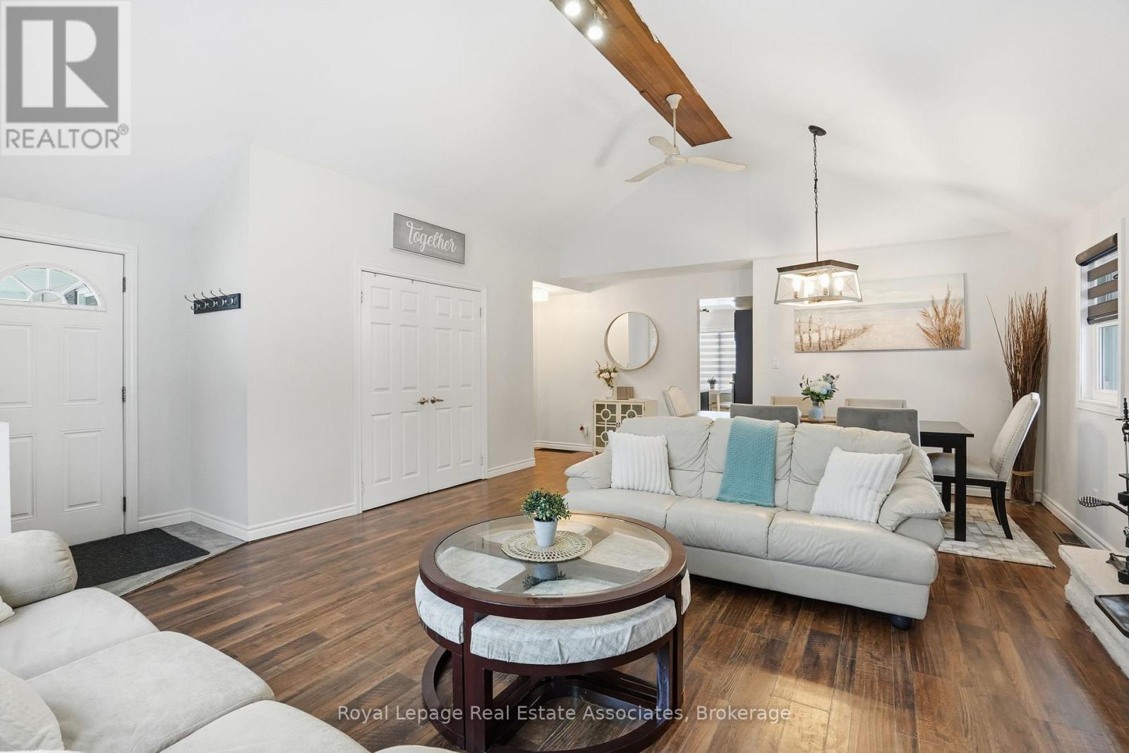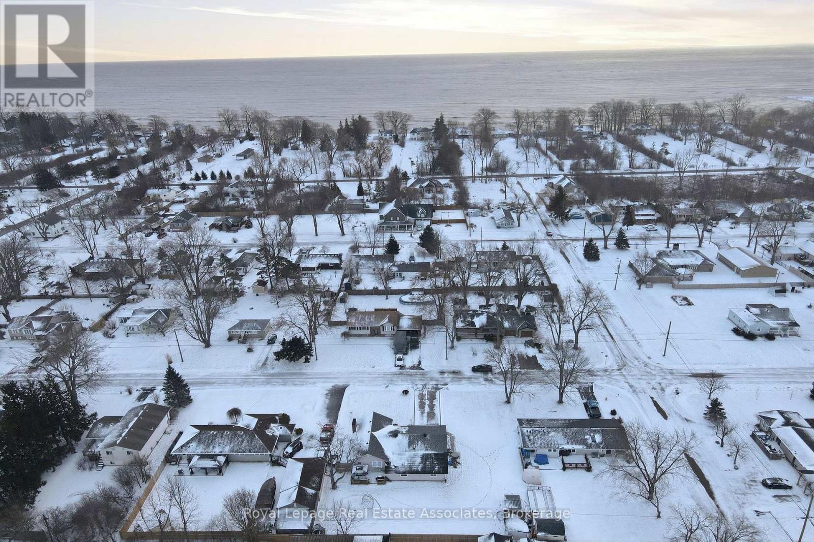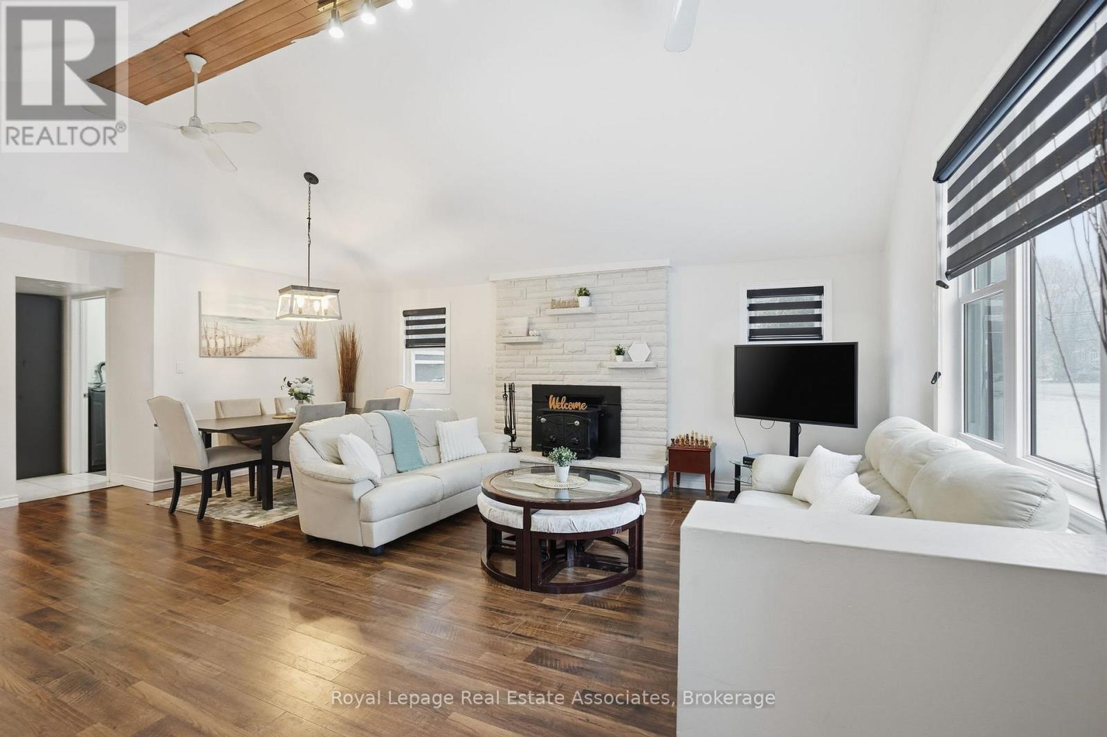 Enjoy one-floor living in a superb location just a short walk to the beautiful beach in upscale Ridgeway. This well-maintained, sprawling bungalow sits on an impressive 104 x 125 lot, offering exceptional space, privacy, and versatility. Inside, you'll find an elegant great room with soaring 12-foot ceilings and a striking brick fireplace, creating a warm and inviting focal point. The large eat-in kitchen offers easy access to the backyard and deck, making it perfect for everyday living and entertaining. The home features three generously sized bedrooms plus a den, ideal for a home office or additional living space. Additional highlights include a huge garage with high ceilings, and a generous concrete driveway with ample parking. A fantastic opportunity in a highly desirable, walkable beachside community. (id:64974)