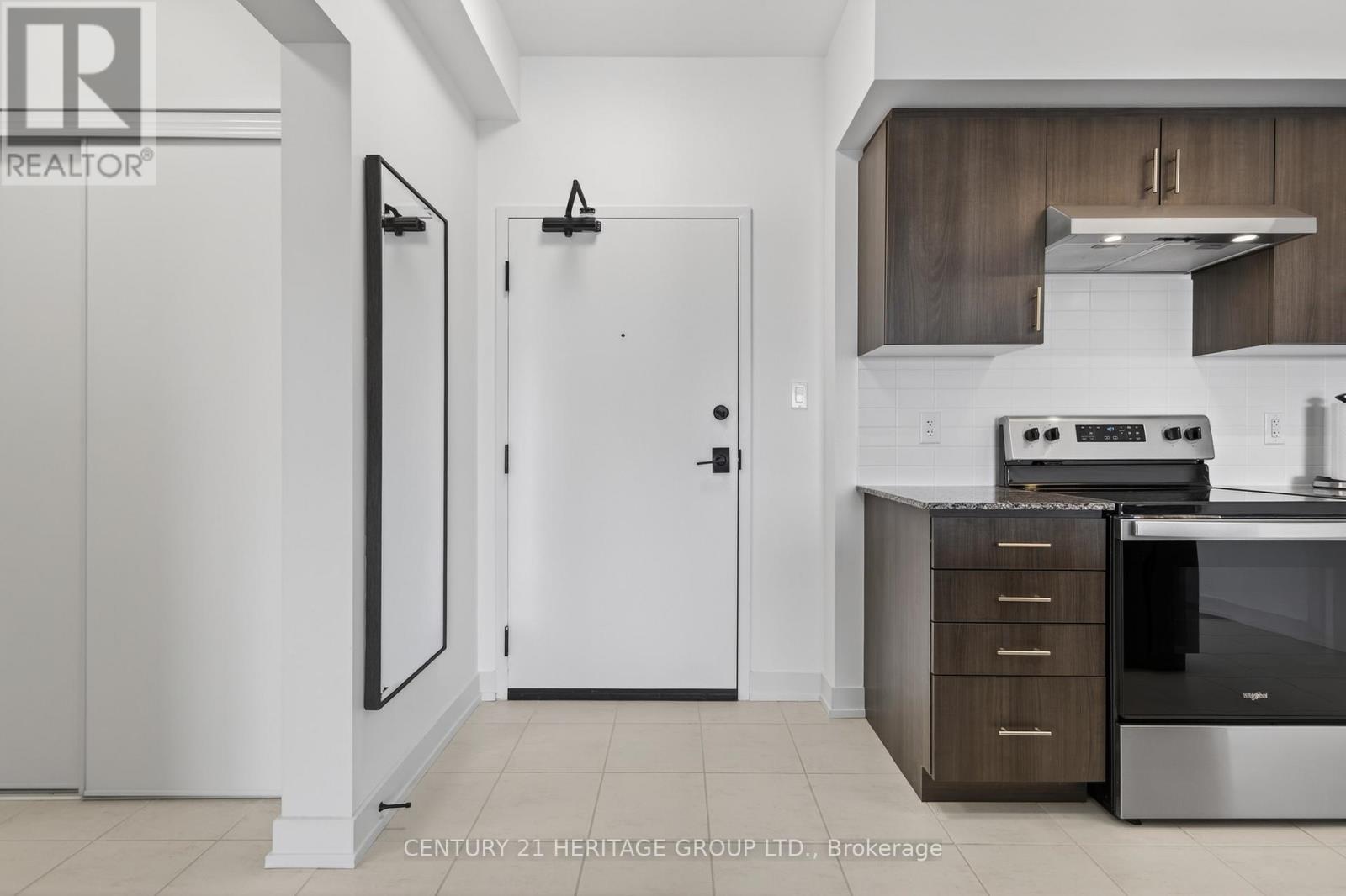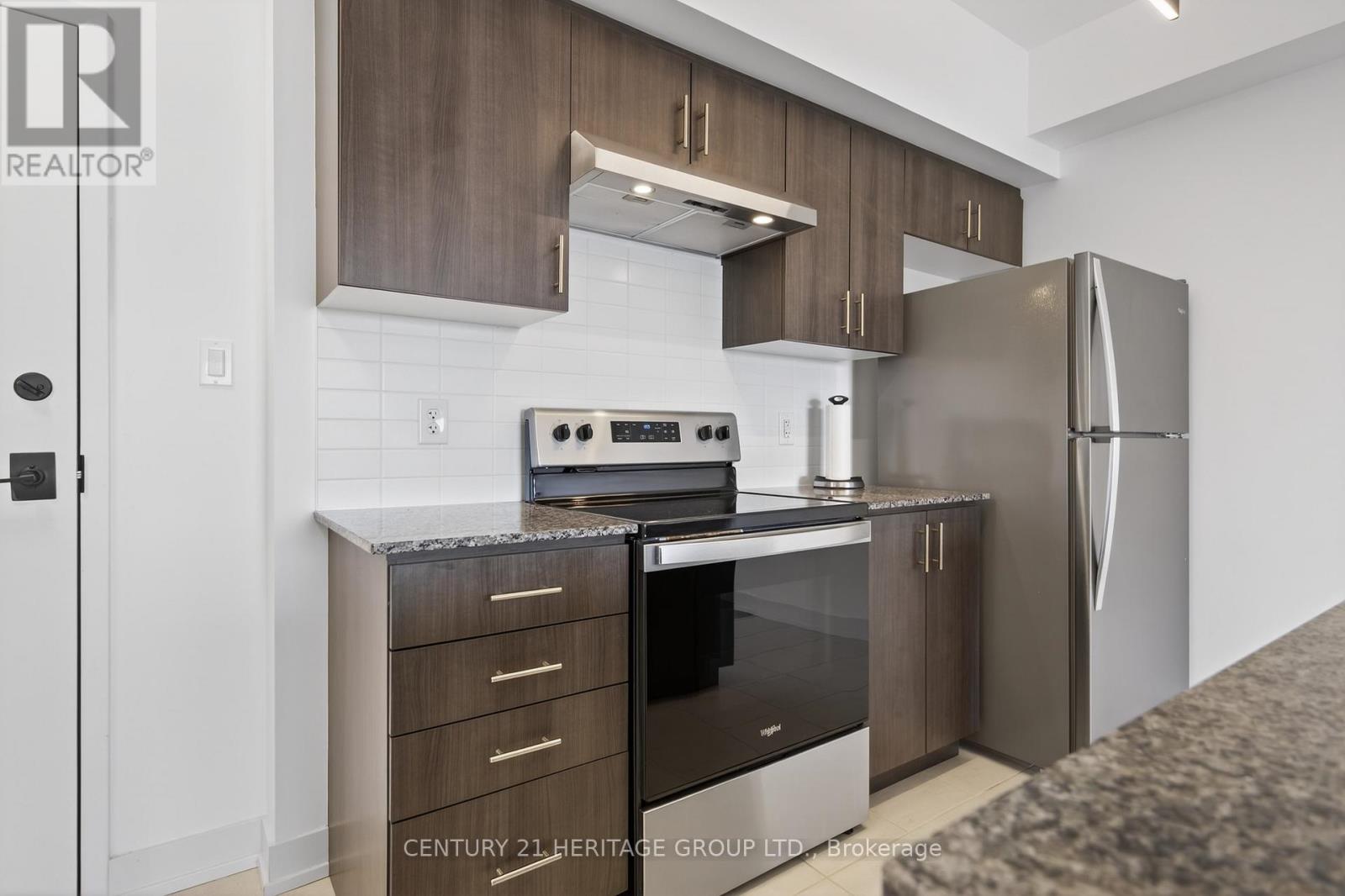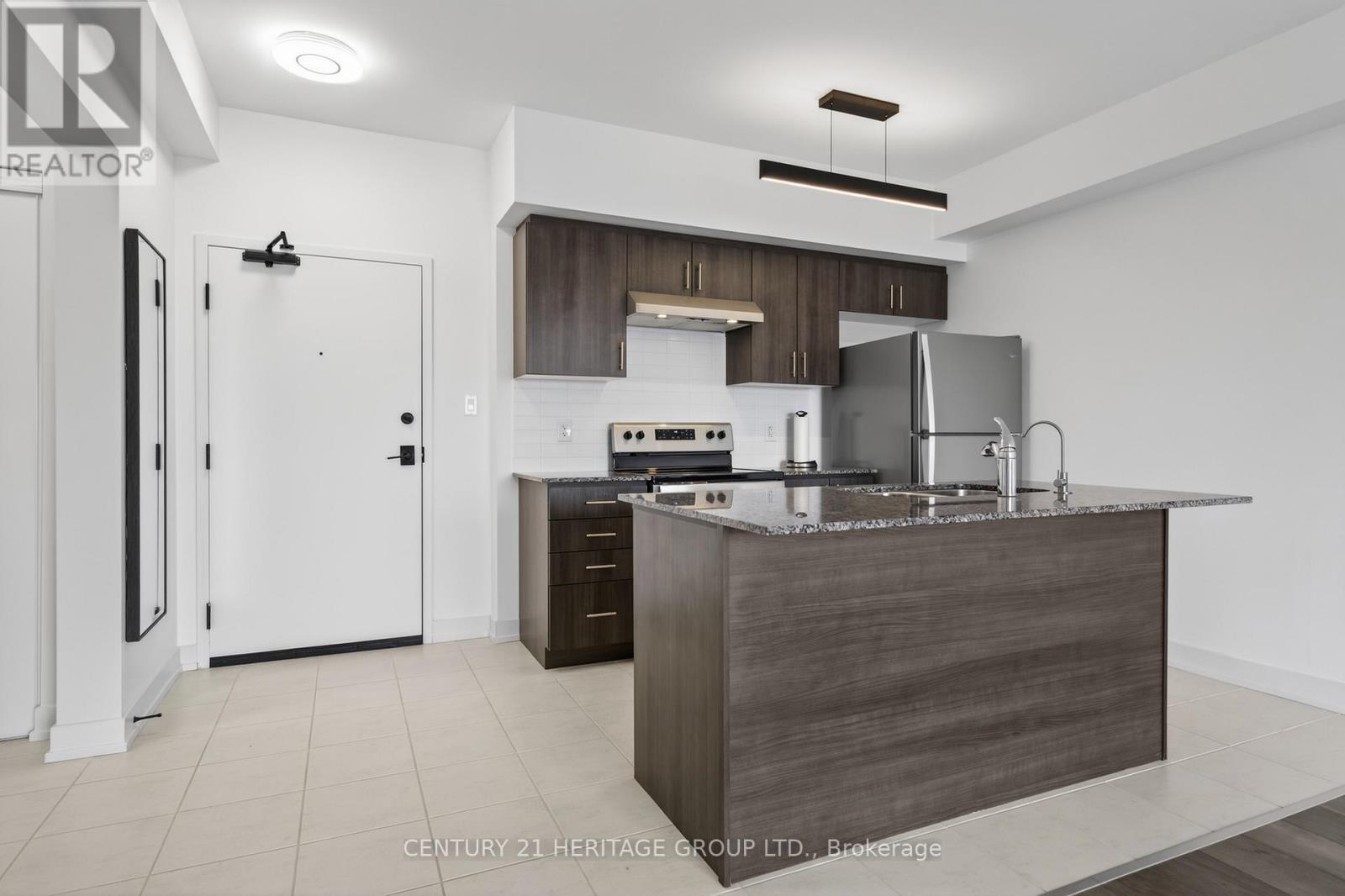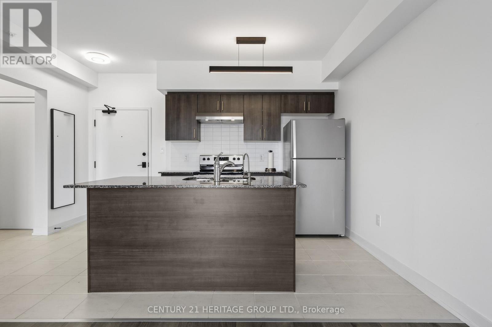 Live in Barrie's popular Bistro 6 community! This bright and modern 1-bedroom + den unit in the Sumac Building offers an open-concept layout with 9 ft ceilings and oversized windows. Enjoy cooking in the stylish kitchen featuring granite countertops and stainless steel appliances and large eat-in centre island. Kitchen overlooks spacious living area with walk out to a private balcony with gas BBQ hookup and covered roof. The unit also features a large primary bedroom with large closet, contemporary bathroom with a spacious glass shower, convenient ensuite laundry, one outdoor parking near front entrance and a versatile separate den ideal for a home office or guest space. Conveniently located very close to Barrie GO Station, Highway 400, shopping, and many local amenities. (id:64974)