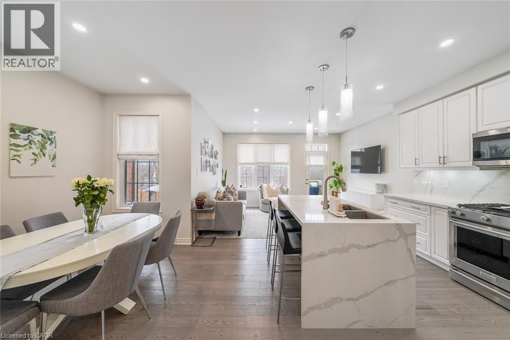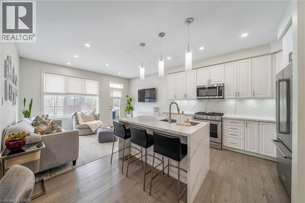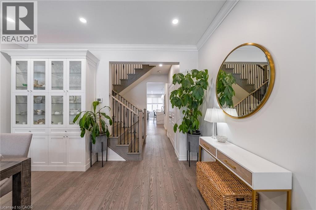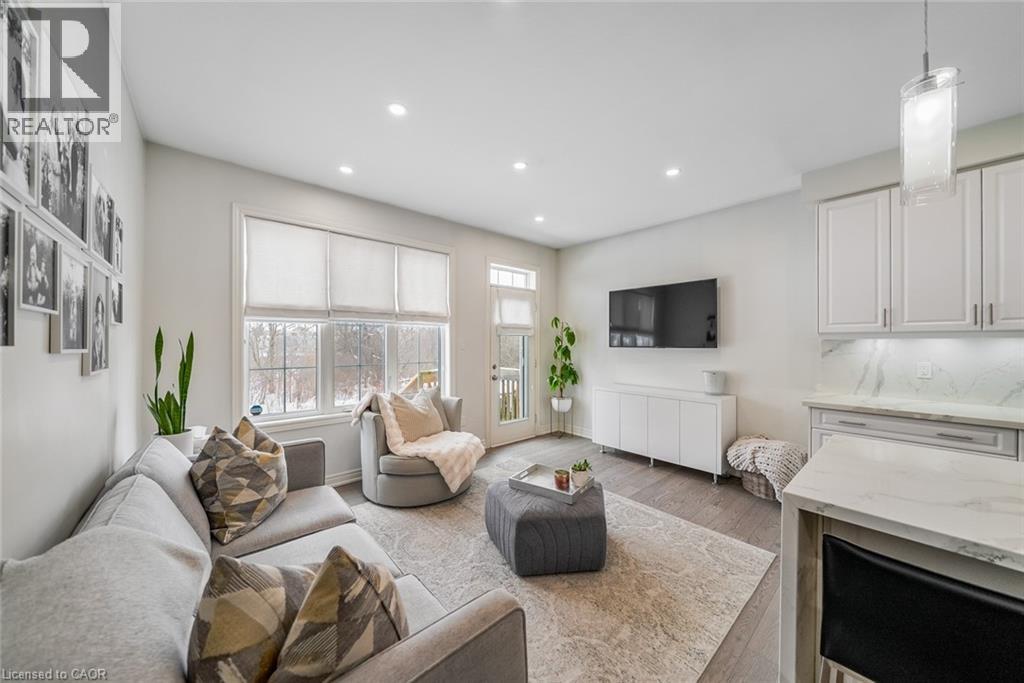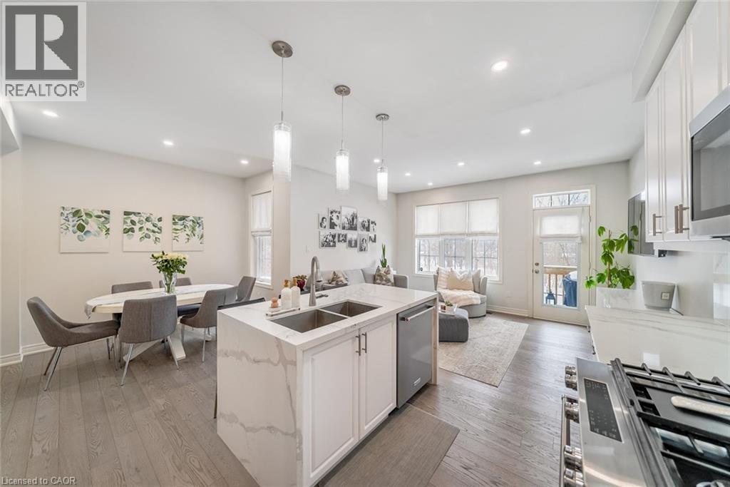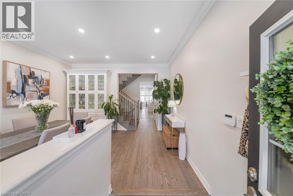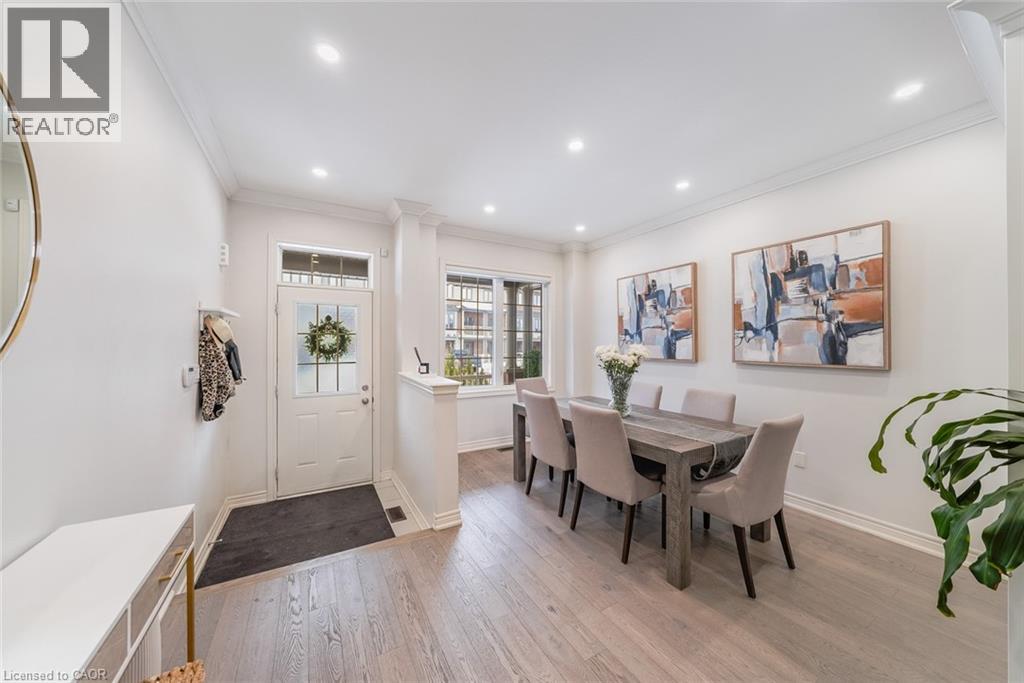 Welcome to this beautifully updated freehold townhome-with no condo fees-backing onto green space with a walking path and uninterrupted views of nature. With forested trails just beyond your fence and serene views from your rear windows, morning coffee walks and evening strolls just got a whole lot better. The fully fenced backyard features newer interlocking stone and mature greenery, creating a private outdoor setting. Inside, the layout truly stands out. The main floor was designed for gathering around the kitchen island, while also offering a separate breakfast area and a formal dining space; this is a rare and highly functional combination in a townhome. The back windows overlook the green space, bringing in natural light and peaceful views year-round. Extensively updated throughout, the home features hardwood flooring, pot lights, updated appliances, quartz countertops, smart switches, and several thoughtful modern upgrades. Exceptional storage can be found across every level of the home. Upstairs there are three generously sized bedrooms, two full bathrooms, and a beautifully renovated laundry room with quartz countertops, custom cabinetry, and backsplash. The spacious primary suite includes a beautifully reimagined ensuite that was reconfigured to allow for a larger shower and a more functional layout. The finished basement adds even more versatility with a full bathroom, recreation space, and additional storage; a perfect additional space for entertaining, guests, or a home gym. The garage adds exceptional functionality with overhead storage and a thoughtfully designed layout that has interior access through a separate transition space; so you’re not stepping directly into the main living area; along with rare direct access to the backyard, making outdoor living and yard maintenance easy! Thoughtfully updated and meticulously maintained, this home delivers space, smart design, privacy, and lifestyle in one of Waterdown’s most desirable communities (id:64974)