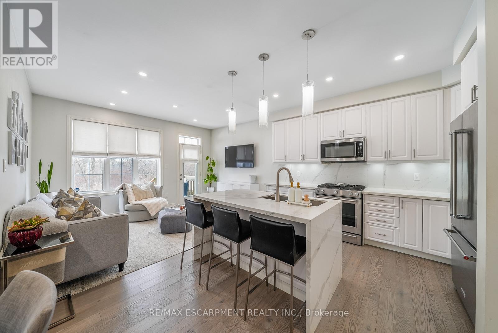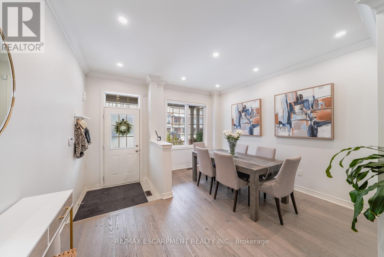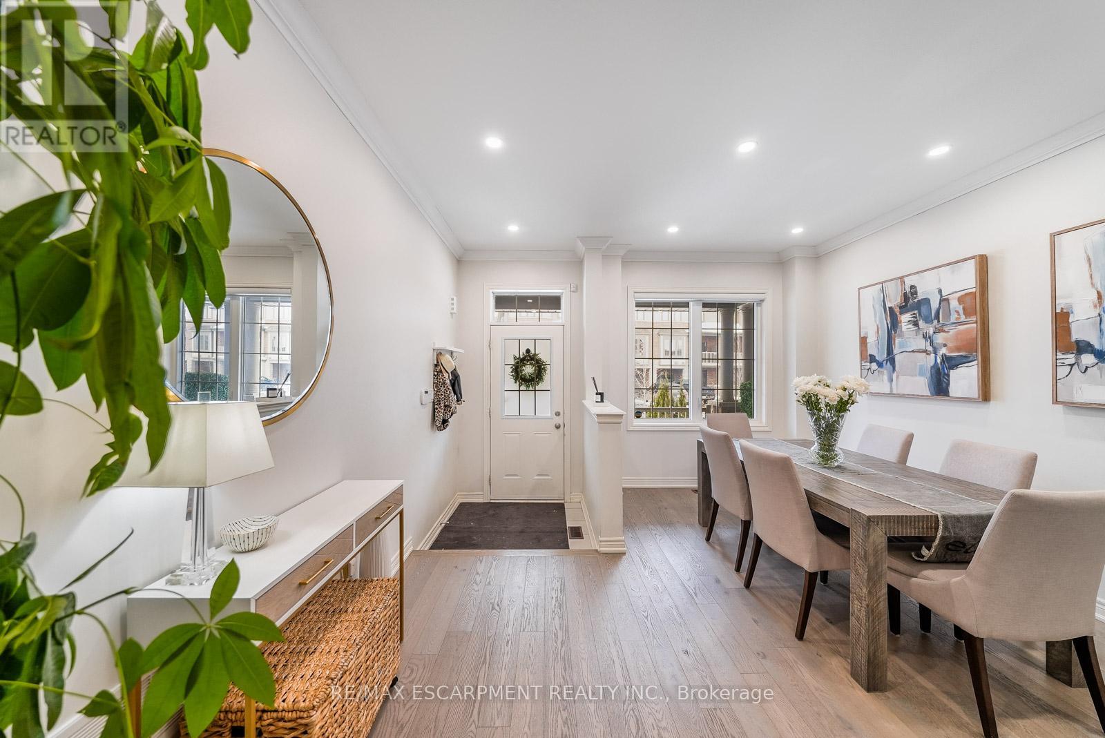 Welcome to this beautifully updated freehold townhome - with no condo fees - backing onto green space with a walking path and uninterrupted views of nature. With forested trails just beyond your fence and serene views from your rear windows, morning coffee walks and evening strolls just got a whole lot better. The fully fenced backyard features newer interlocking stone and mature greenery, creating a private outdoor setting. Inside, the layout truly stands out. The main floor was designed for gathering around the kitchen island, while also offering a separate breakfast area and a formal dining space; this is a rare and highly functional combination in a townhome. The back windows overlook the green space, bringing in natural light and peaceful views year-round. Extensively updated throughout, the home features hardwood flooring, pot lights, updated appliances, quartz countertops, smart switches, and several thoughtful modern upgrades. Exceptional storage can be found across every level of the home. Upstairs there are three generously sized bedrooms, two full bathrooms, and a beautifully renovated laundry room with quartz countertops, custom cabinetry, and backsplash. The spacious primary suite includes a beautifully reimagined ensuite that was reconfigured to allow for a larger shower and a more functional layout. The finished basement adds even more versatility with a full bathroom, recreation space, and additional storage; a perfect additional space for entertaining, guests, or a home gym. The garage adds exceptional functionality with overhead storage and a thoughtfully designed layout that has interior access through a separate transition space; so you're not stepping directly into the main living area; along with rare direct access to the backyard, making outdoor living and yard maintenance easy! Thoughtfully updated and meticulously maintained, this home delivers space, smart design, privacy, and lifestyle in one of Waterdown's most desirable communities (id:64974)