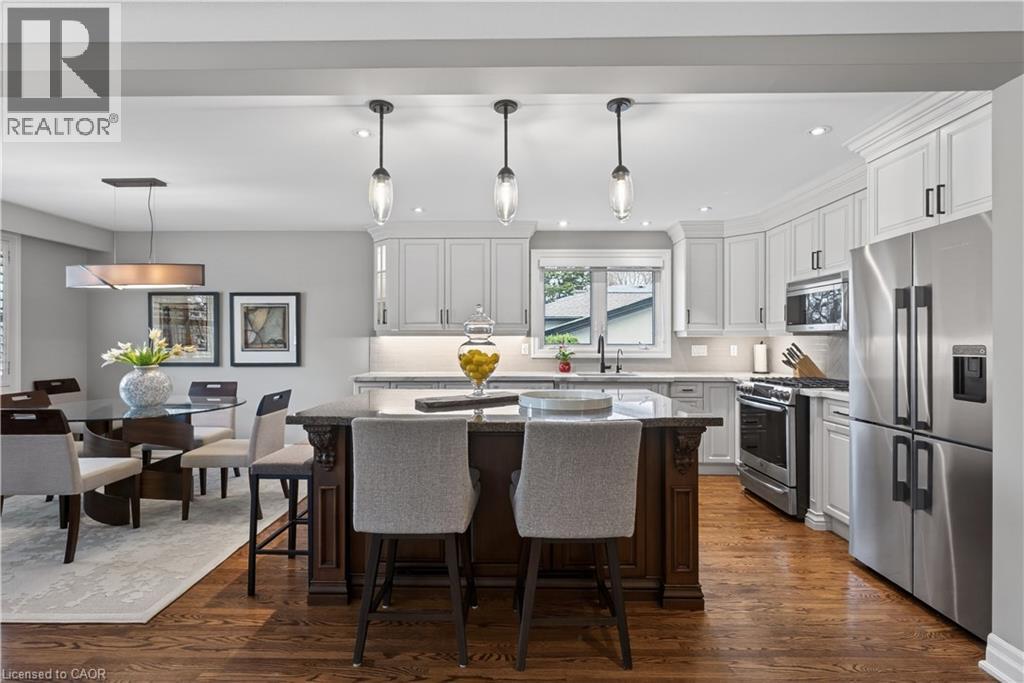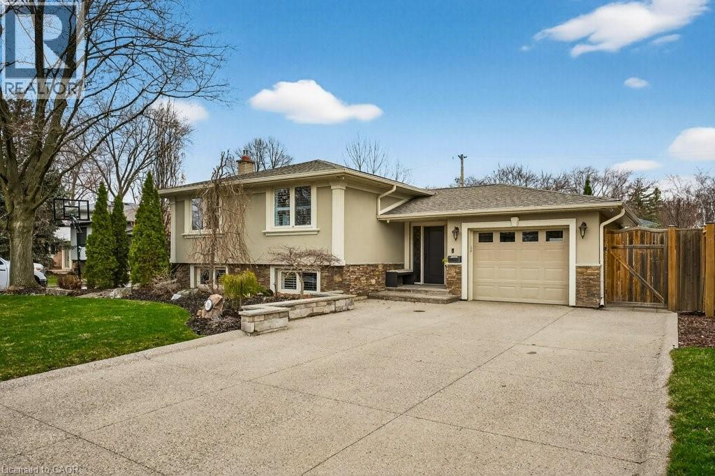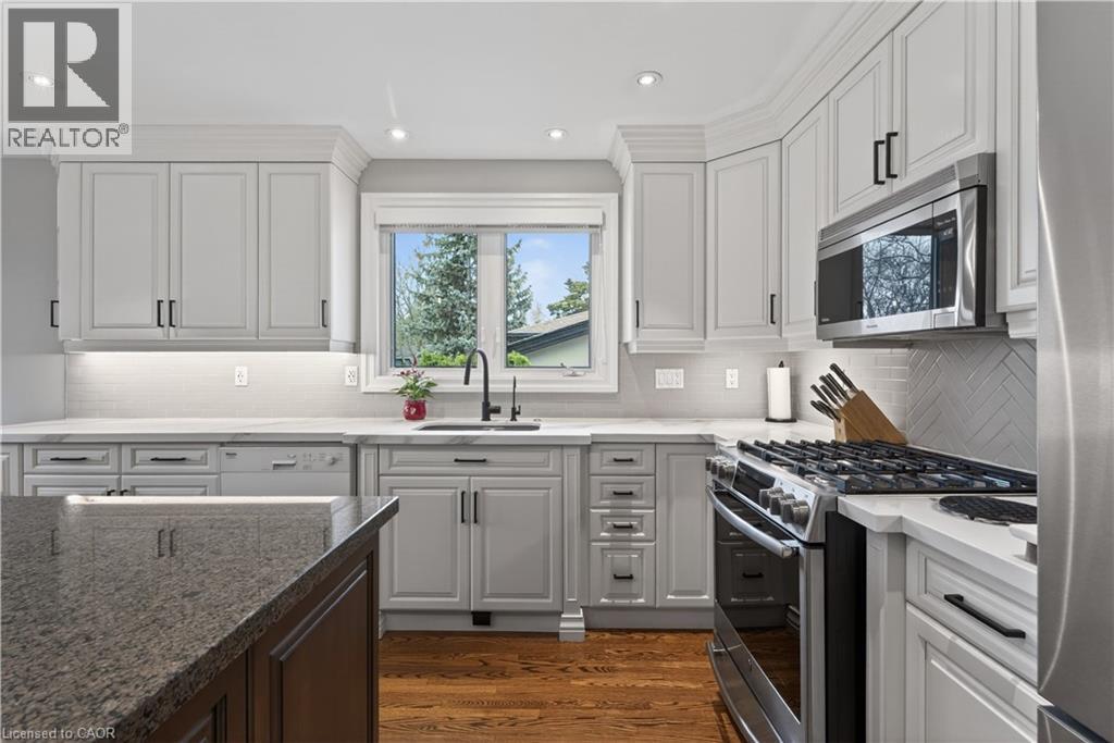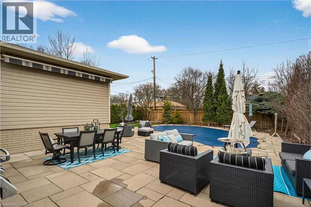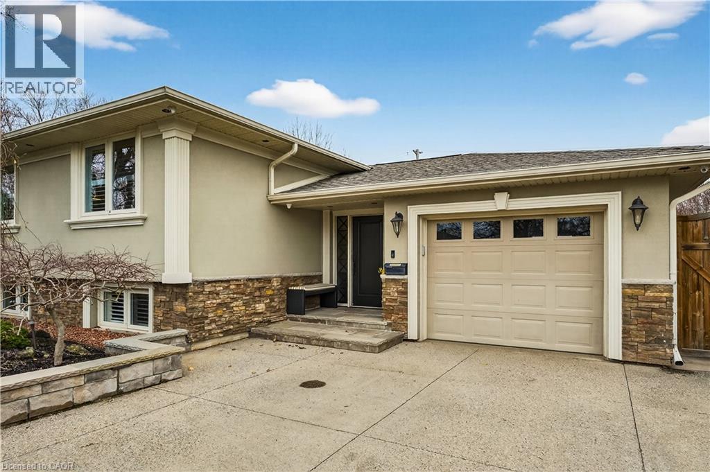 Set in Shoreacres, one of South Burlington's most sought-after neighbourhoods, this home has been purposefully updated in a way that shows the moment you walk in. The main level is open and easy to move through. The beautifully renovated kitchen sits at the heart of it, and offers a large island with seating, gas stove, custom cabinetry that runs floor to ceiling, and warm pendant lighting that catches the hardwood floors below. The flow between kitchen, dining, and living is the kind you notice only when it's missing. Solid wood interior doors, pocket doors, and thoughtful built-ins throughout speak to how this home has been improved over time — every update was carefully selected and cared for. The primary suite is a standout: a fully renovated ensuite with double sinks, heated floors, and a walk-in shower finished in large-format tile that feels more boutique hotel than subdivision. Three bedrooms on the main level; the smallest is currently a custom walk-in closet with built-ins, easily returned to a bedroom. The lower level is one of those spaces that earns a second look. Partially above grade, it reads bright and welcoming rather than below ground. A stone fireplace anchors the family room — built-in wine fridge, comfortable scale, and enough room to actually settle in. A fourth bedroom with real light and a three-piece bath with glass-enclosed shower and heated floors that match the finish level of everything above it. Then there's the backyard. A well-planned interlock stone patio with room for dining, lounging, and gathering. Mature trees and hedging that took years to grow and provide genuine privacy. A private saltwater pool at the centre of it all. This is the kind of outdoor space that makes a Burlington summer feel like exactly what it should. Heated garage. Double-wide aggregate driveway. Fully fenced. Close to sought-after schools, parks, transit, and highway access. The work is done. This one is move in ready. (id:64974)