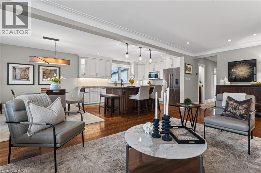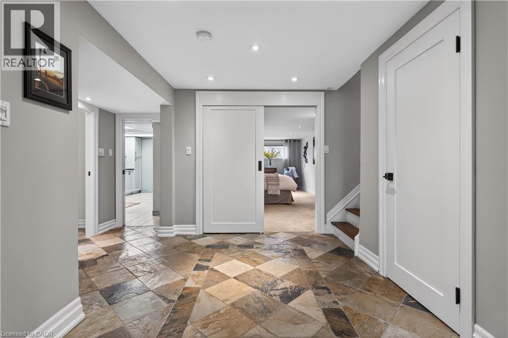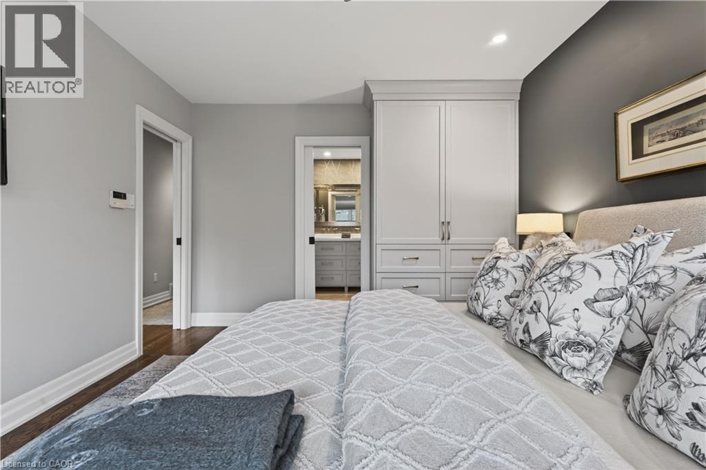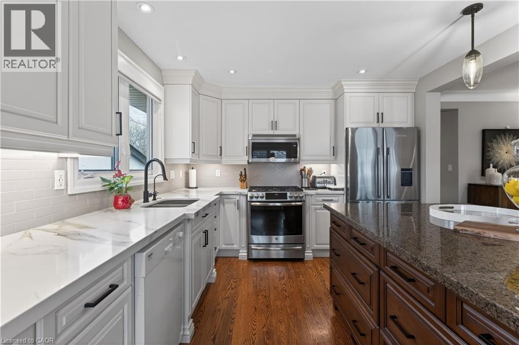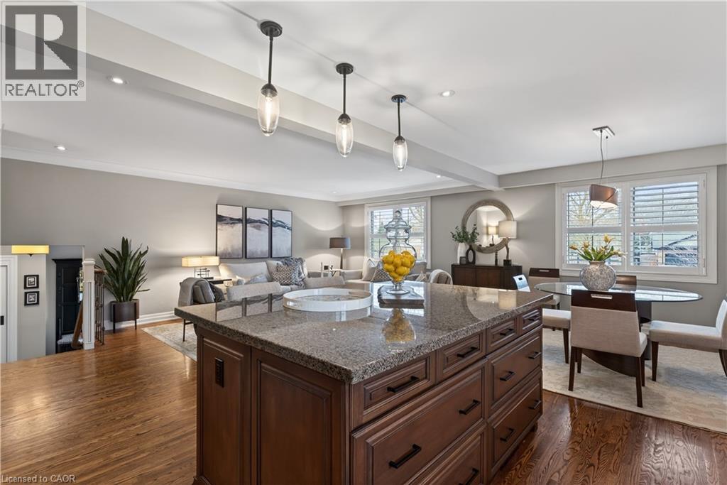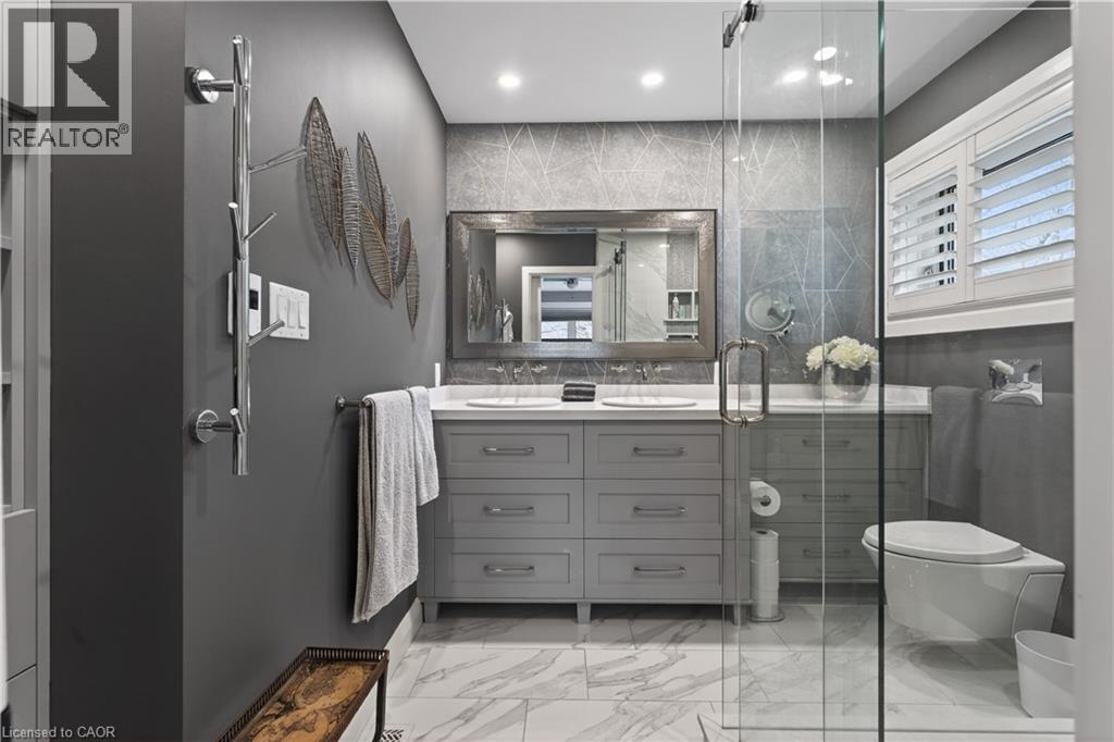 Set in Shoreacres, one of South Burlington's most sought-after neighbourhoods, this home has been purposefully updated in a way that shows the moment you walk in. The main level is open and easy to move through. The beautifully renovated kitchen sits at the heart of it, and offers a large island with seating, gas stove, custom cabinetry that runs floor to ceiling, and warm pendant lighting that catches the hardwood floors below. The flow between kitchen, dining, and living is the kind you notice only when it's missing. Solid wood interior doors, pocket doors, and thoughtful built-ins throughout speak to how this home has been improved over time — every update was carefully selected and cared for. The primary suite is a standout: a fully renovated ensuite with double sinks, heated floors, and a walk-in shower finished in large-format tile that feels more boutique hotel than subdivision. Three bedrooms on the main level; the smallest is currently a custom walk-in closet with built-ins, easily returned to a bedroom. The lower level is one of those spaces that earns a second look. Partially above grade, it reads bright and welcoming rather than below ground. A stone fireplace anchors the family room — built-in wine fridge, comfortable scale, and enough room to actually settle in. A fourth bedroom with real light and a three-piece bath with glass-enclosed shower and heated floors that match the finish level of everything above it. Then there's the backyard. A well-planned interlock stone patio with room for dining, lounging, and gathering. Mature trees and hedging that took years to grow and provide genuine privacy. A private saltwater pool at the centre of it all. This is the kind of outdoor space that makes a Burlington summer feel like exactly what it should. Heated garage. Double-wide aggregate driveway. Fully fenced. Close to sought-after schools, parks, transit, and highway access. The work is done. This one is move in ready. (id:64974)
