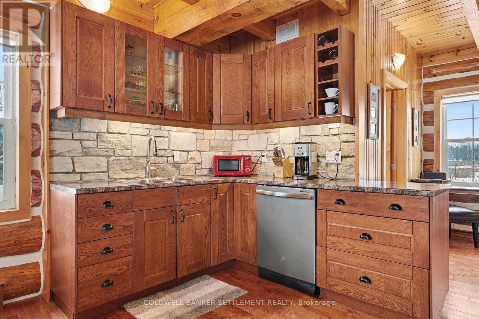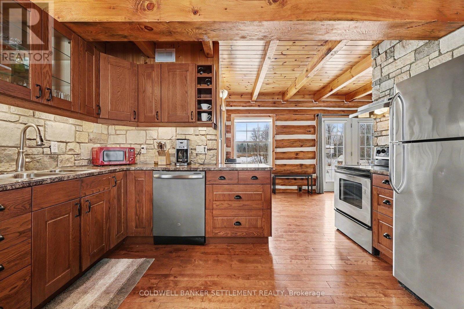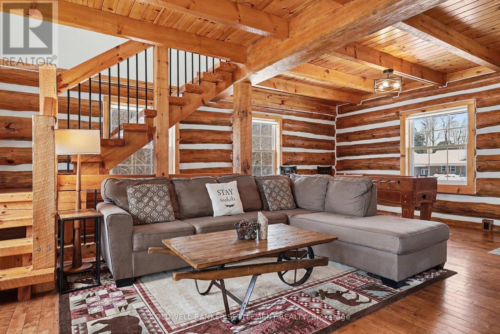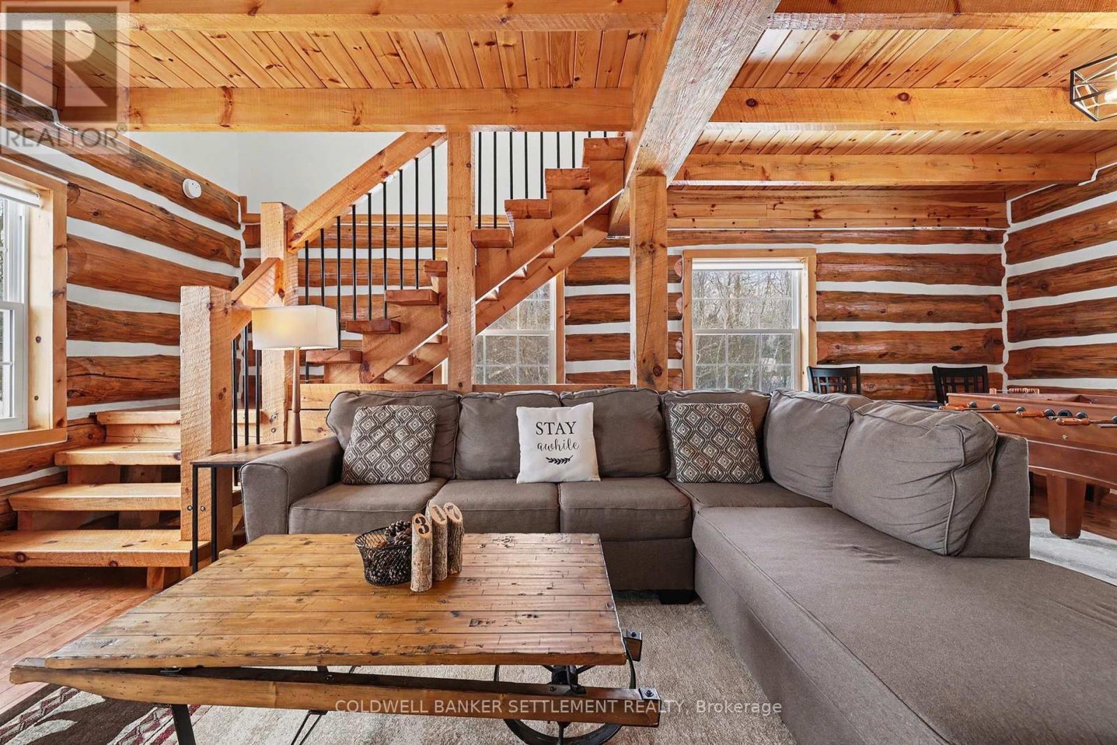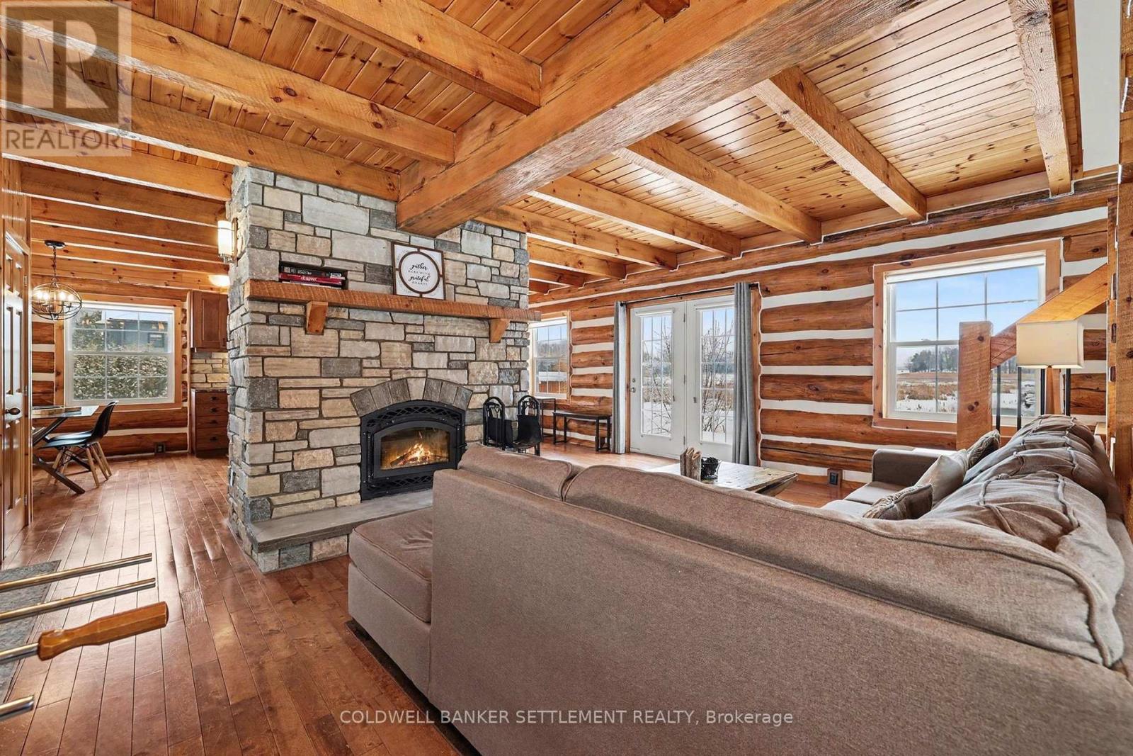 Experience waterfront living on Big Rideau Lake. This detached log home offers a rare blend of rustic elegance and turnkey comfort, providing the perfect retreat for those seeking relaxation, character, and unforgettable lakefront serenity. Featuring 3 bedrooms and 2 bathrooms, the home is offered fully furnished and thoughtfully equipped with everything needed to embrace the lake lifestyle - from outdoor entertaining furniture and BBQs to kayaks ready for your next adventure on the water. Inside, the main floor is both warm & welcoming, with a bright eat-in kitchen, convenient main floor laundry + 2 piece bathroom, an open living room anchored by a magnificent stone fireplace - a true statement piece & gathering area. Patio doors lead seamlessly to a beautiful stone patio, ideal for grilling dinner, or peaceful mornings overlooking the lake. Don't miss the pergola offering shade & an outdoor dining space. The second level has an additional sitting area or den at the top of the stairs - a perfect space for quiet relaxation & reading plus 3 lovely bedrooms (two of them have amazing views down the lake). Enjoy the ease of year-round access on a paved municipal road, complete garbage & recycling pick-up right at the door - a rare convenience! Perfectly situated just 12 minutes to the charm of Heritage Perth, with a boat launch just down the road and the Rideau Ferry Store and restaurant only a short drive - or scenic boat ride - away. Whether you're cruising the lake from your dock or paddling along the shoreline, this is a wonderful setting to truly enjoy the best of life on Big Rideau Lake. (id:64974)