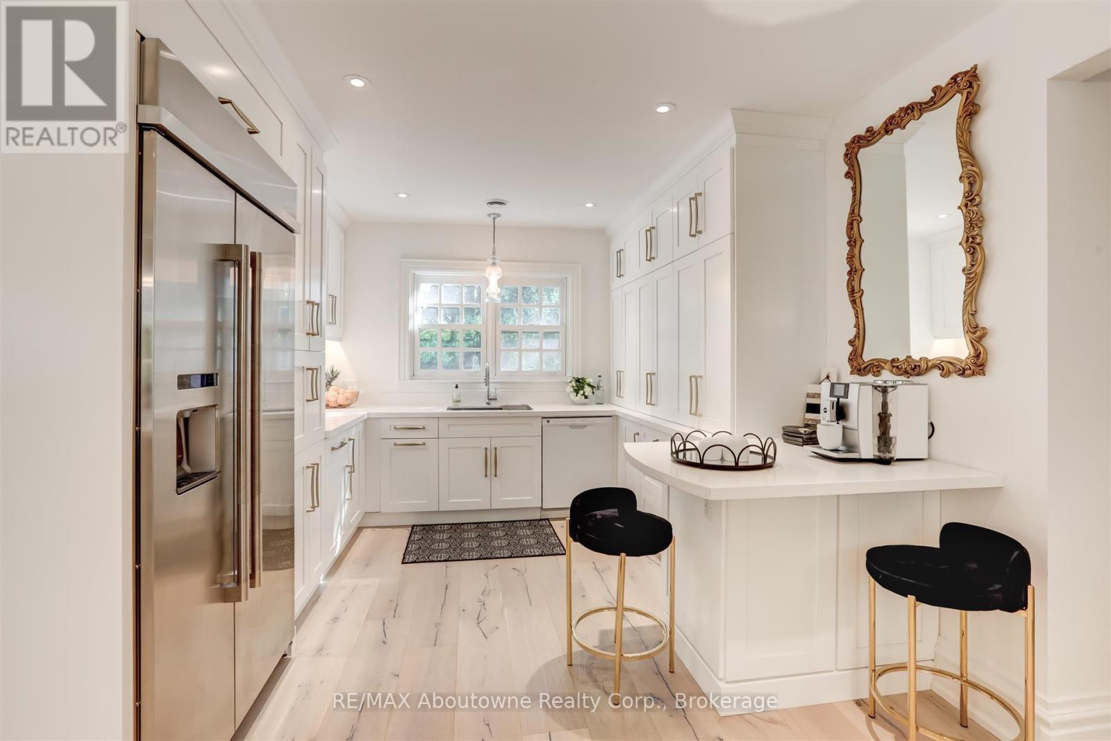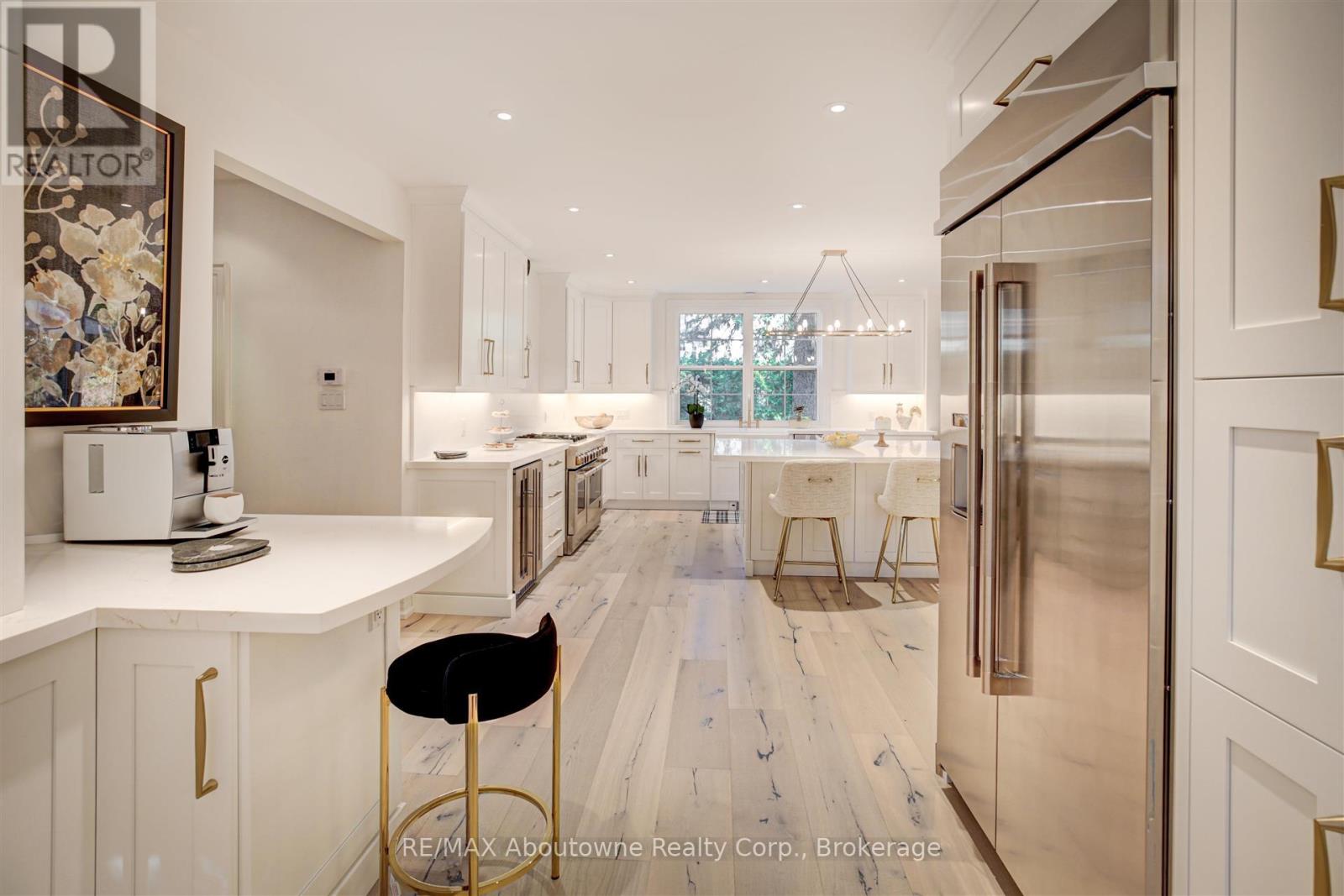 Transitional Elegance in the Heart of Olde Oakville. A rare property on one of the community's most coveted streets. Experience refined living in this exceptional residence- set on a triple lot over 1/2 acres with an impressive 154.73 ft frontage, curated for those who value privacy, design and indoor-outdoor living at its finest. Beautifully reimagined in 2024, the main level showcases a sophisticated blend of transitional elegance and casual upscale comfort, perfect for both everyday living and effortless entertaining. A Main Floor Redesigned for Modern Luxury. Step inside to wide-plank oak hardwood floors, luxurious finishes, and stunning sightlines to the property's park-like grounds. The brand-new designer kitchen is a true showpiece, featuring: Main kitchen+ second "messy kitchen" for concealed prep, storage, and small appliances. Silk granite farmhouse sink with brushed gold gooseneck faucet and gold hardware accents throughout.- Oversized picture window overlooking the gardens. Square island with integrated fridge/freezer drawers. Quartz countertops & full-height backsplash in both kitchens. Built-in wine/beverage station. Dedicated coffee bar. A walk-out from the dining room and a large picture window open to views of the serene screened-in sun porch, creating a seamless flow for indoor-outdoor enjoyment. The magnificent great room features dramatic cathedral ceilings, a stone wood-burning fireplace (forced-air assist) with aged beam mantel, and wiring/rough-ins for a full theatre- quality sound system. A second walk-out continues to the sun porch- offering year-round enjoyment framed by nature. Flexible living spaces: Third floor loft/suite ideal for guests, teens, studio or office.4+1 bedrooms, 4 bathrooms, and over 5200 sq ft of total finished living space. Finished basement with heated floors in media room (or current gym). Dust-free heat system with individually controlled room zones. **Remarks continued in Attachments (id:64974)