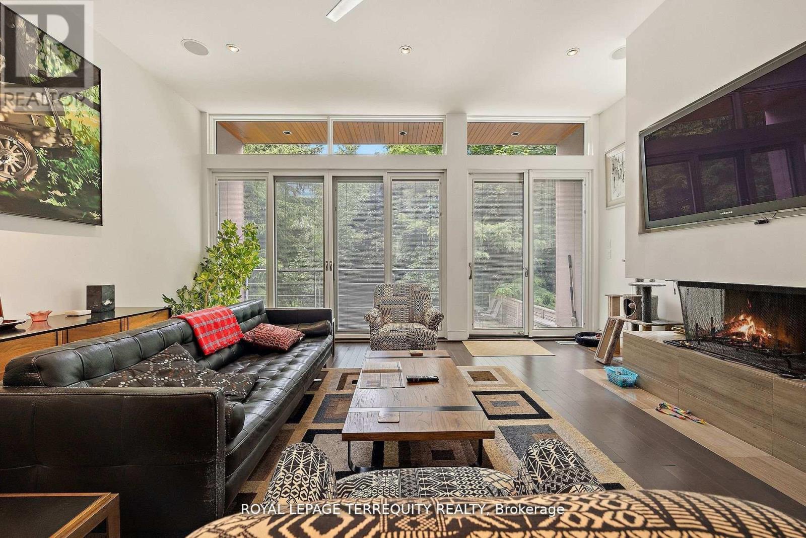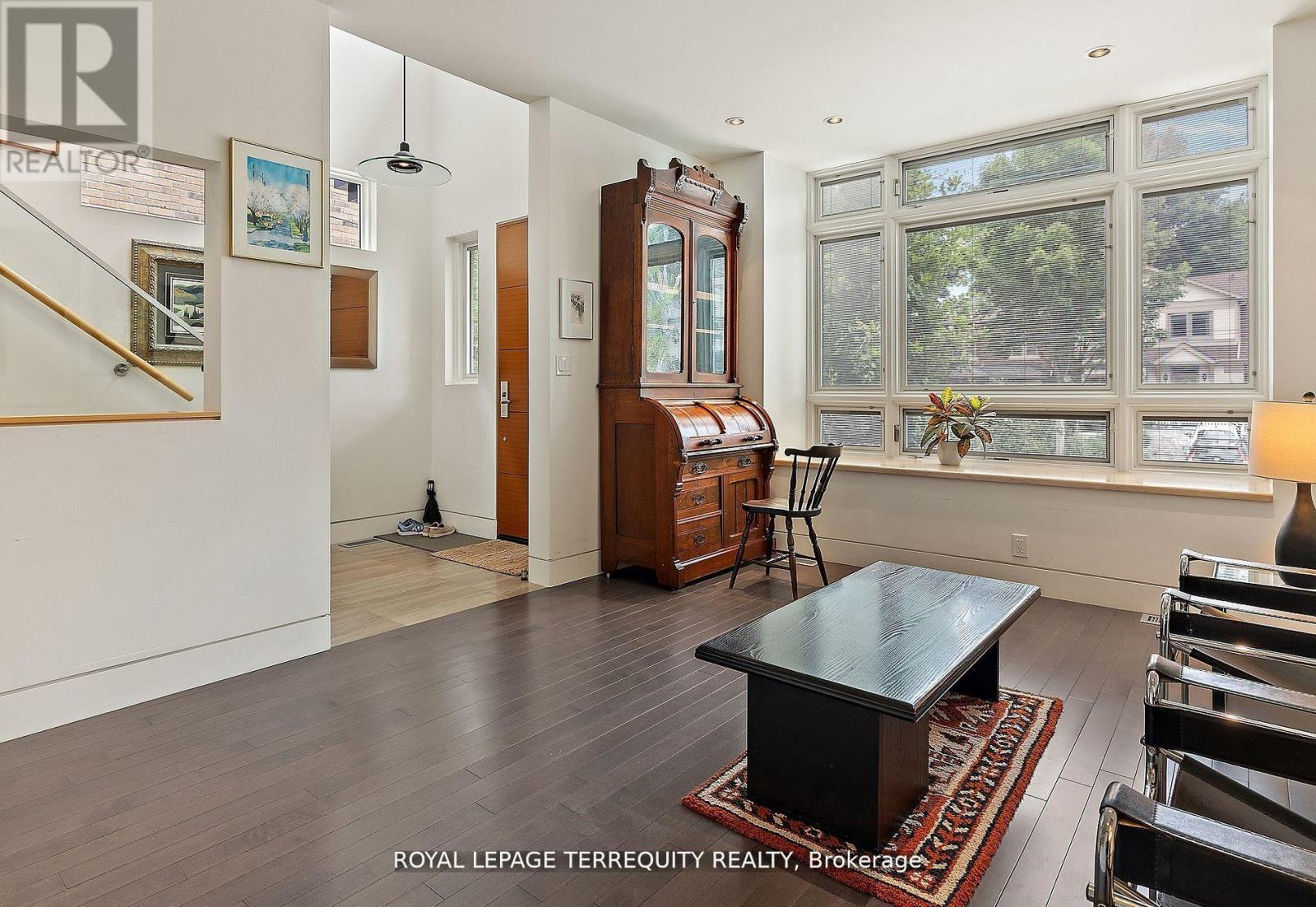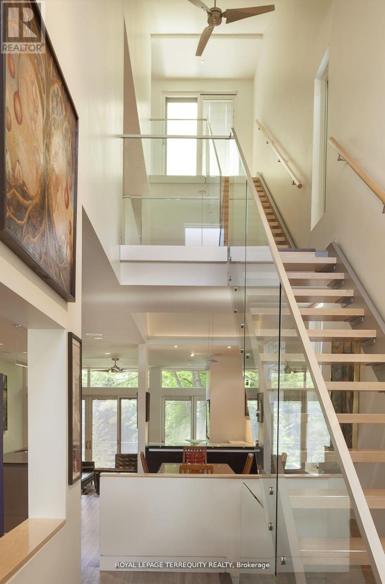 Outstanding architect-designed-and-built home on 4 levels includes a central atrium and an airy 3rd floor Primary suite with 2 decks, a sitting room, skylights, built-ins and a 6-piece bathroom with heated floors. The open floor plan is flooded with natural light and the Pella windows are equipped with built-in blinds. Stainless steel ceiling fans in the high ceilings complement the contemporary design of the floating staircases and the functionality of the dual HVAC. The second floor boasts a unique workstation/storage unit with generous cupboards and a large countertop overlooking the dining room and its glass block feature, as well as the laundry room, 3 bedrooms and 2 full bathrooms, one of them ensuite. The Binns' galley kitchen and dining room overlook the main floor family room with its wood burning fireplace and walk-out to the deep wooded lot. The recreation room or 5th bedroom also has a walk-out to the garden as well as a 3-piece bathroom. There is direct access to the garage and a separate front entrance on this floor. Located on a quiet, neighbourly, dead-end street in an eminently walkable area, there are three parking spaces. Magnificent Home. Motivated seller. (id:64974)