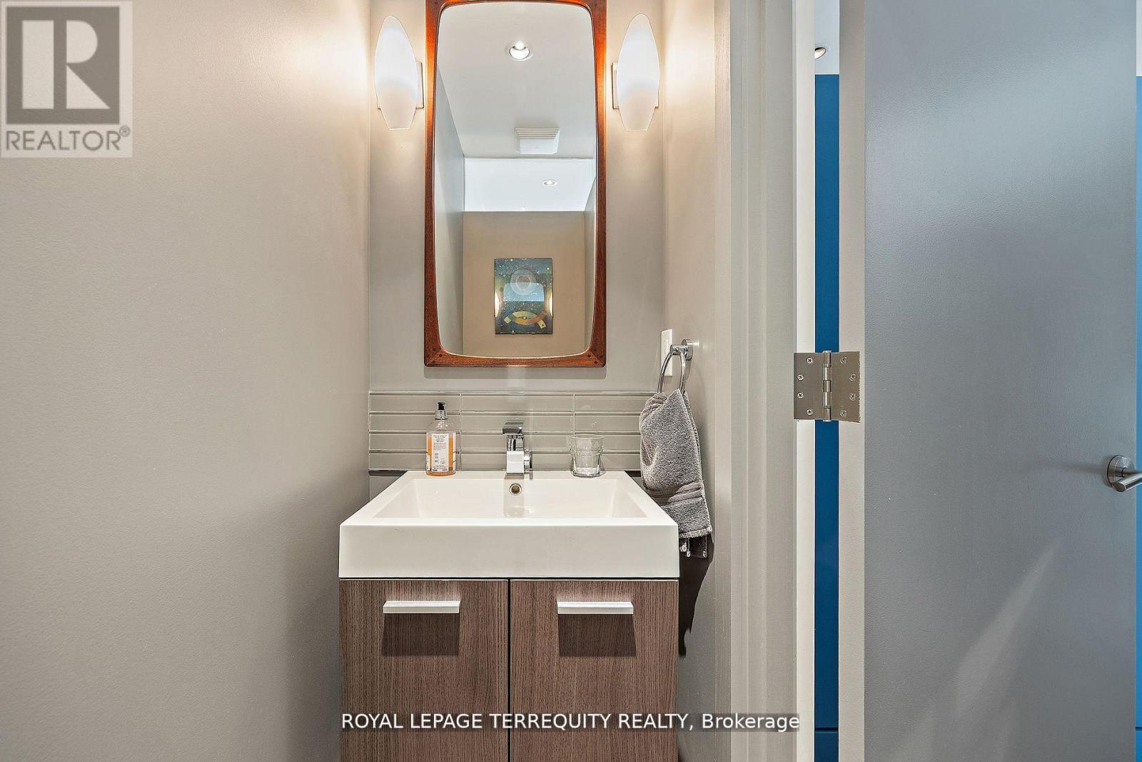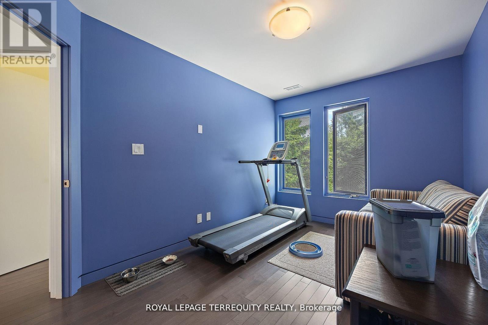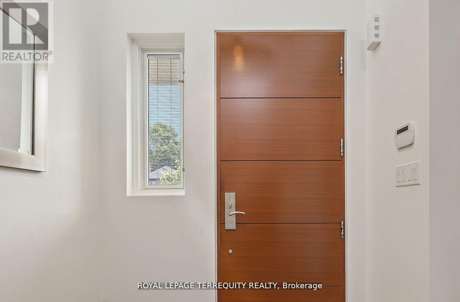 Outstanding architect-designed-and-built home on 4 levels includes a central atrium and an airy 3rd floor Primary suite with 2 decks, a sitting room, skylights, built-ins and a 6-piece bathroom with heated floors. The open floor plan is flooded with natural light and the Pella windows are equipped with built-in blinds. Stainless steel ceiling fans in the high ceilings complement the contemporary design of the floating staircases and the functionality of the dual HVAC. The second floor boasts a unique workstation/storage unit with generous cupboards and a large countertop overlooking the dining room and its glass block feature, as well as the laundry room, 3 bedrooms and 2 full bathrooms, one of them ensuite. The Binns' galley kitchen and dining room overlook the main floor family room with its wood burning fireplace and walk-out to the deep wooded lot. The recreation room or 5th bedroom also has a walk-out to the garden as well as a 3-piece bathroom. There is direct access to the garage and a separate front entrance on this floor. Located on a quiet, neighbourly, dead-end street in an eminently walkable area, there are three parking spaces. Magnificent Home. Motivated seller. (id:64974)