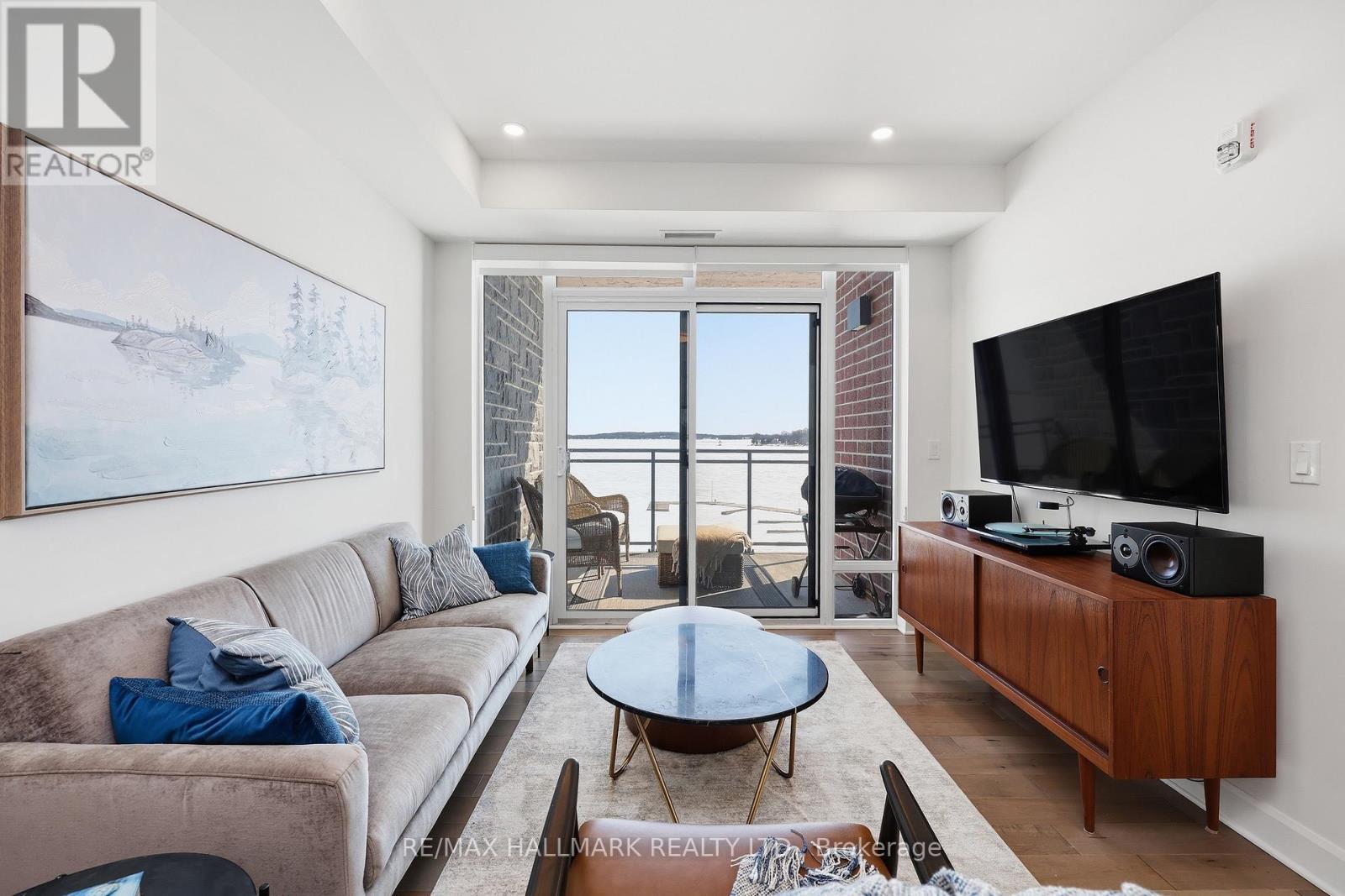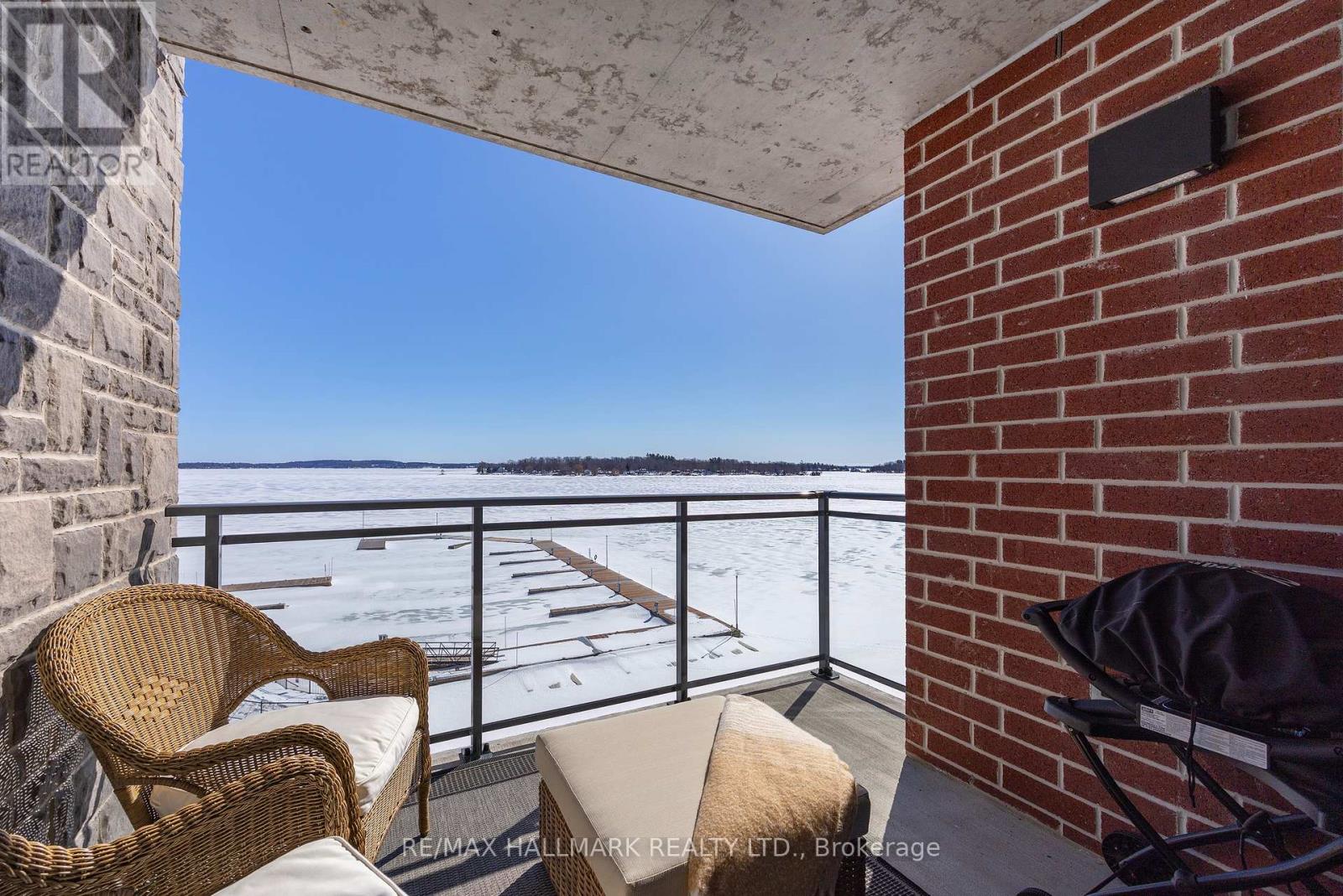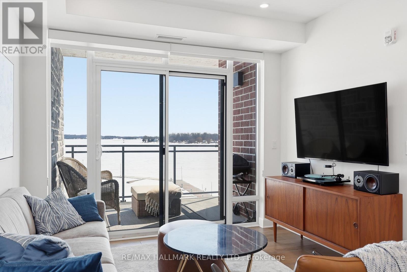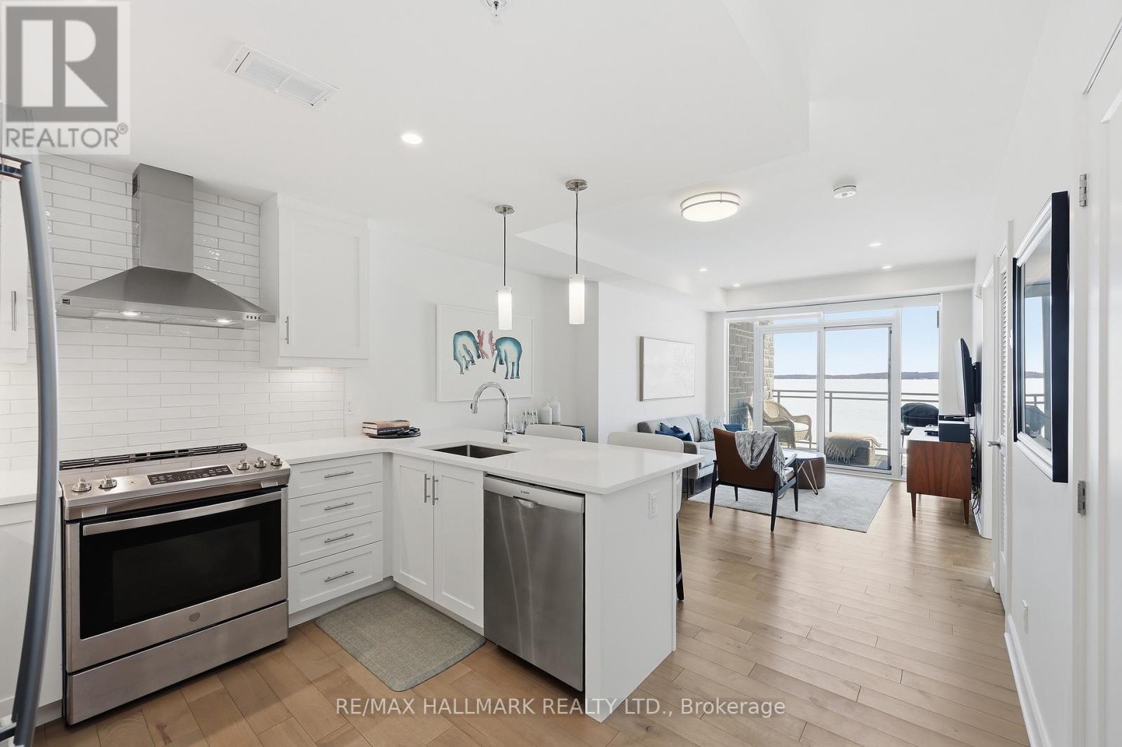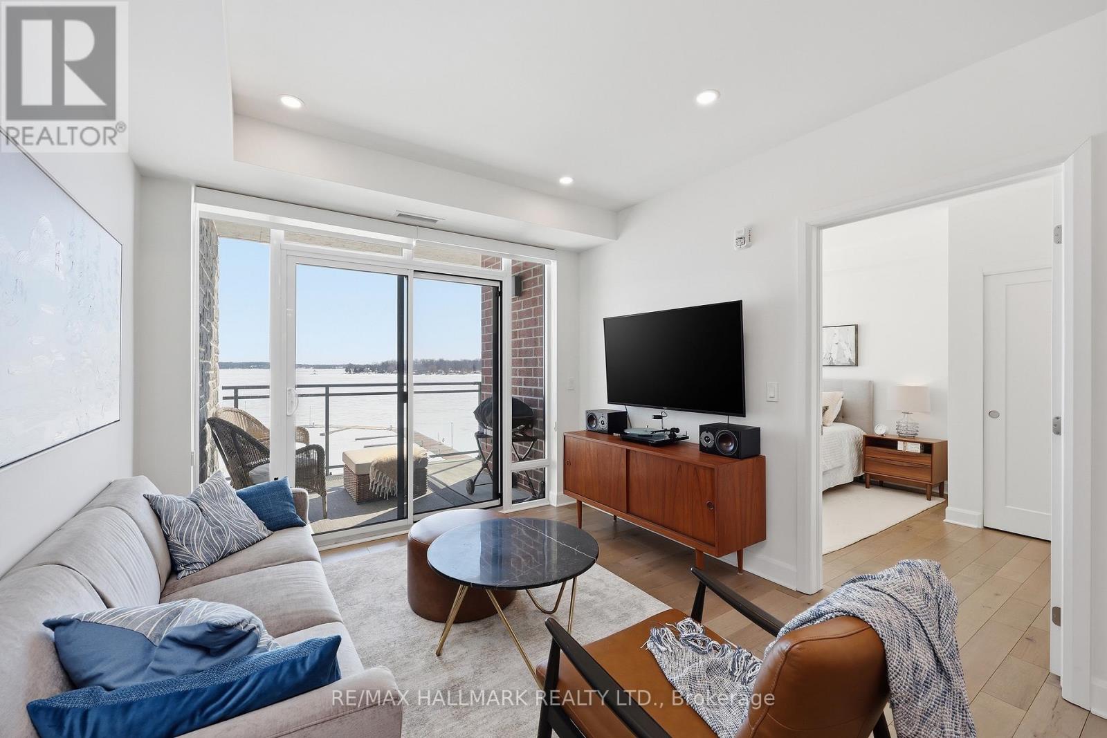 Modern 1000 Islands Lifestyle ~ water, trees & wildlife. Come & experience Stone & South on the St. Lawrence River. Designed for an active, easygoing lifestyle, this 1-bedroom + den offers a comfortable & convenient waterfront retreat. Features include; smooth ceilings, hardwood floors, quartz counters, and well-proportioned rooms filled with abundant natural light. The practical 802 sq ft layout includes a private balcony with unobstructed southwest water views, while the flexible den space adapts easily as a home office, a dedicated dining area, or a cozy guest room. Convenient underground parking with easy access to a large format storage locker. Built by CaraCo & designed by Chamberlain Architect in 2021, the building amenities include; fitness centre, party room, visitor parking, BBQ patio, and marina access. Efficient central heating & A/C energy incl. in maintenance fee. The 1000 Islands diverse & welcoming community that offers boating, golf, kayaking, swimming, fishing, hiking & so much more! Set in the historic town of Gananoque & steps from Thousand Islands Playhouse. Enjoy community events, walkable shops, pubs, dining, and outdoor sight-seeing. And for those that need a bigger city fix, historic Kingston is only 25 mins away, while Toronto, Ottawa & Montreal are a reasonable cottage drive. Life is better in the Islands! (id:64974)