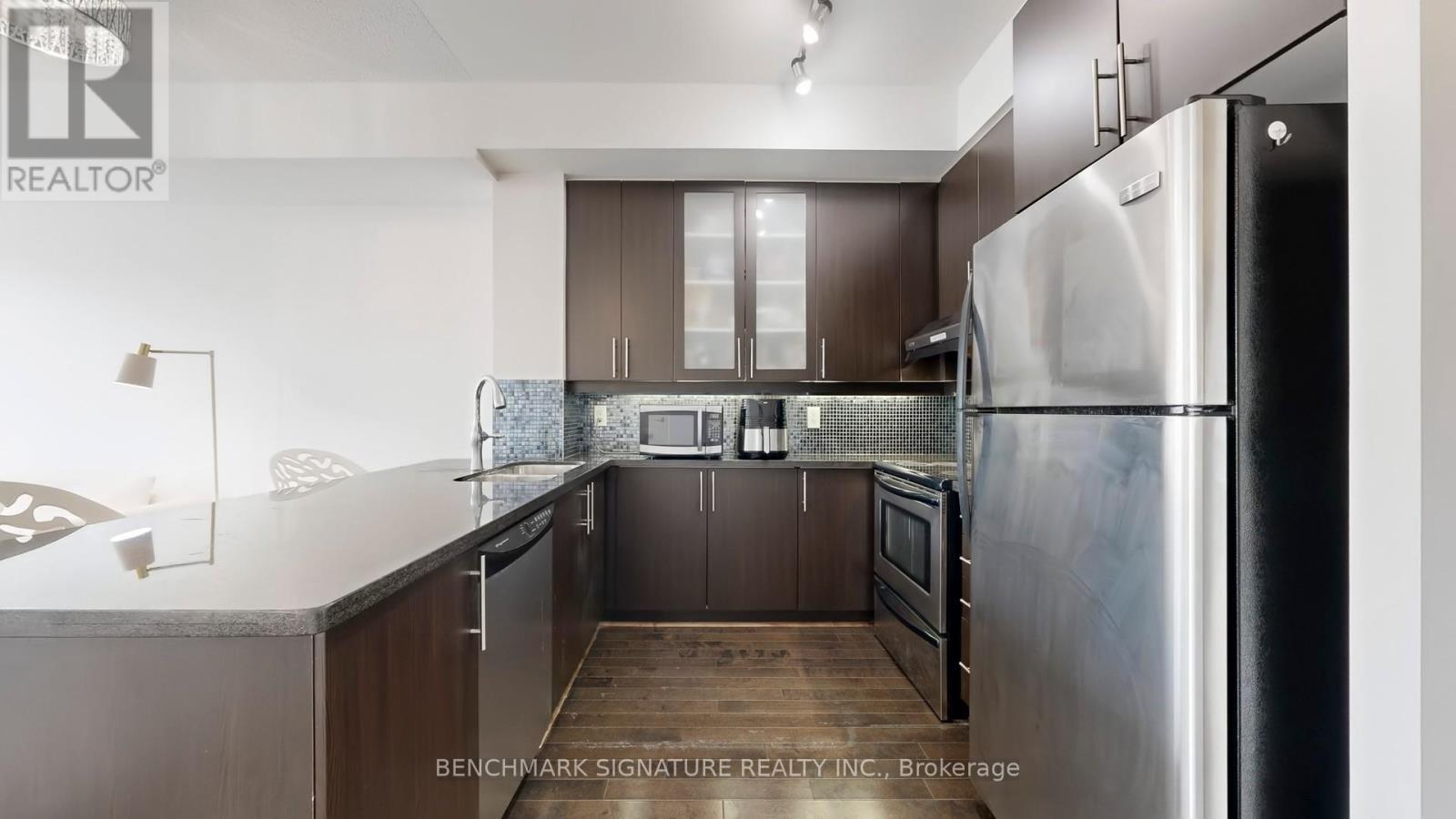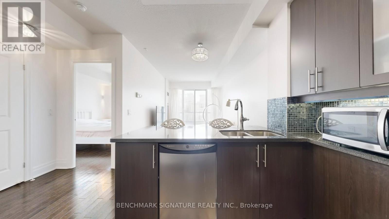 Welcome to Rouge Bijou Promenade in the heart of Downtown Markham! This functional 1+Den layout features soaring 9ft ceilings and a bright north exposure. The spacious den is enclosed with a French door, making it a perfect private home office or guest room. Open-concept kitchen with granite counters, stainless steel appliances, and a functional breakfast bar. Steps to Cineplex, VIP Cinemas, top-tier dining, and the York University Markham campus. Minutes to Unionville GO, Viva, and Hwy 407/404. Includes 1 parking and 1 locker. Well-managed building with premium amenities: 24hr concierge, fully-equipped gym, golf simulator, theatre, and guest suites. Perfect for first-time buyers or investors. Move-in ready (id:64974)